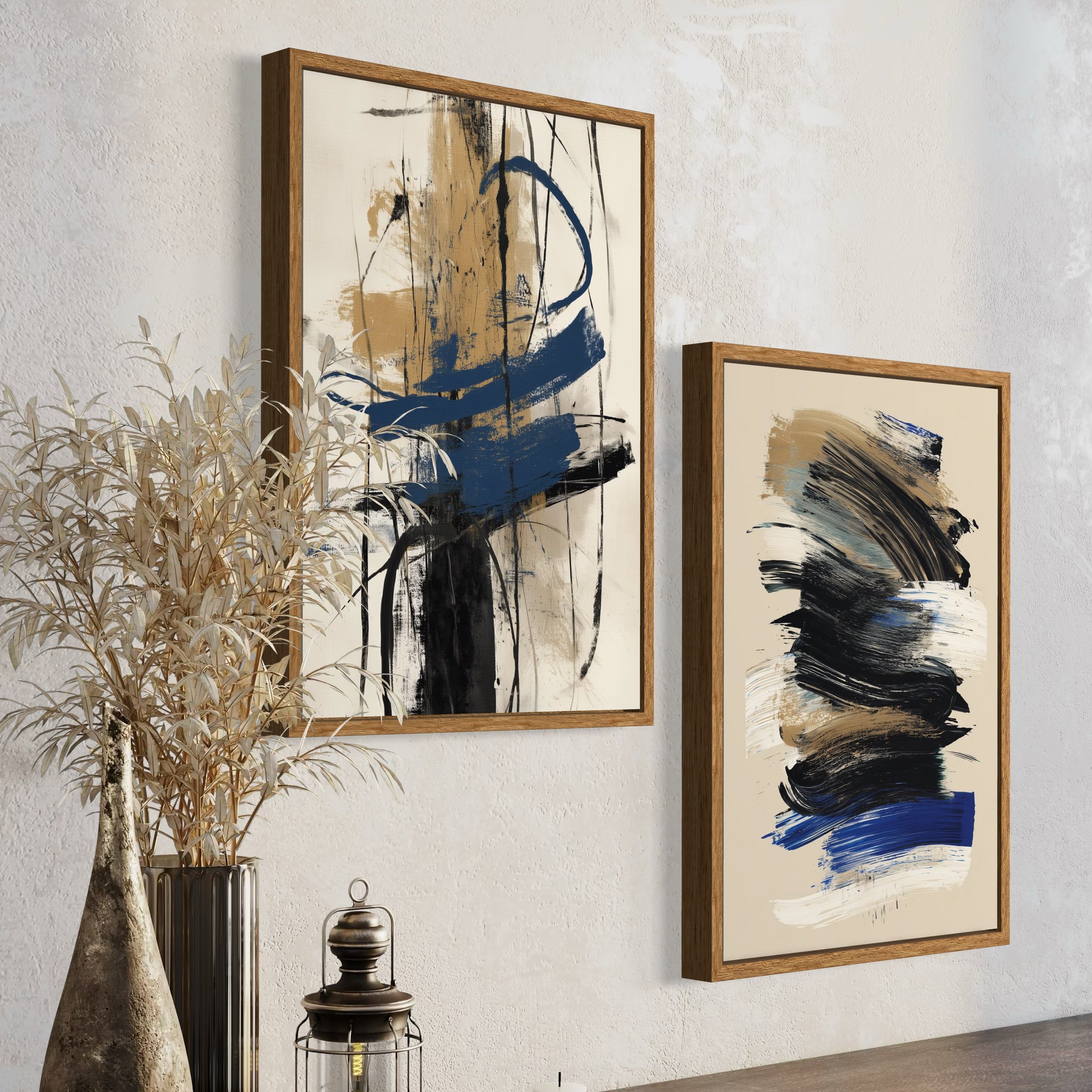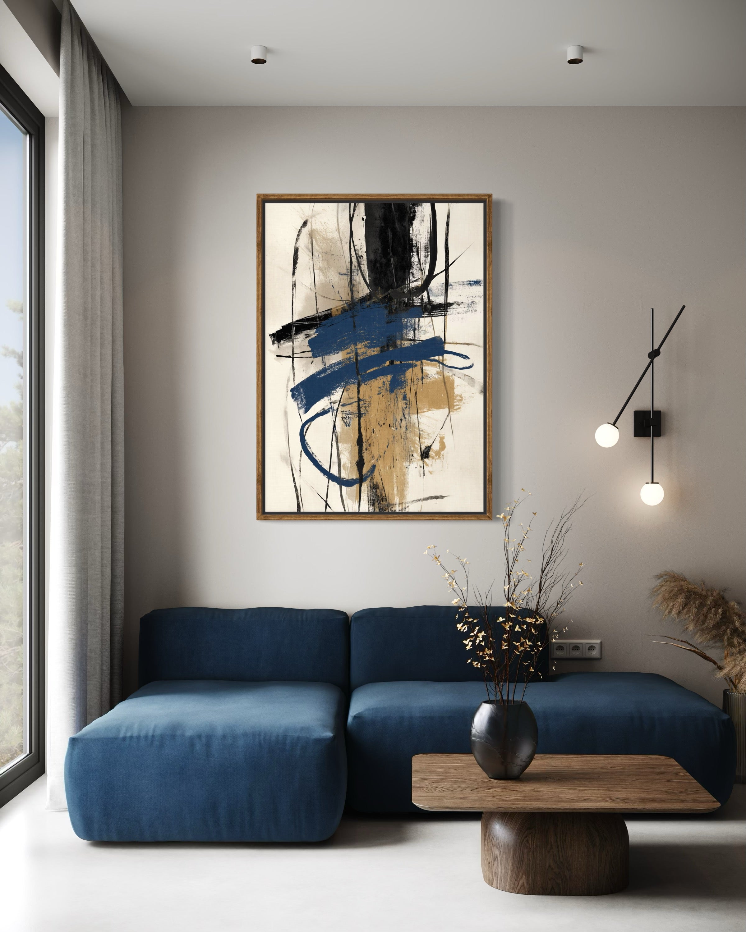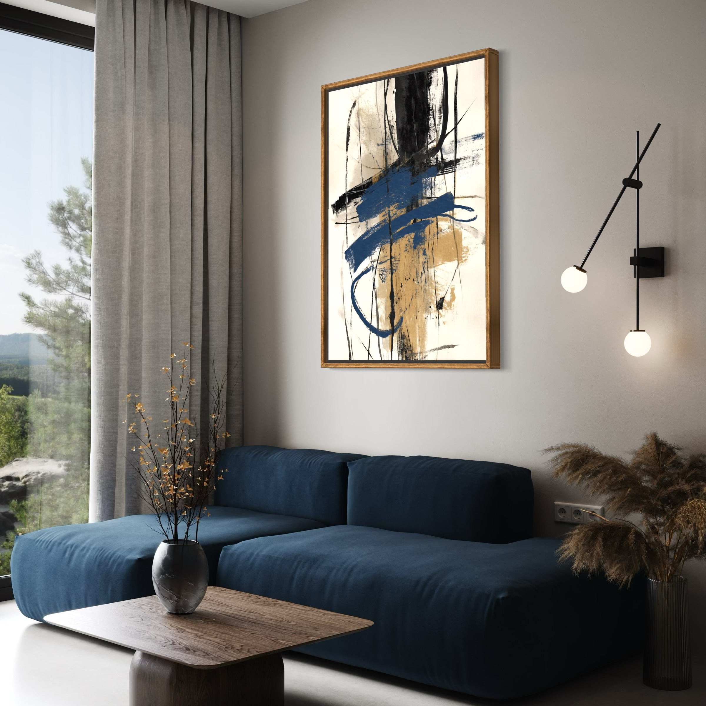 Bold, expressive strokes of deep navy and black move across warm tan textures in this striking abstract composition. Midnight Rhythm captures the energy of movement and spontaneity, with dynamic lines and textured layers evoking both chaos and control. Perfect for modern interiors, this piece adds depth, contrast, and artistic confidence to any wall. Ideal for living rooms, offices, or creative spaces seeking a contemporary edge.