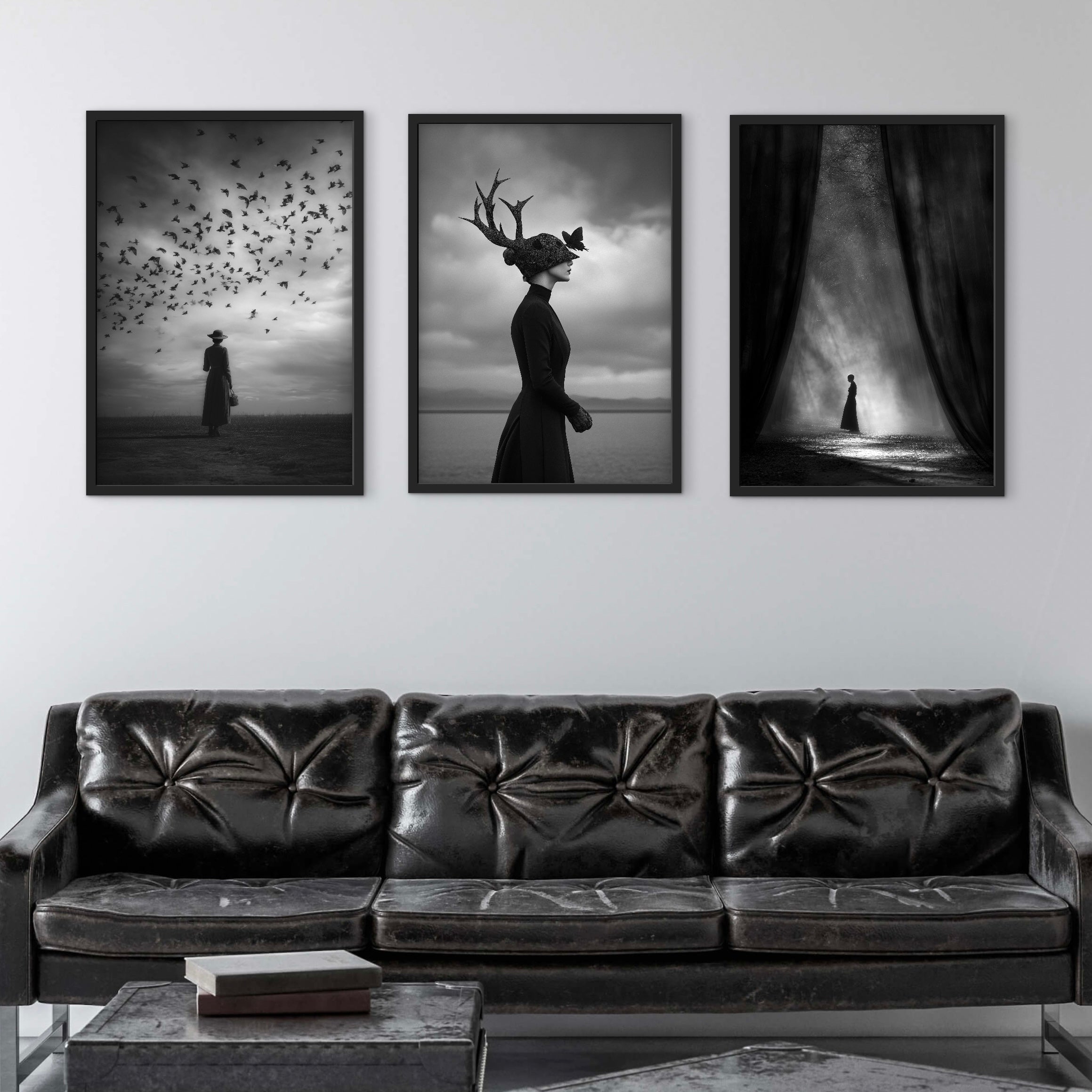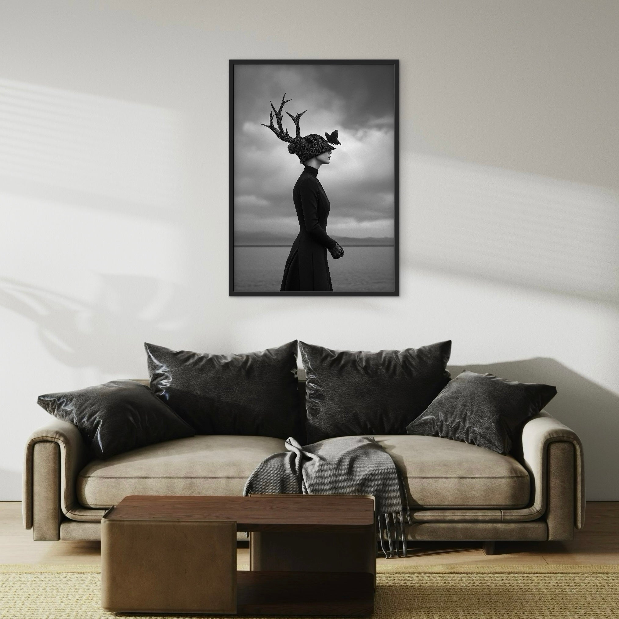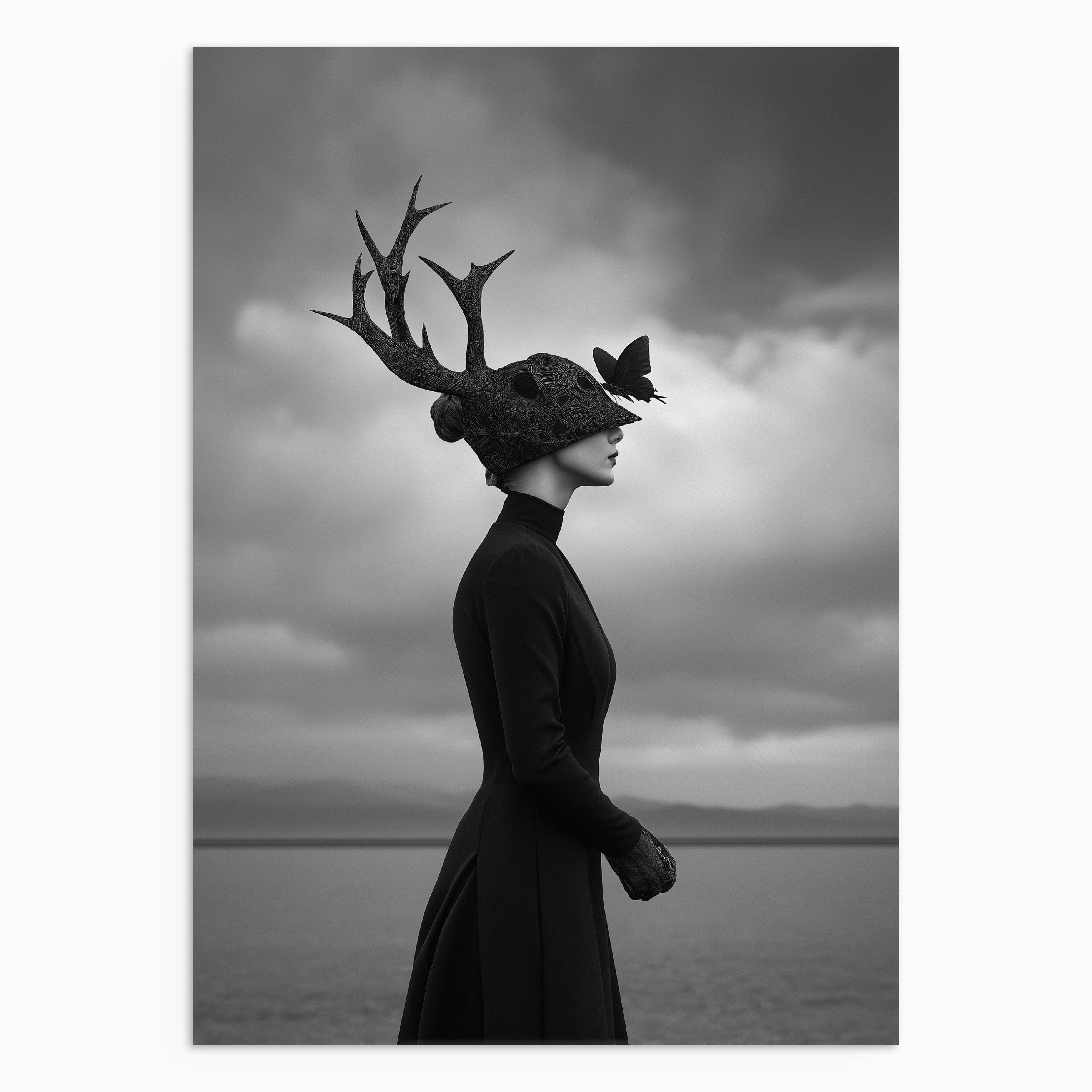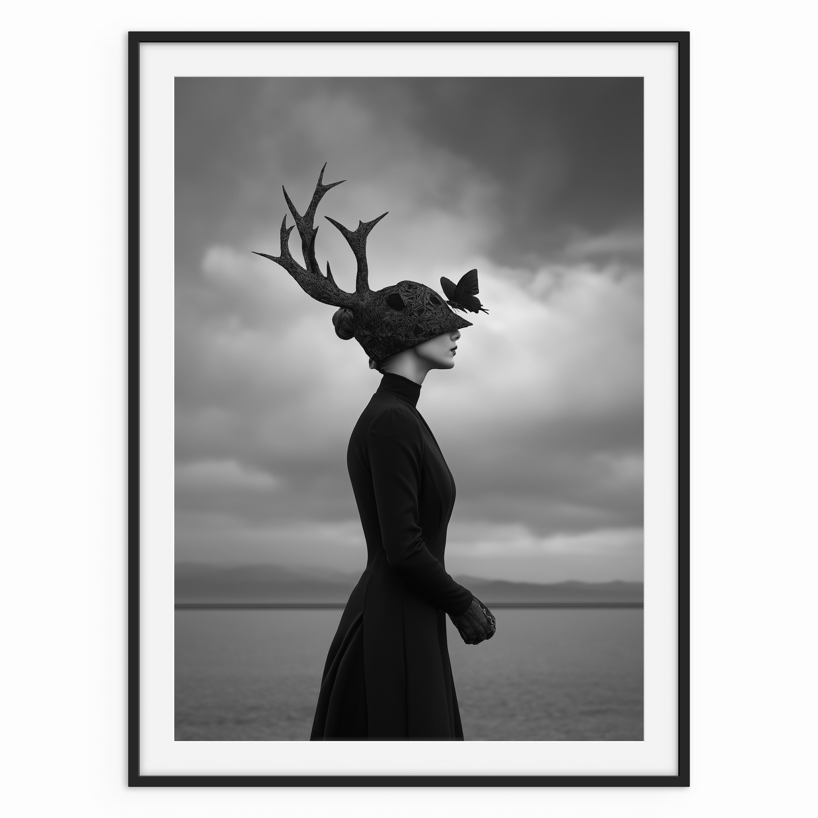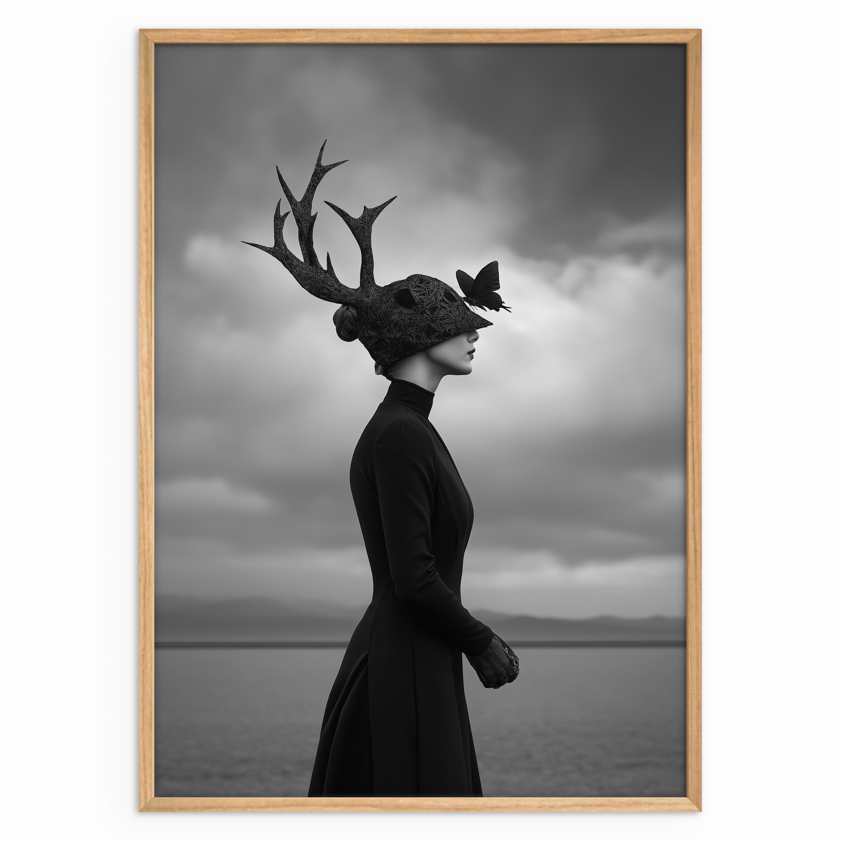 A profile portrait of a figure wearing an organic, sculptural headpiece, with a butterfly resting gently at its edge. The composition explores transformation and pause, capturing a moment suspended between states. Best suited to gallery-style interiors and curated wall collections.