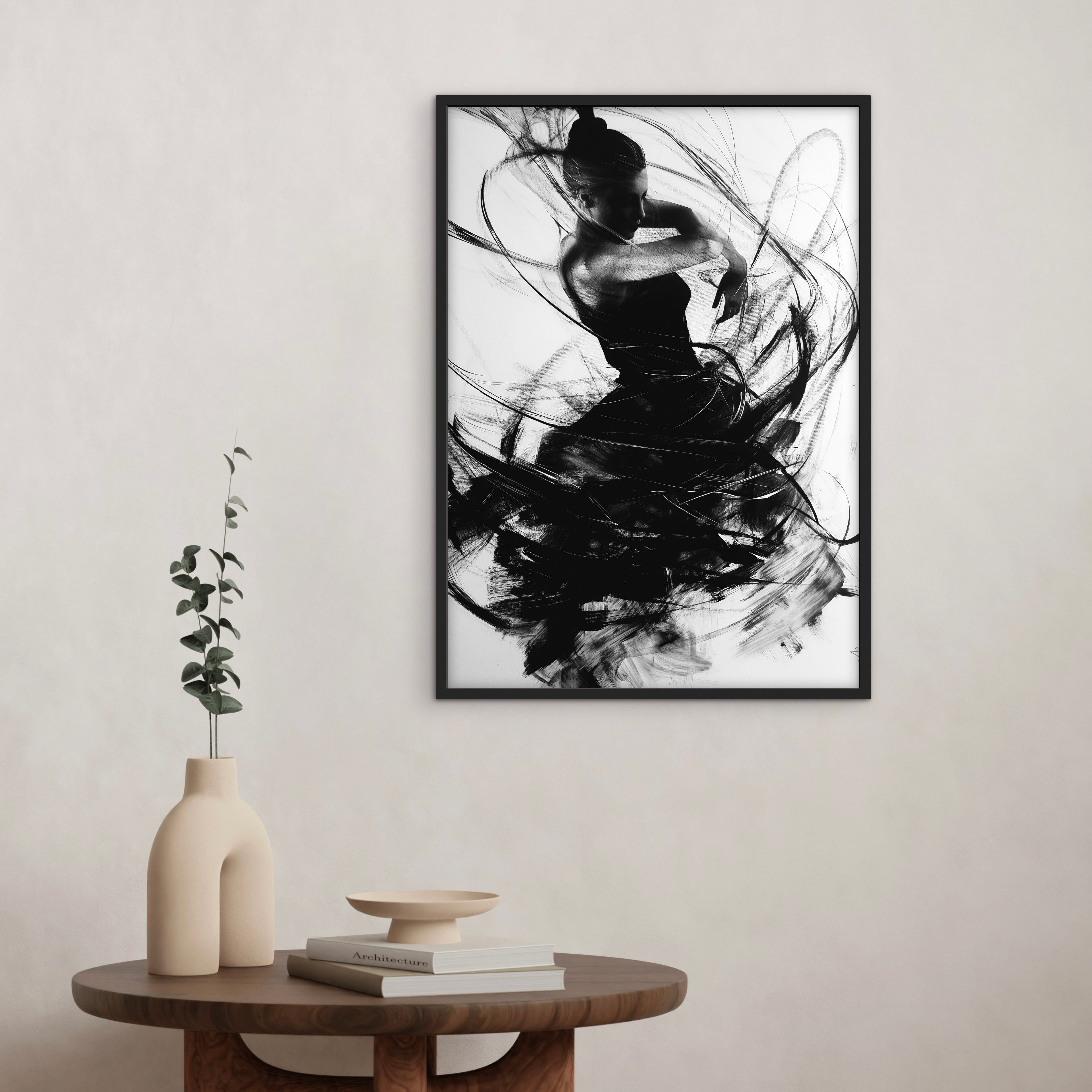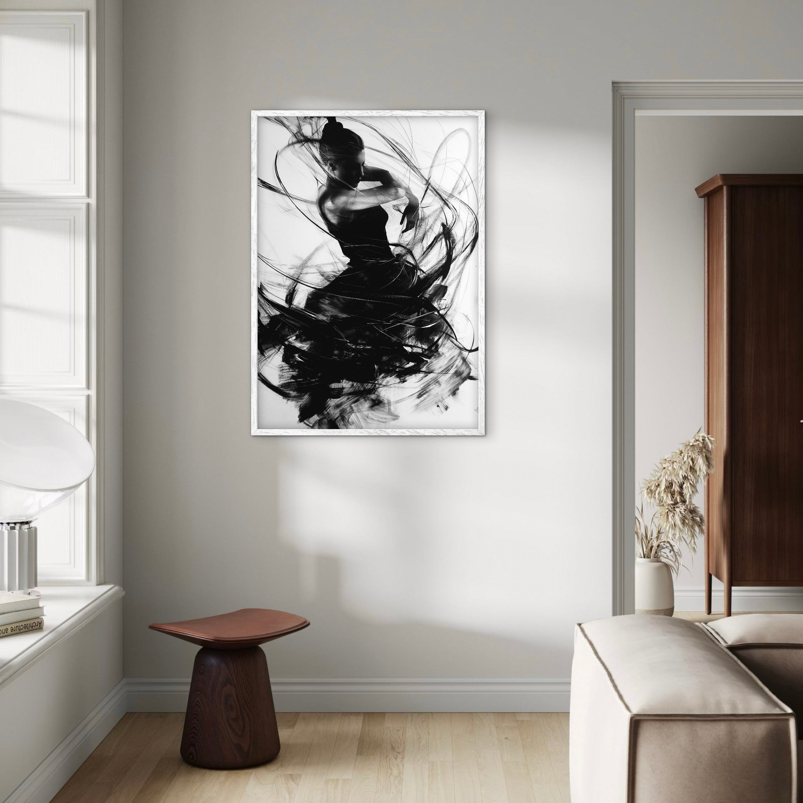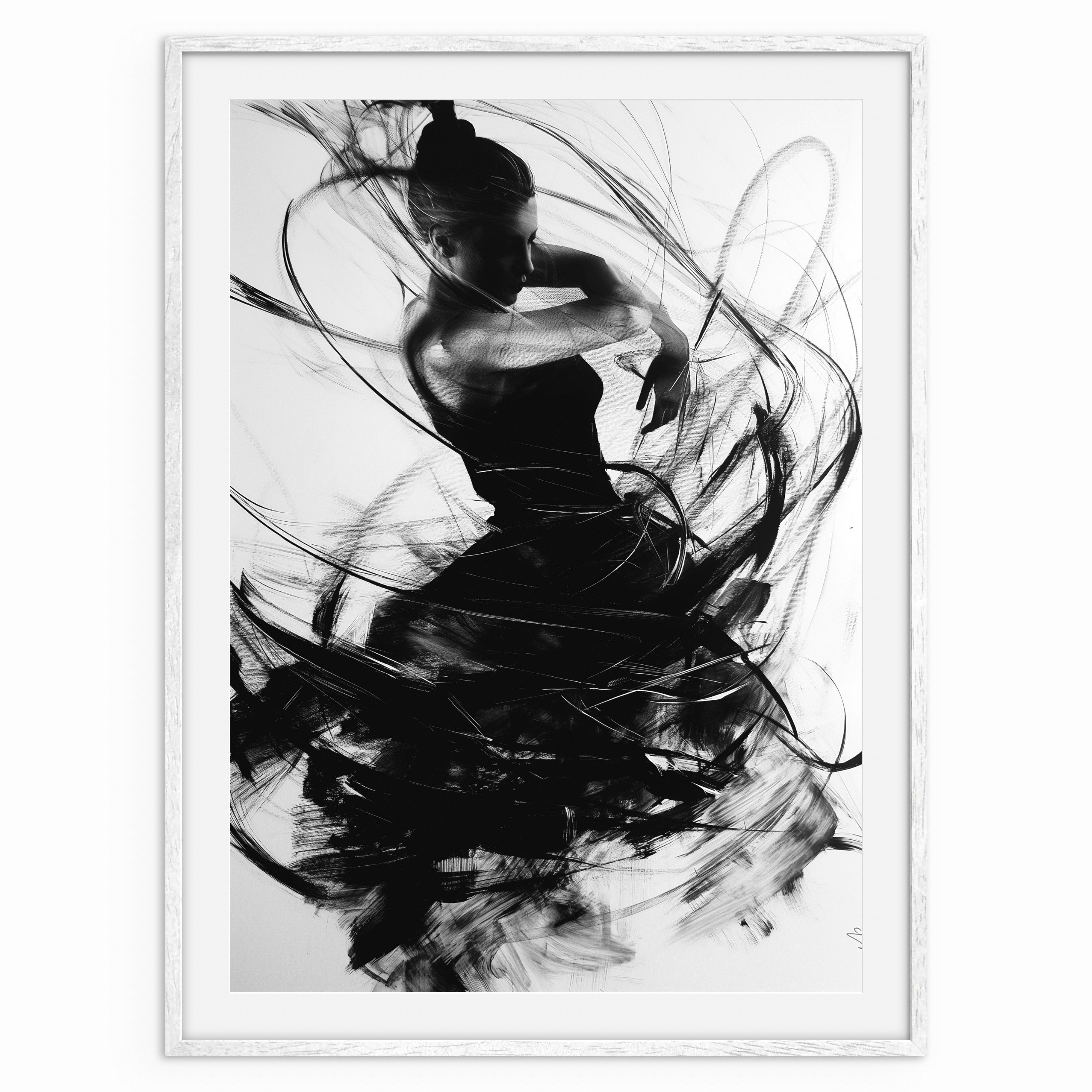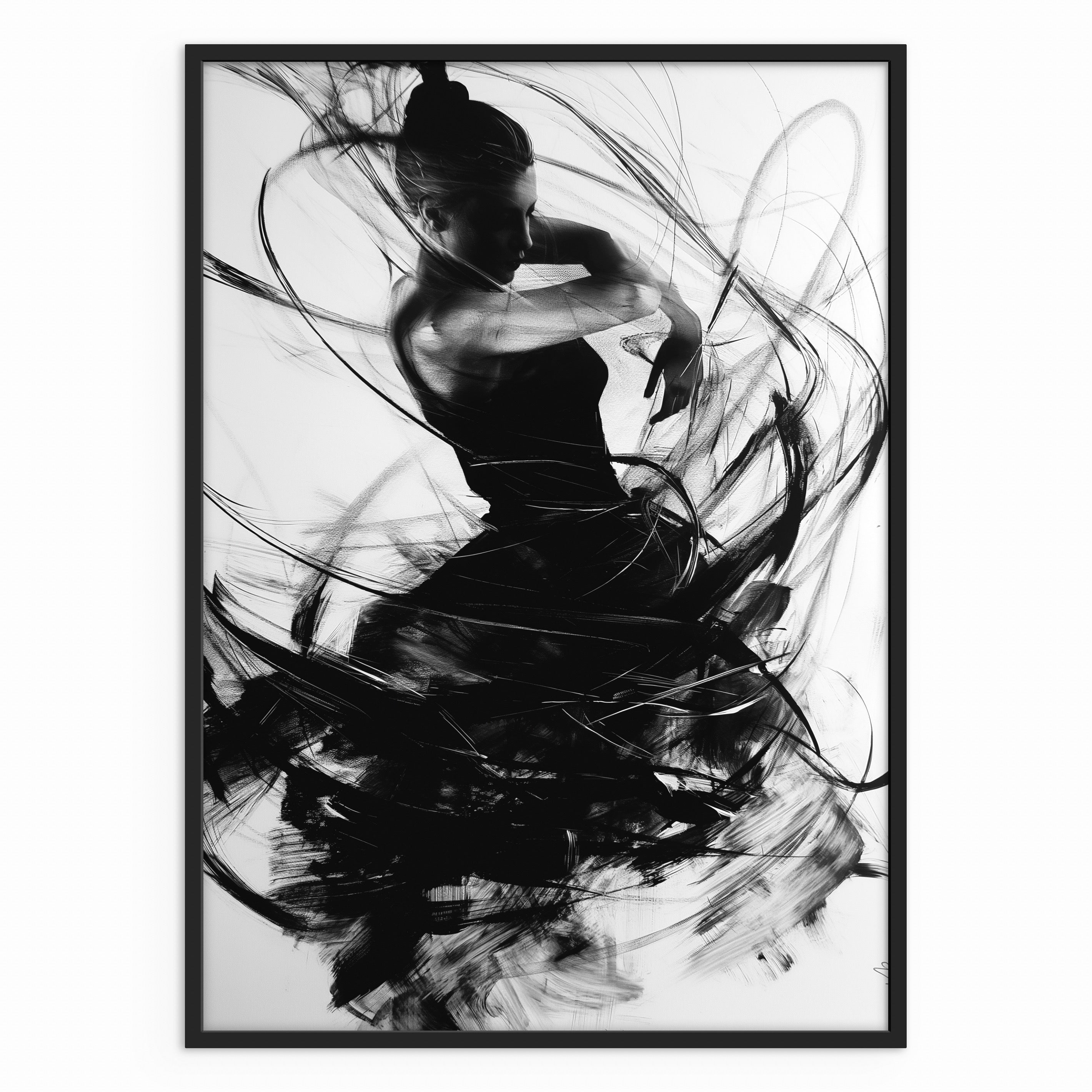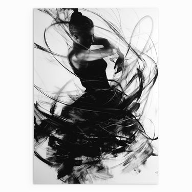 A monochrome figure caught in a moment of transition, with flowing lines wrapping around the body like residual motion. The contrast between sharp form and soft edges creates a balanced sense of pause within movement. Ideal for gallery-style walls and modern interiors.