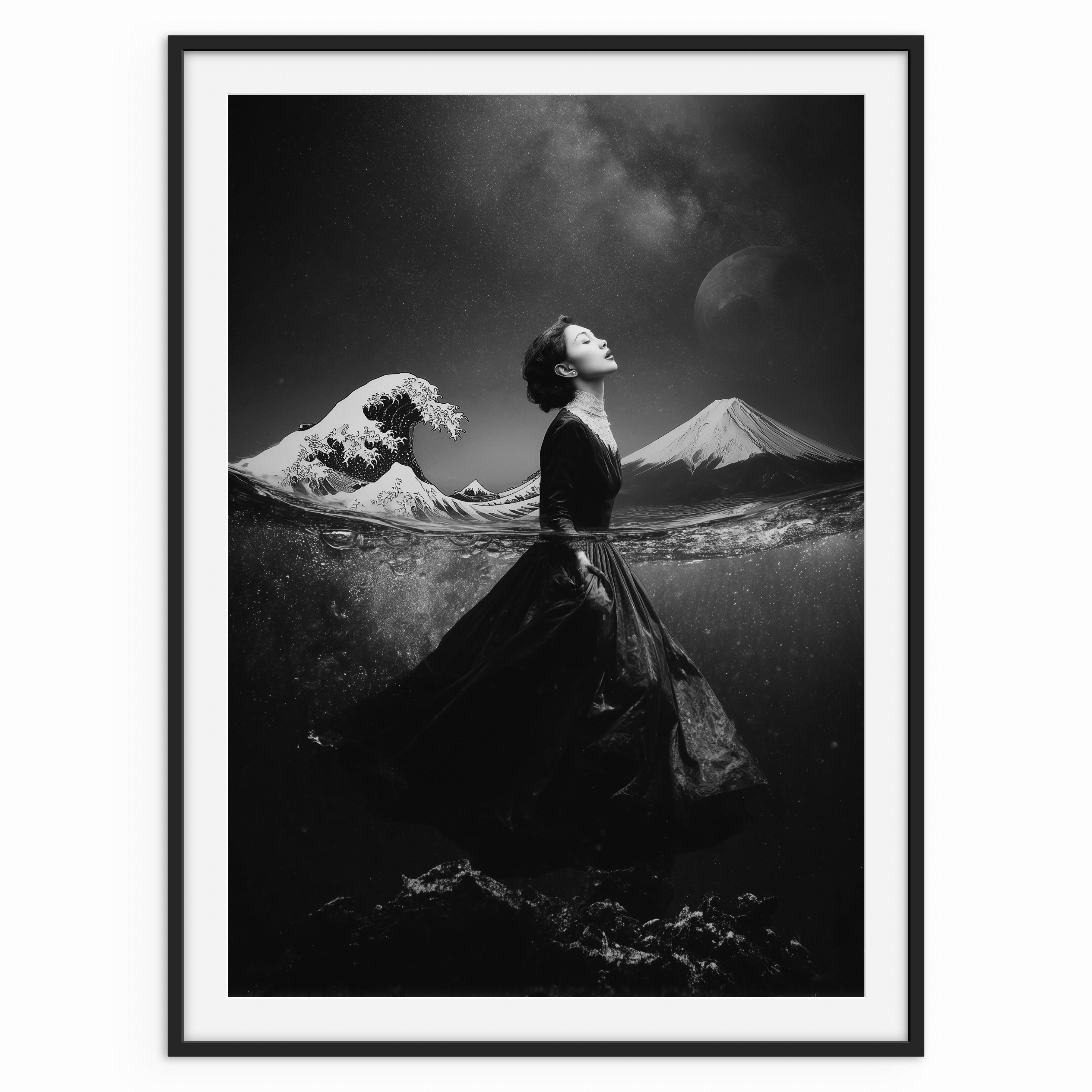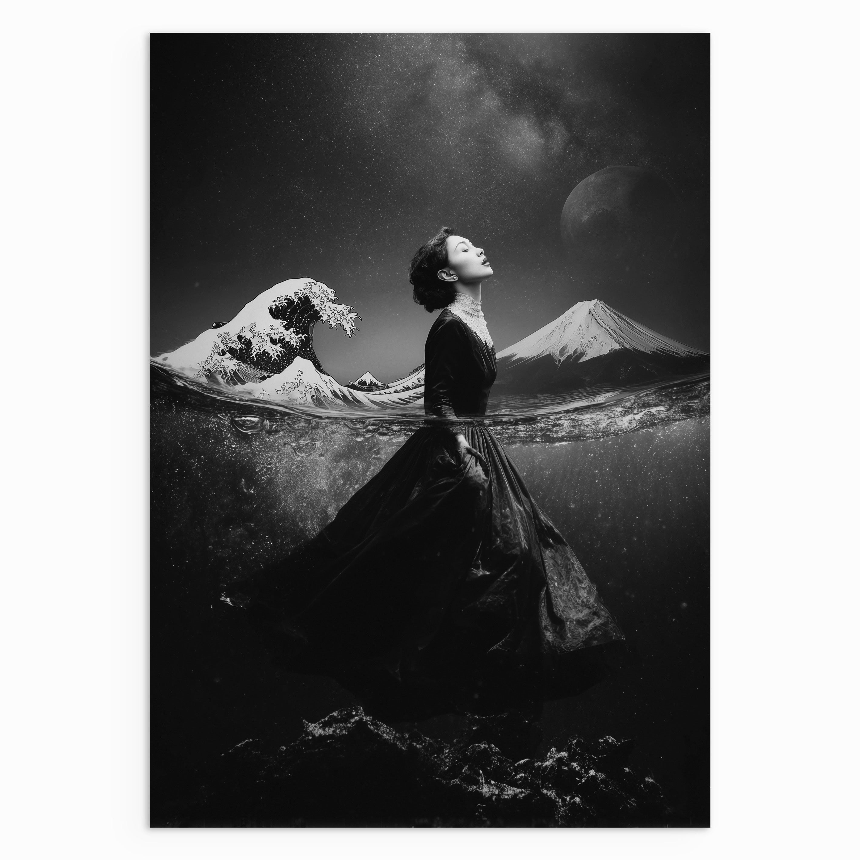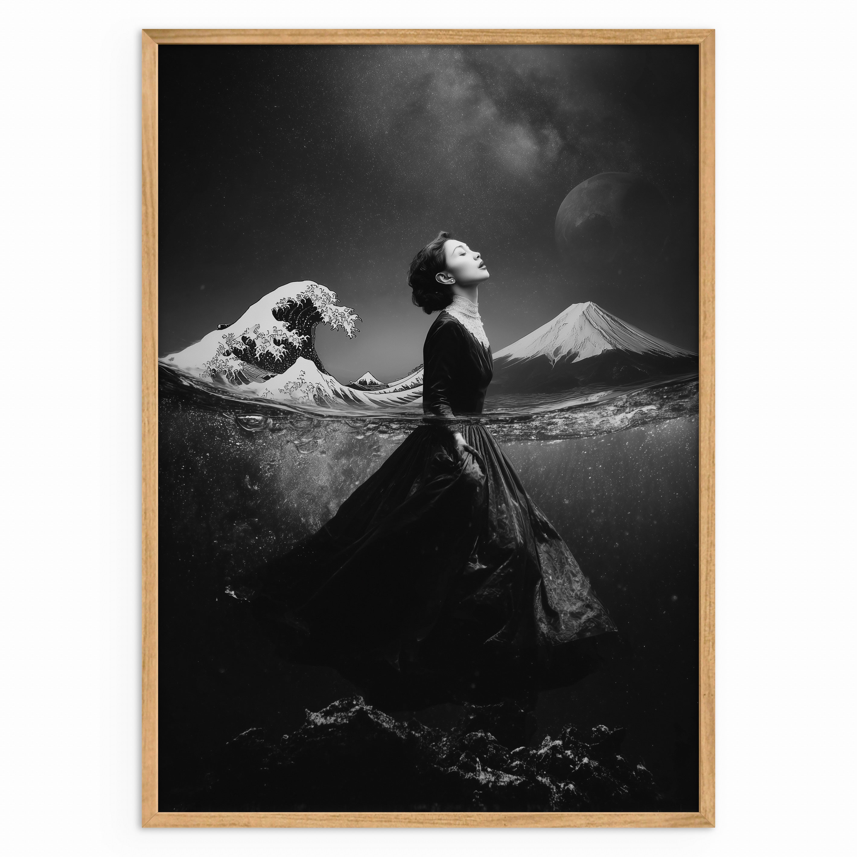A monochrome portrait of a woman standing on a shoreline as her form breaks apart into a flock of birds. The reflection beneath her mirrors the transformation, emphasising themes of change and release. A powerful yet restrained piece suited to modern interiors.
