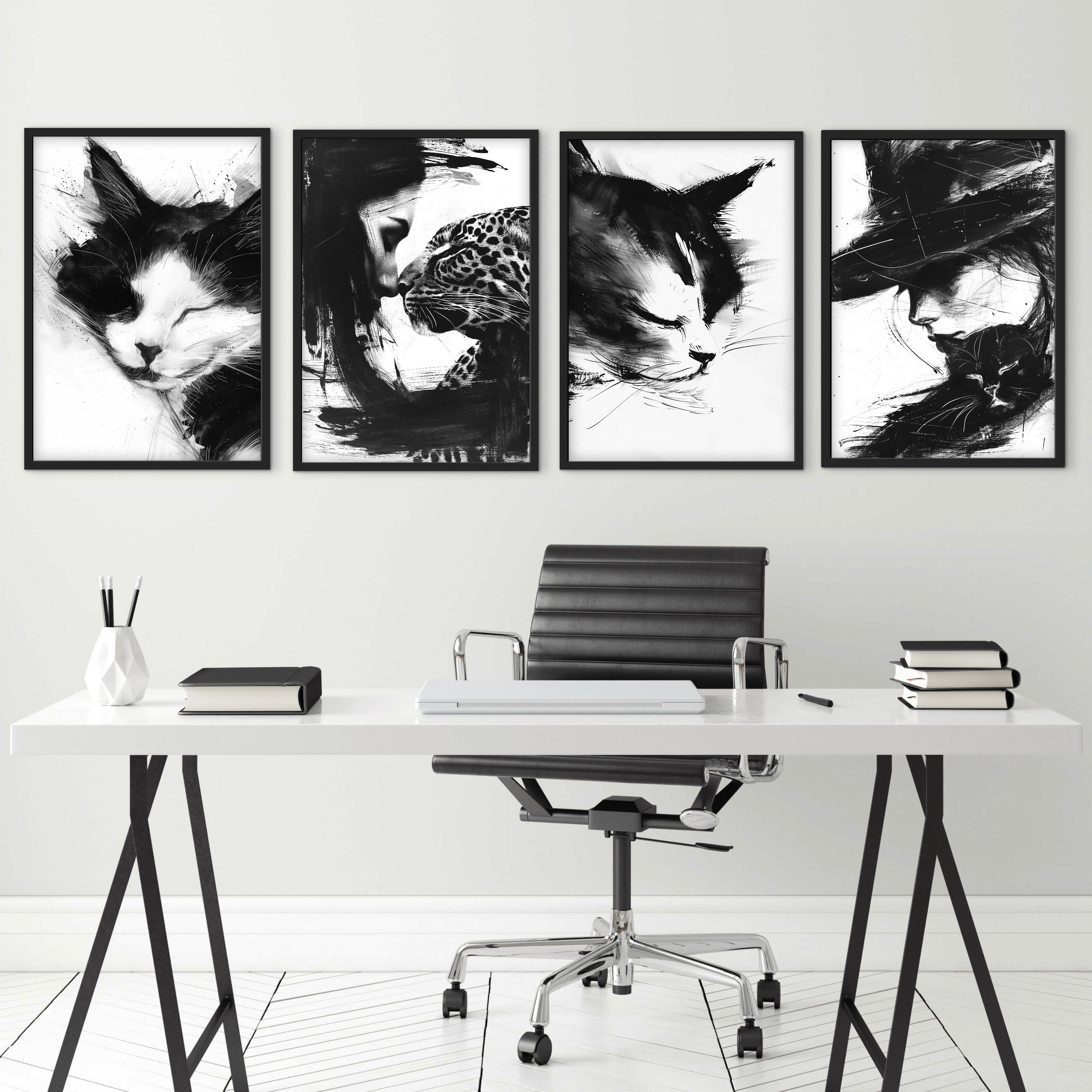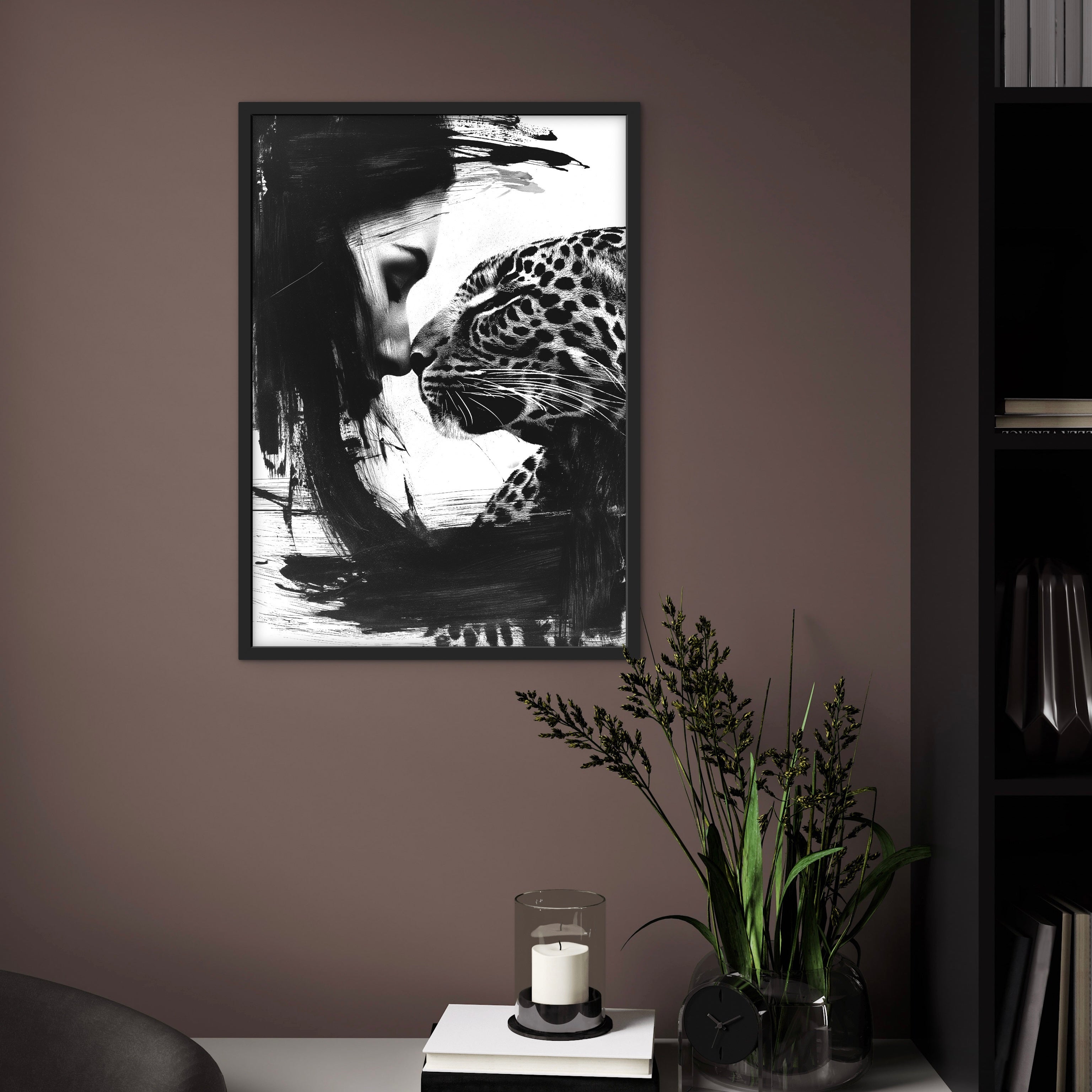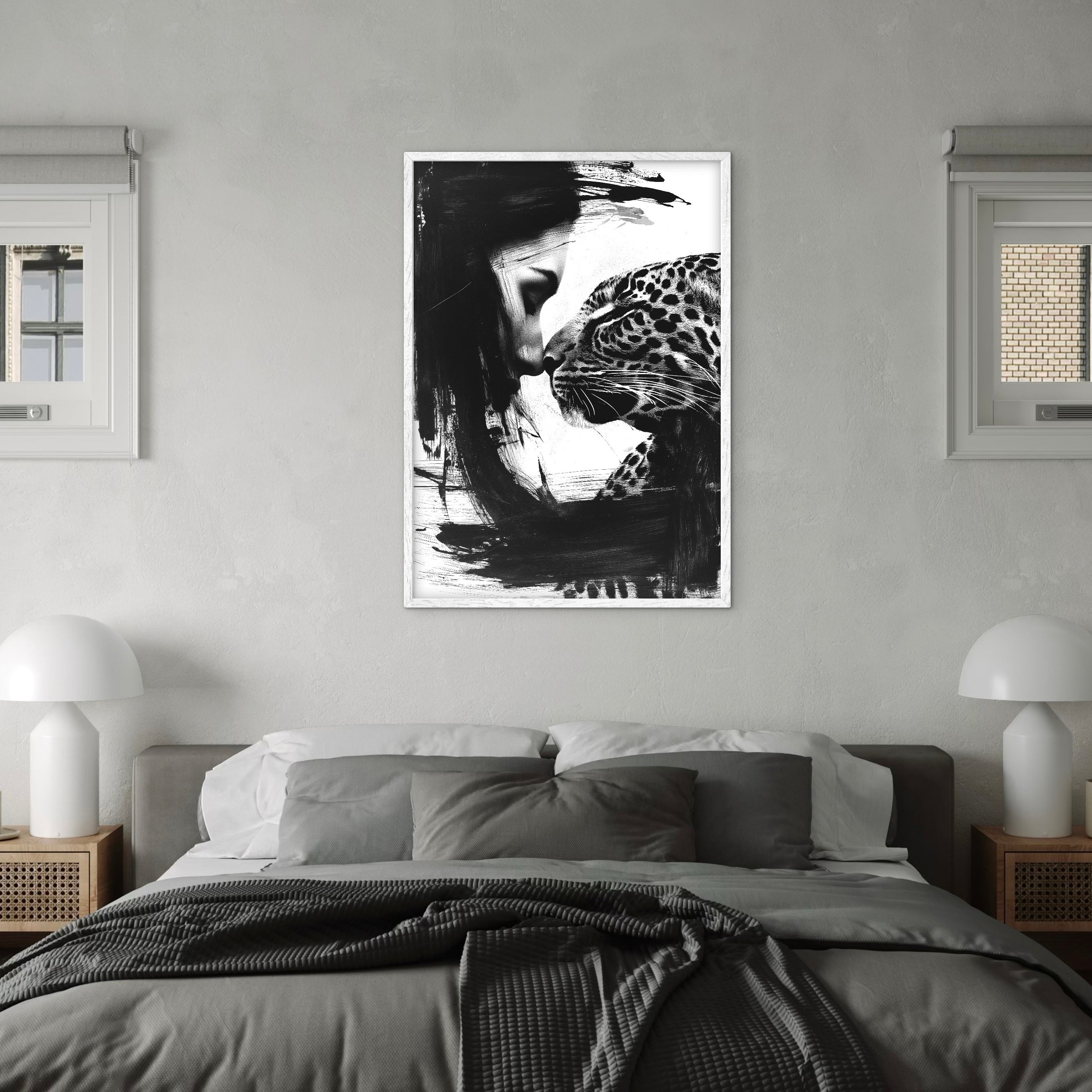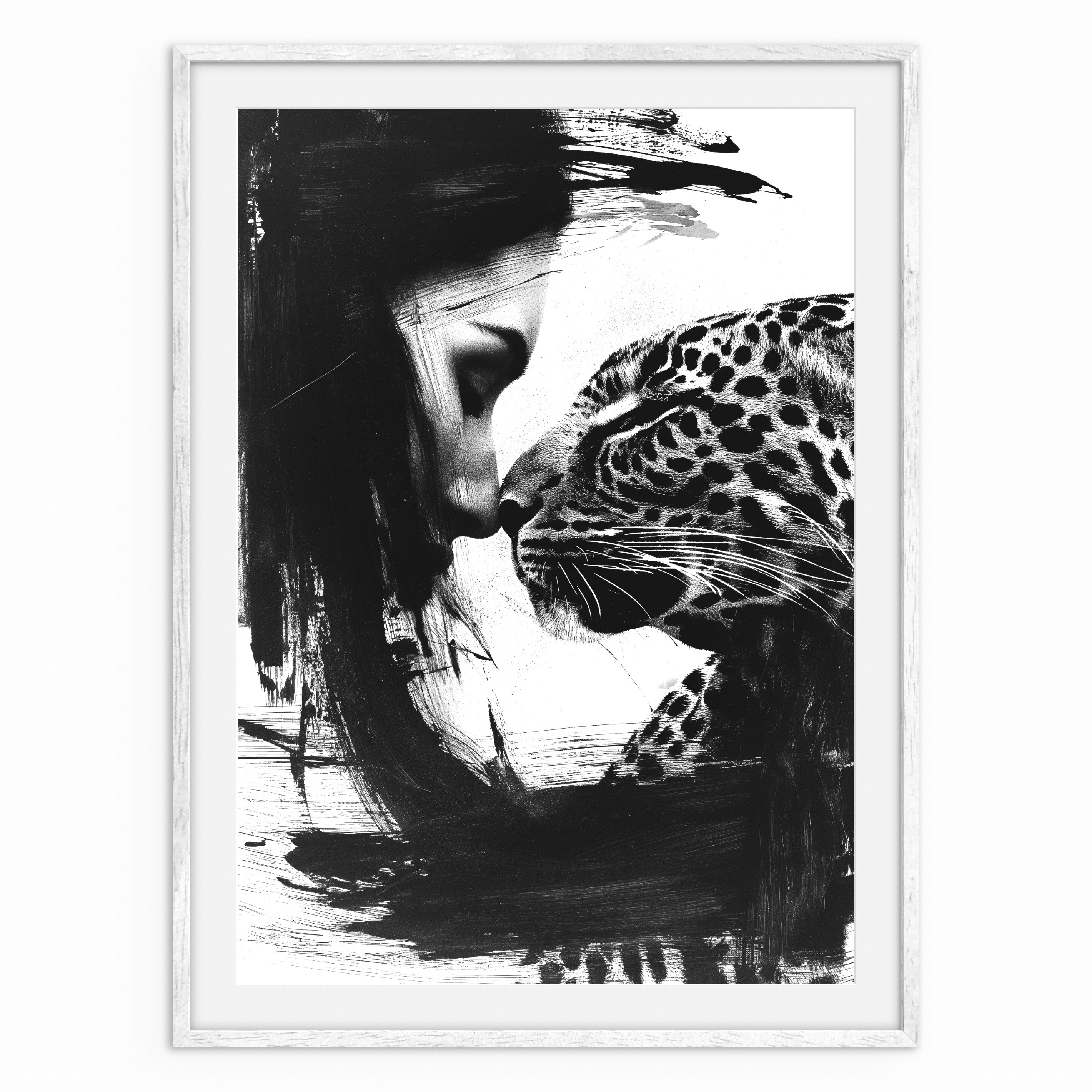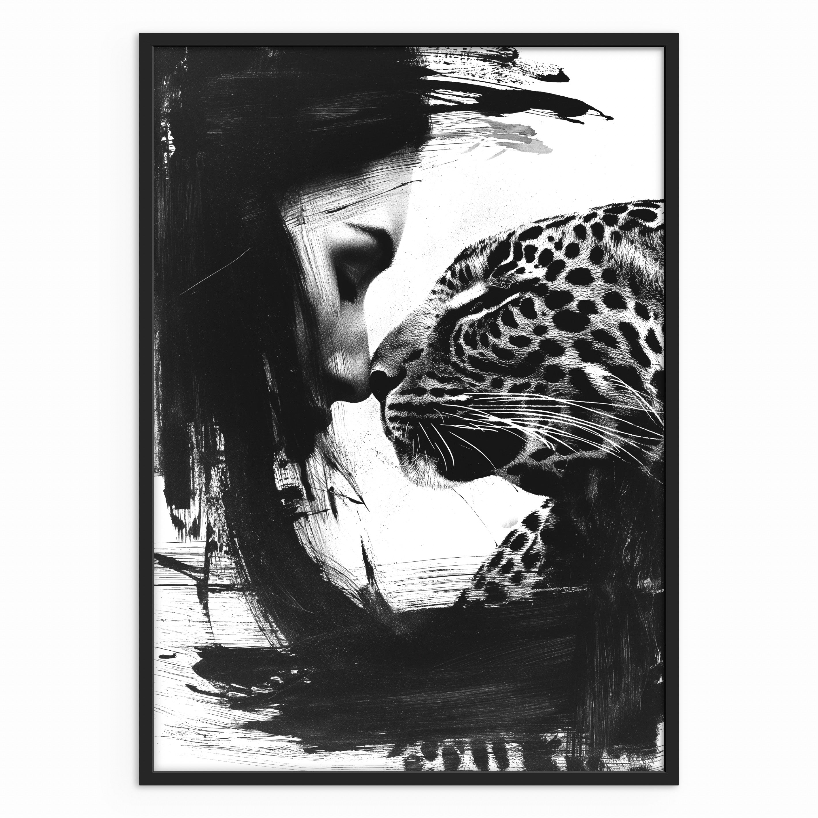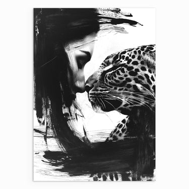 A monochrome portrait showing a woman and a leopard in close contact, their faces meeting gently. Strong brush textures contrast with detailed features, creating intimacy without sentimentality. A striking piece for modern and curated interiors.