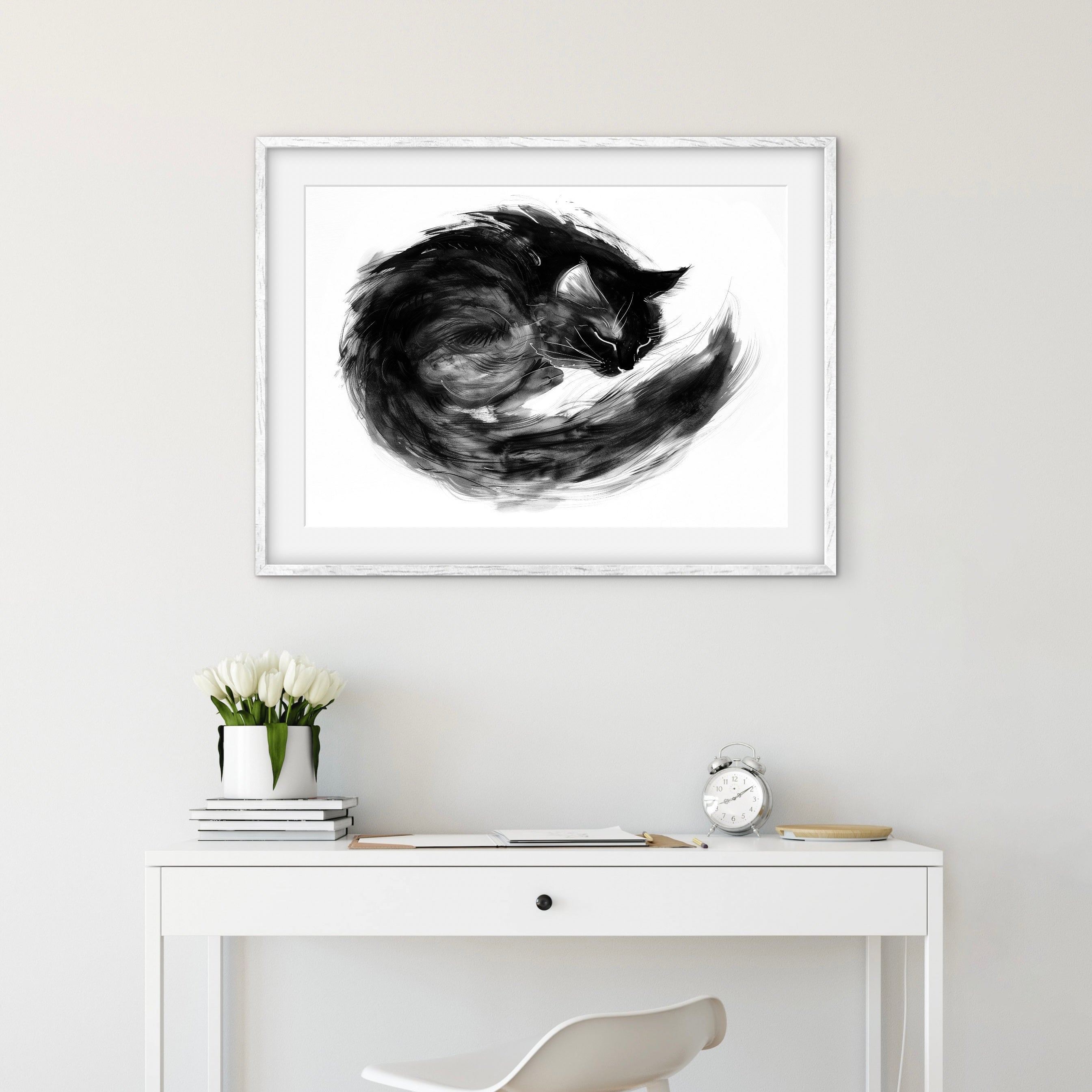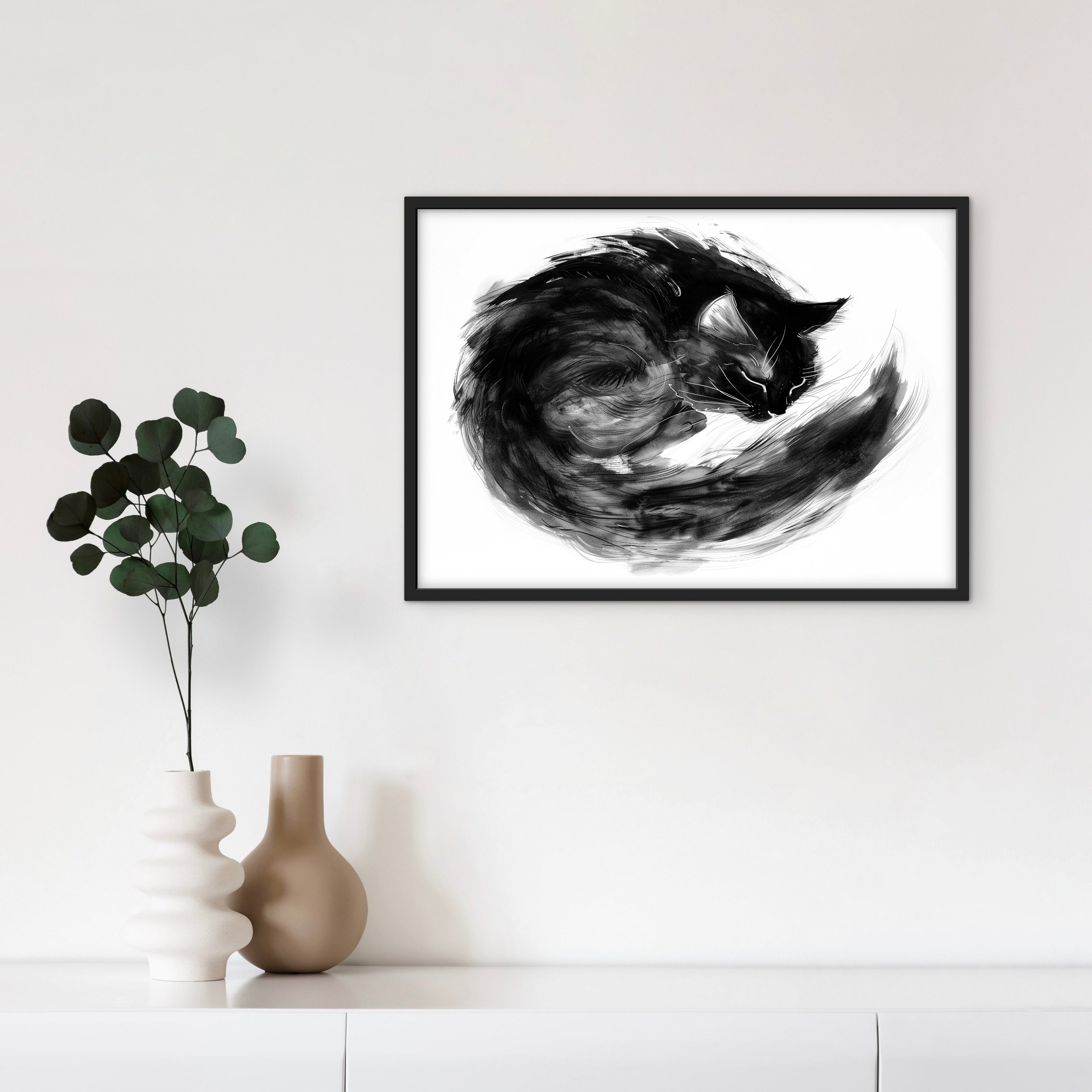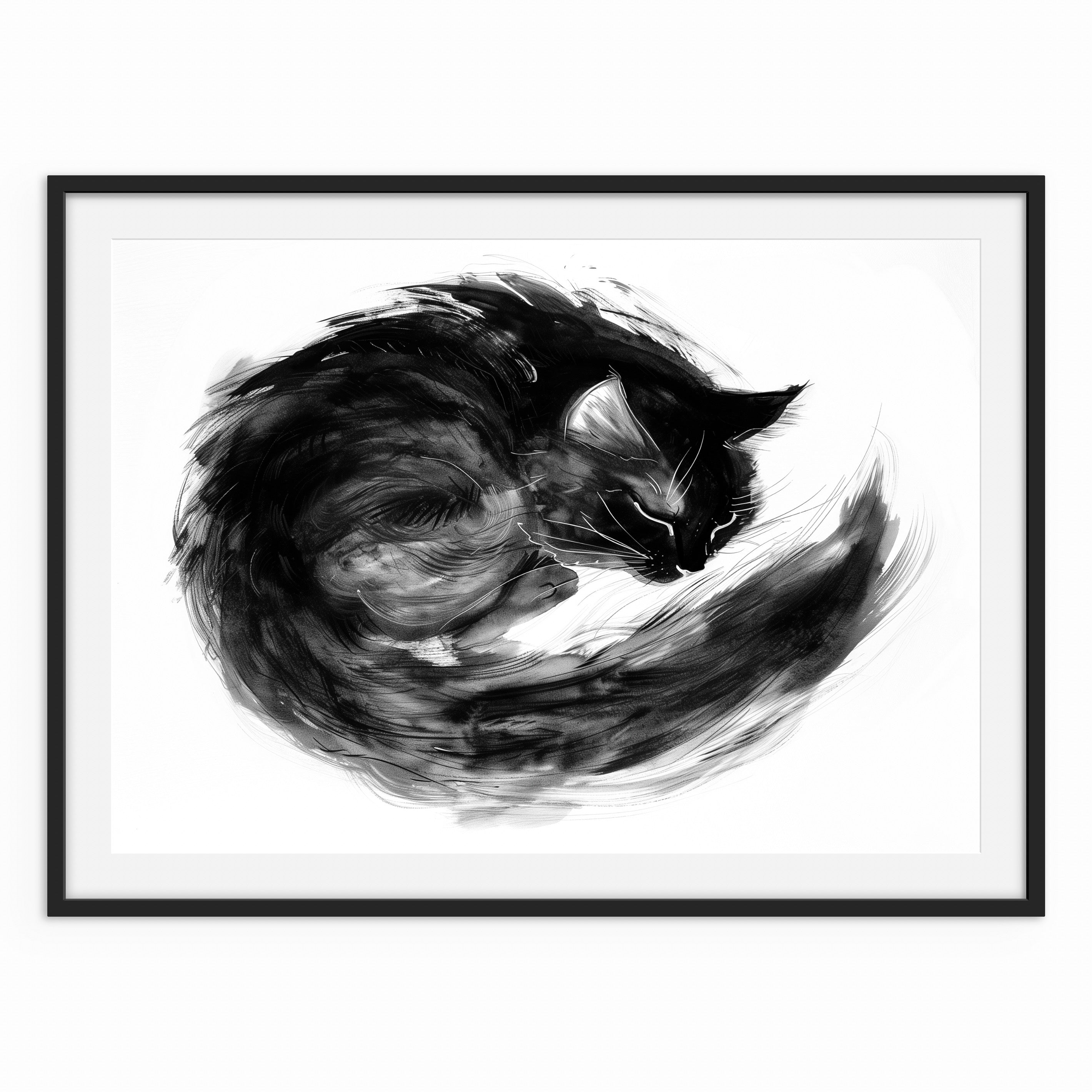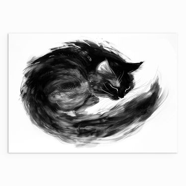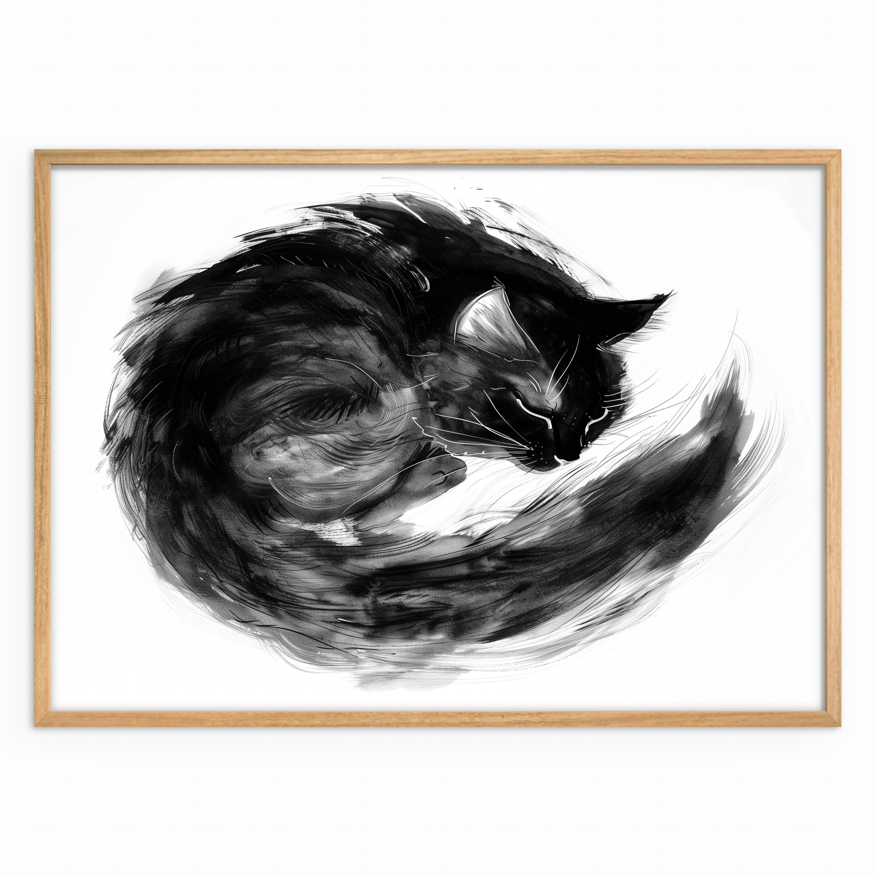 A black-and-white ink-style illustration of a curled cat resting in a tight, circular form. Loose brushstrokes and layered textures emphasise softness, warmth, and stillness, with the body forming a closed, protective shape against a white background.