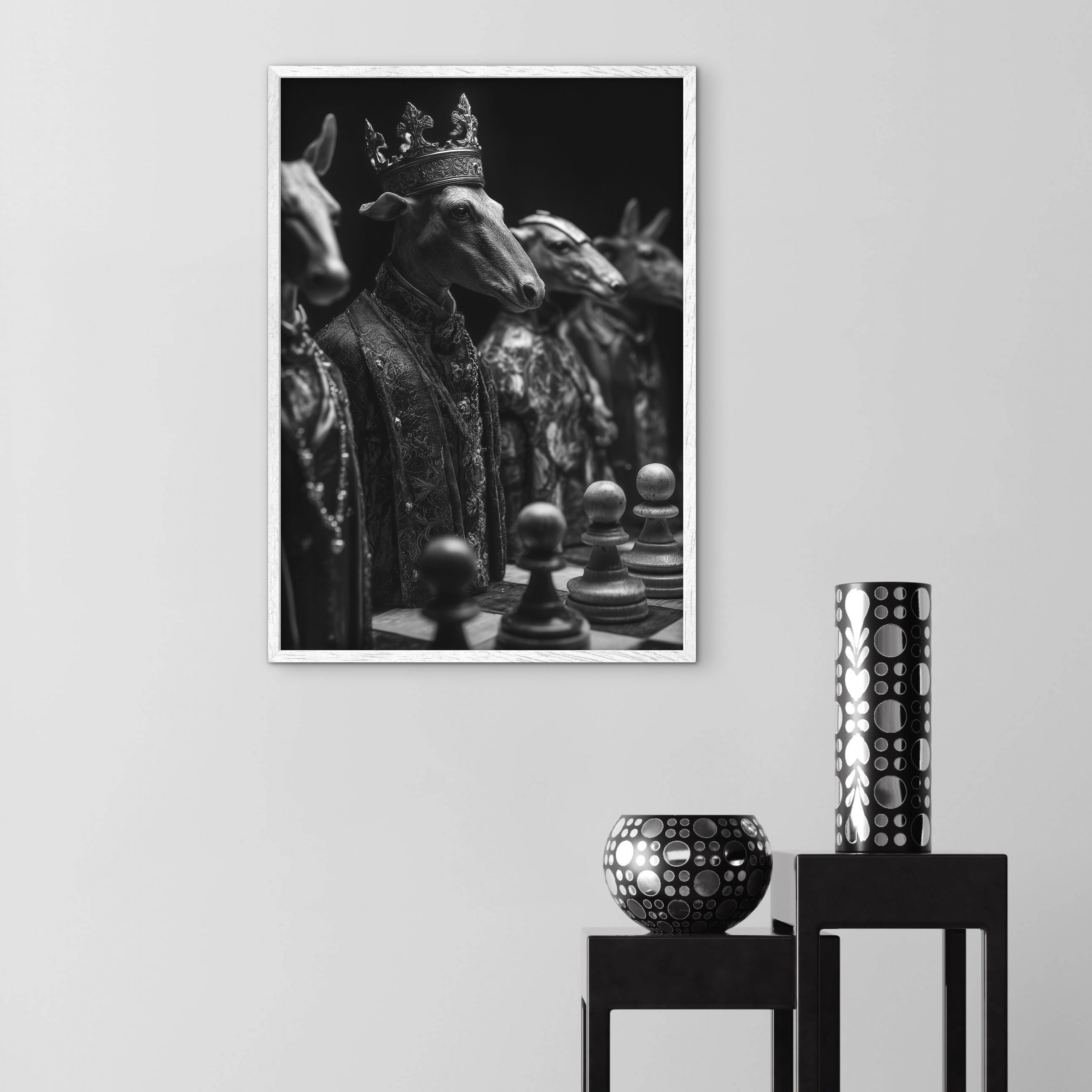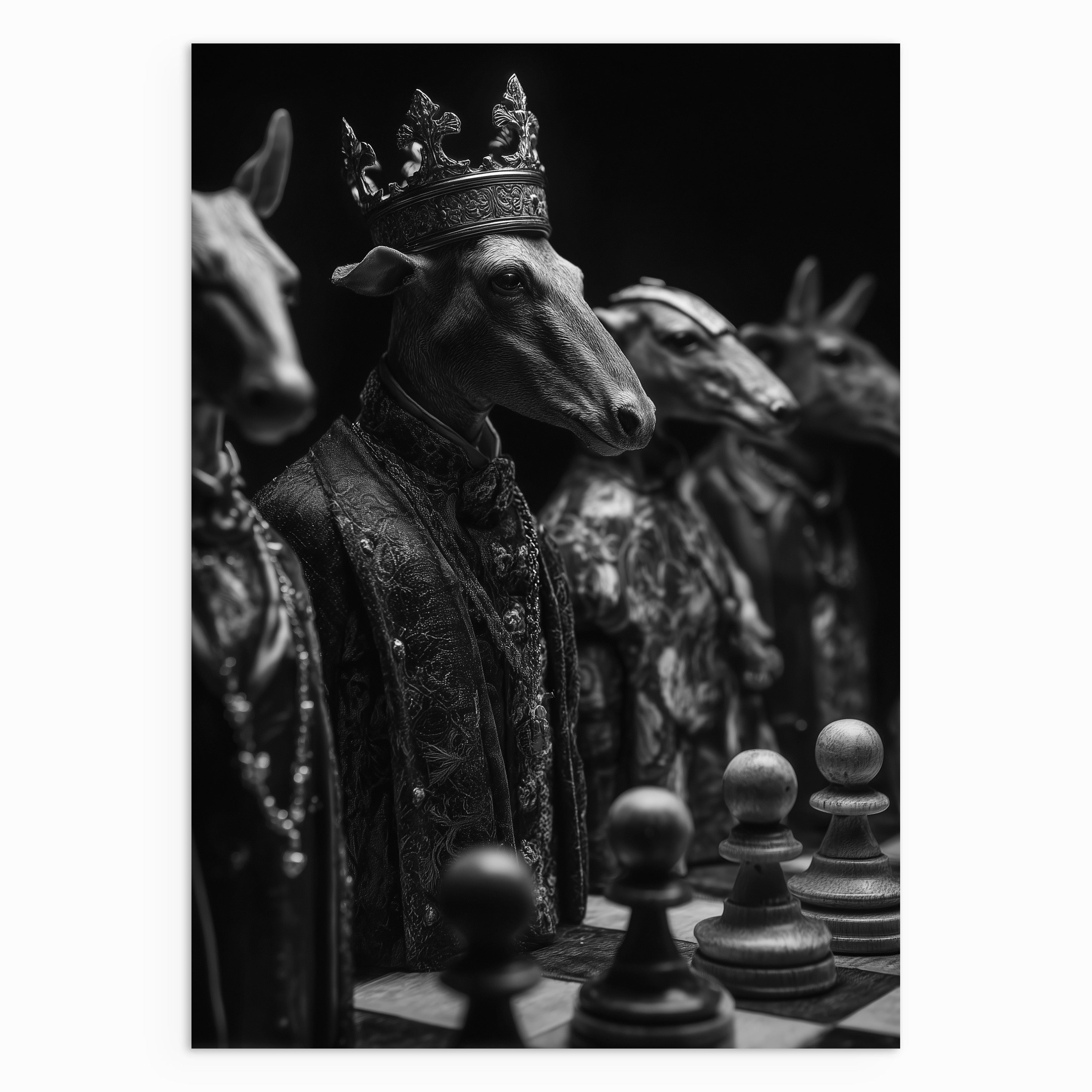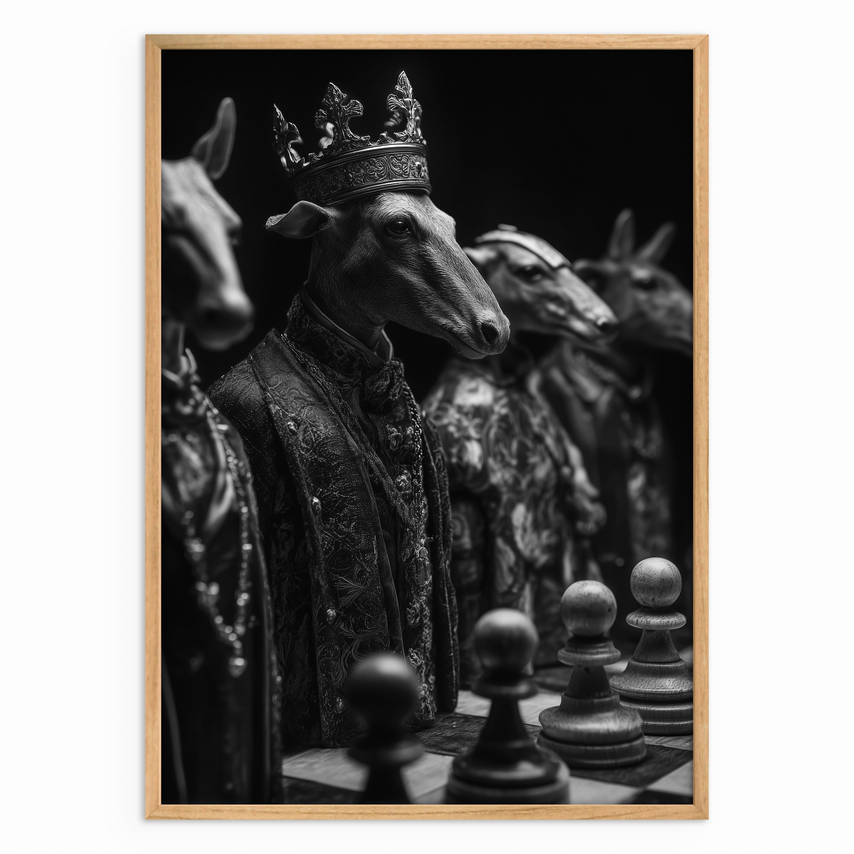 A monochrome surreal artwork showing goat figures dressed in ornate garments, one wearing a crown, positioned around a chessboard. The image blends animal form with human symbolism, suggesting power, hierarchy, and calculated stillness through its carefully staged composition.