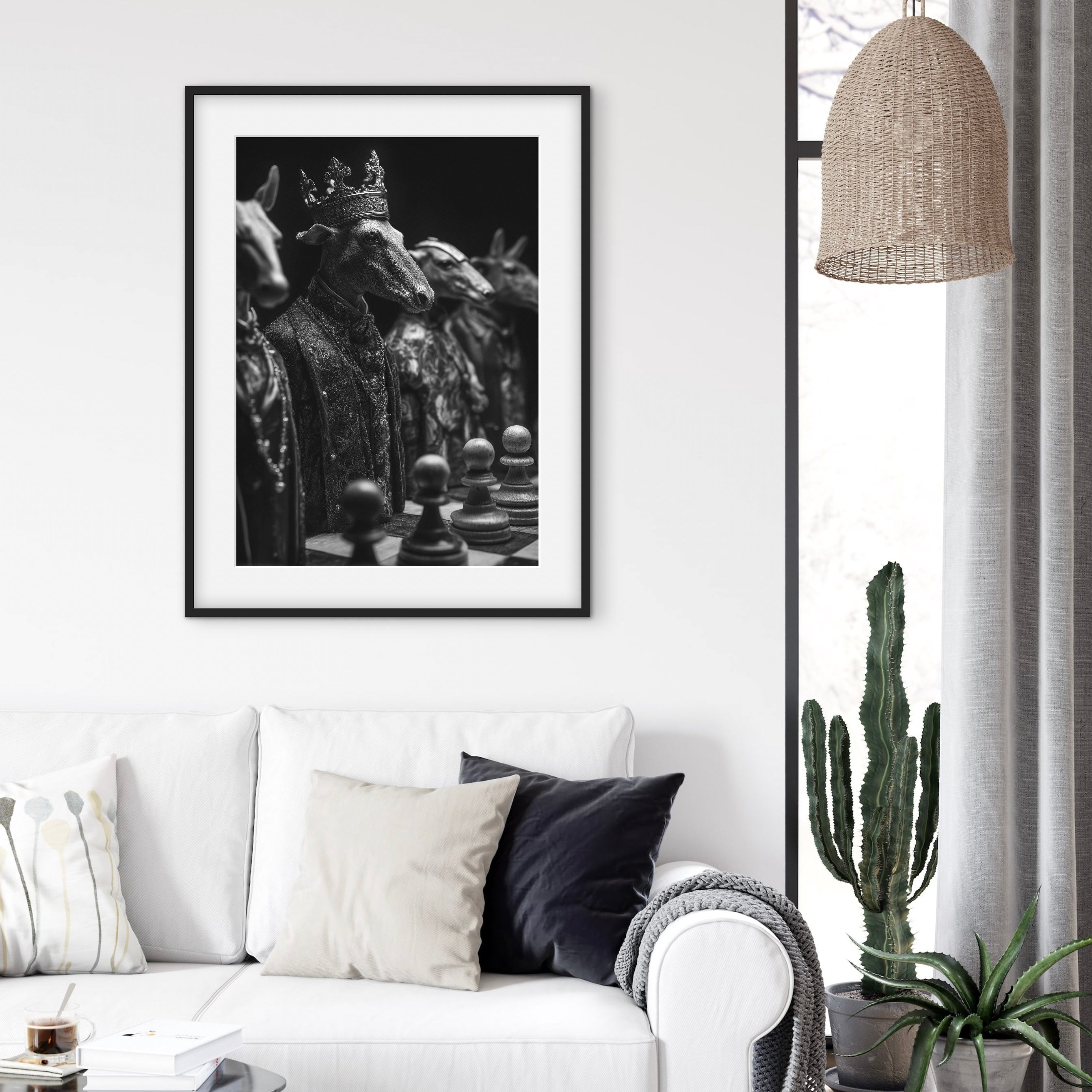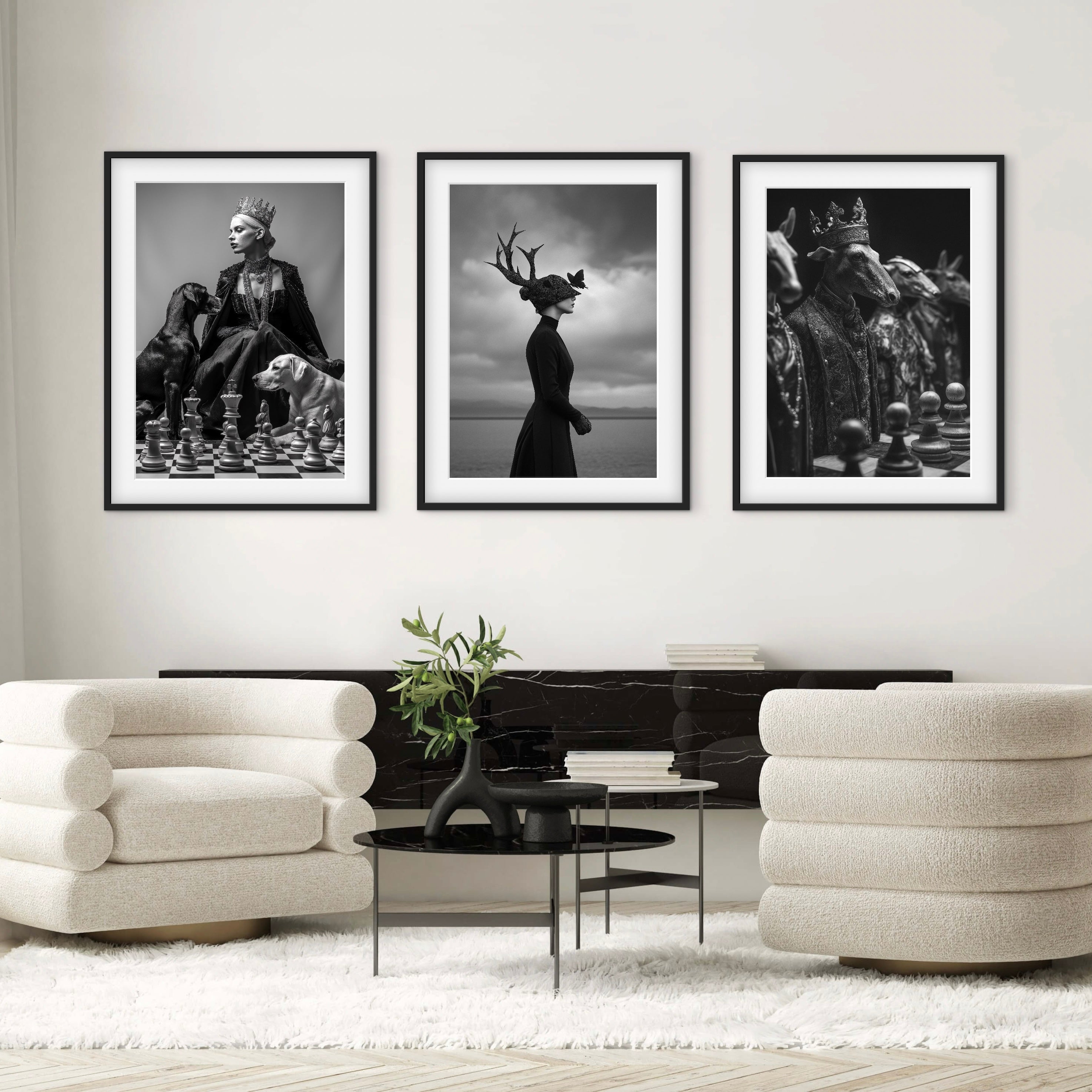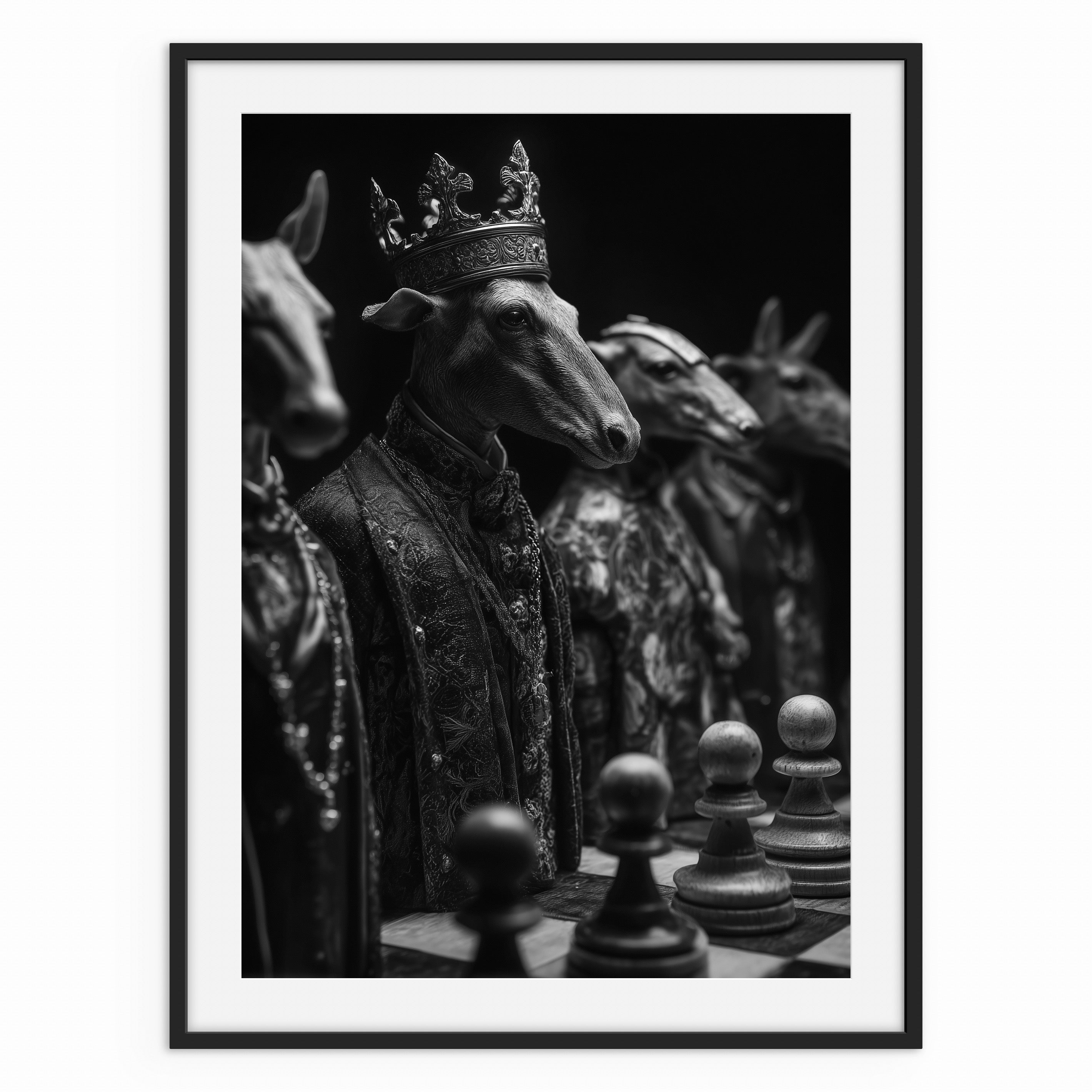 A monochrome surreal artwork showing goat figures dressed in ornate garments, one wearing a crown, positioned around a chessboard. The image blends animal form with human symbolism, suggesting power, hierarchy, and calculated stillness through its carefully staged composition.