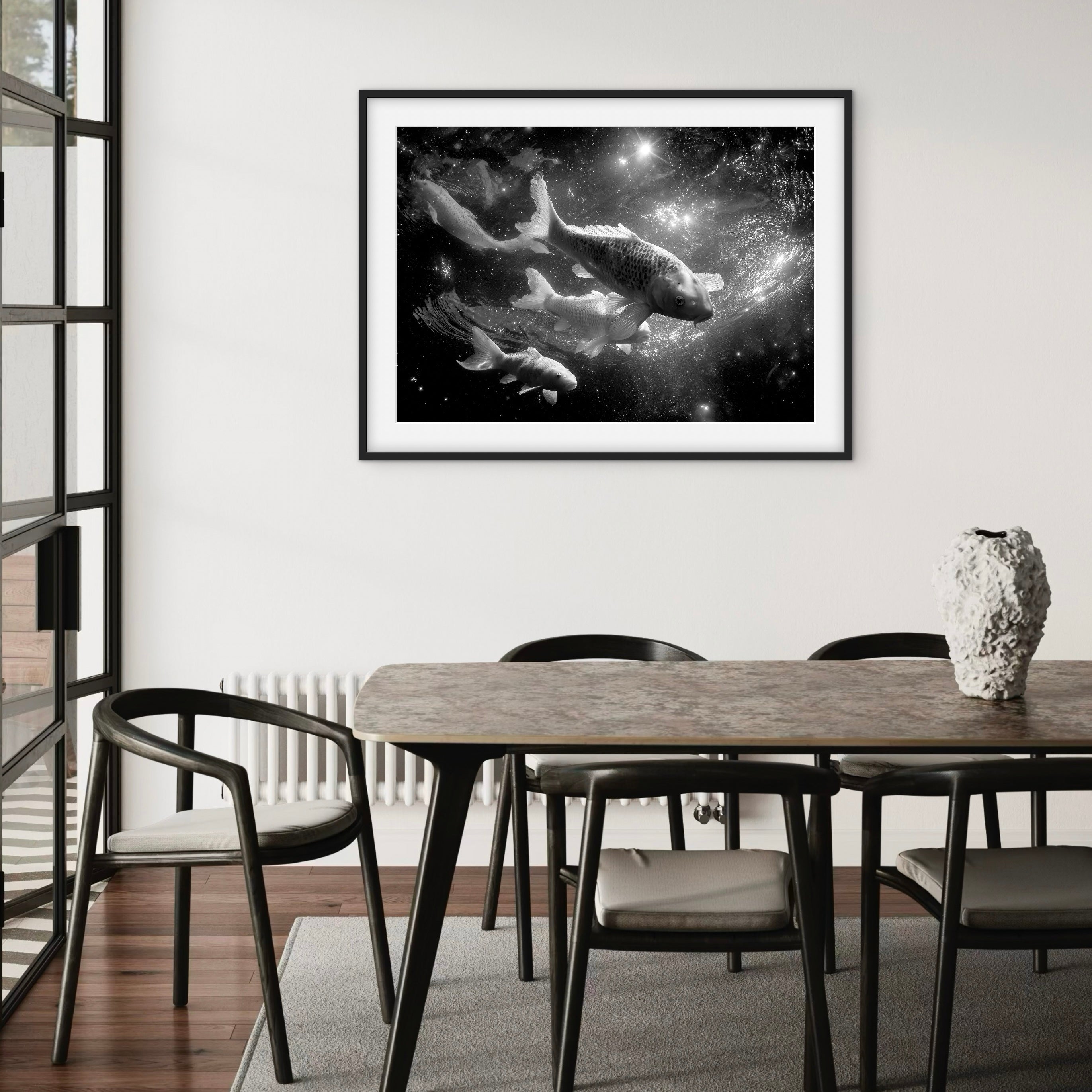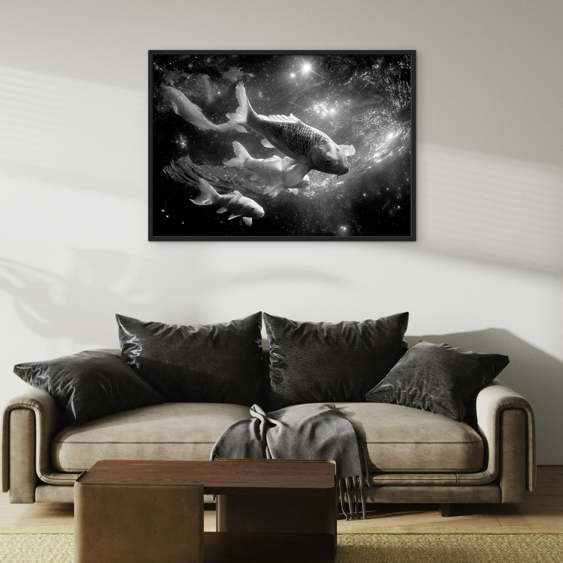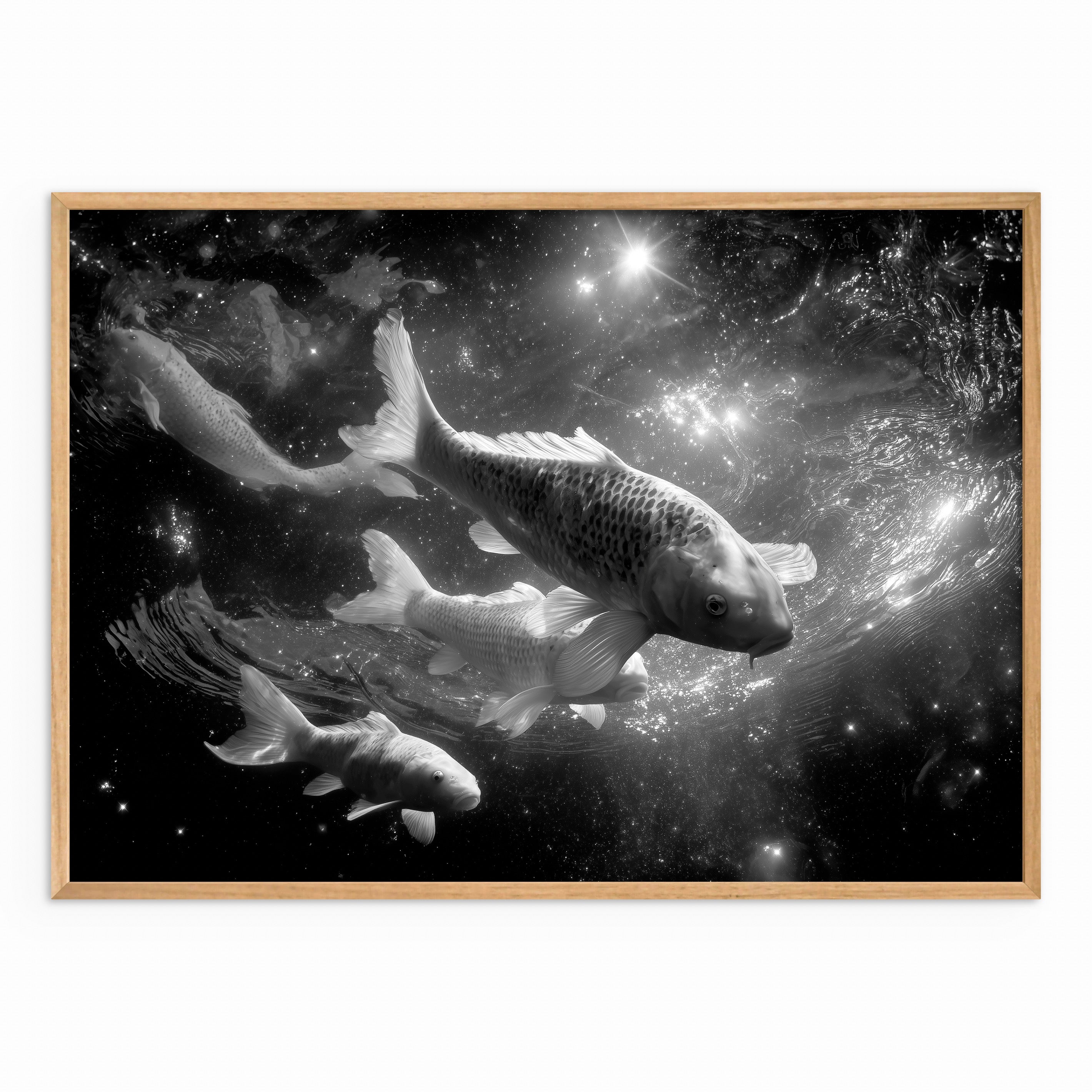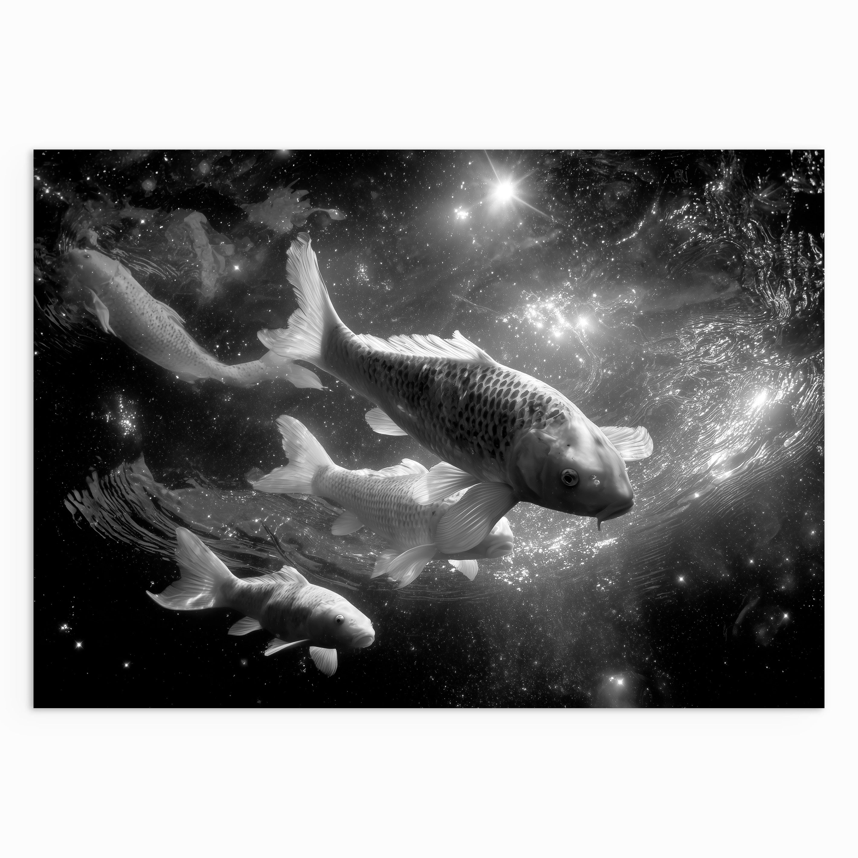 A surreal black-and-white scene of koi fish swimming through a star-filled, cosmic environment. The fish appear suspended in space, blending water movement with celestial textures to create a sense of calm motion and quiet depth.