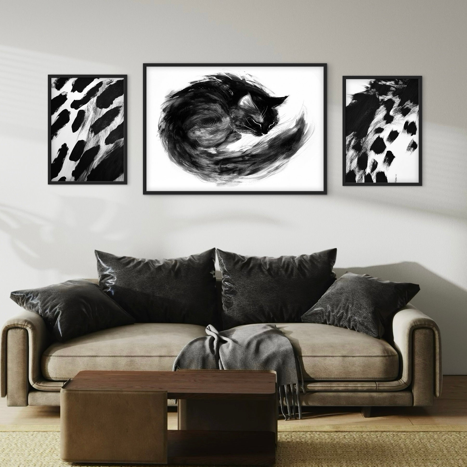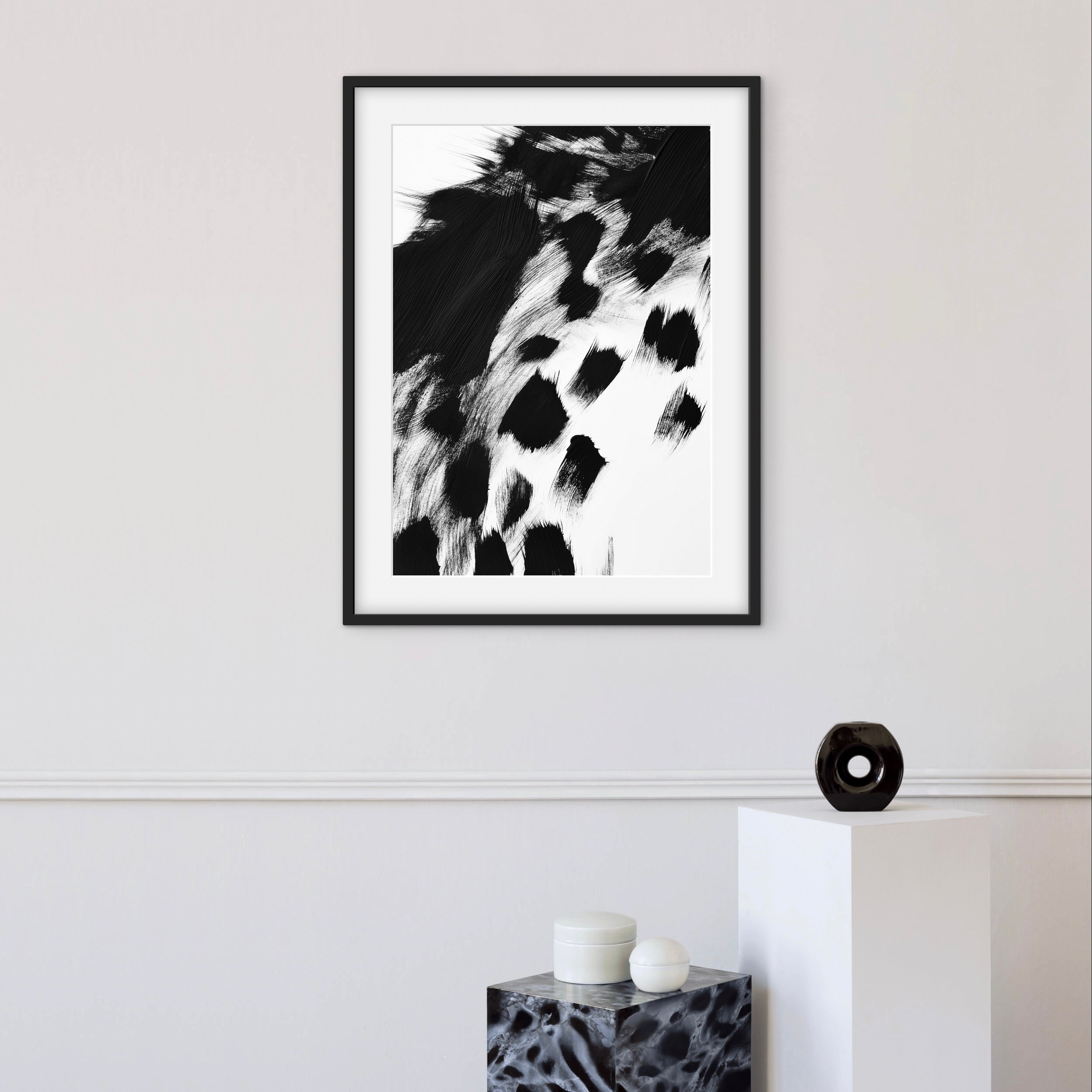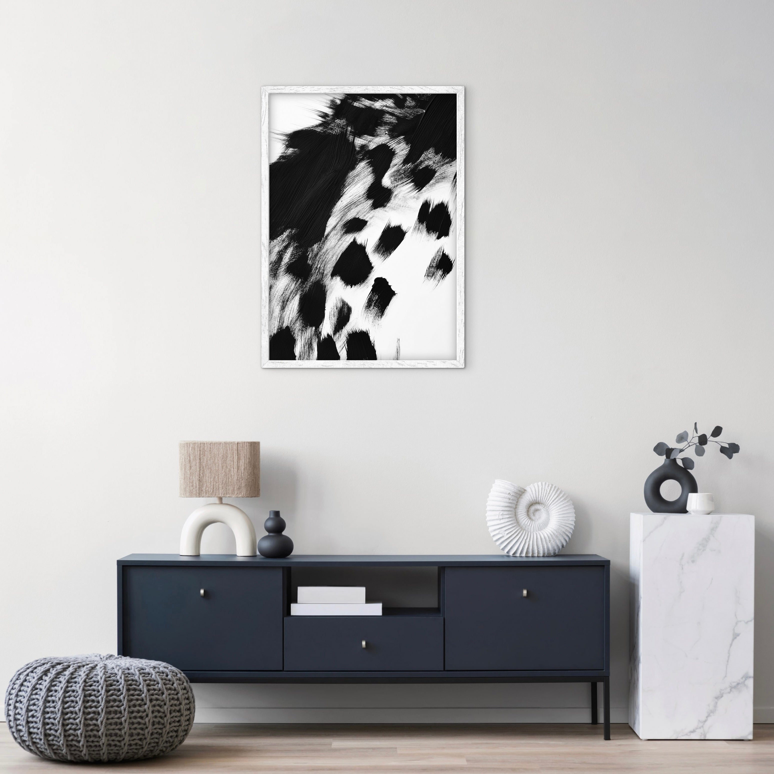 A bold abstract artwork featuring sweeping black forms and textured brushstrokes against a white background. The composition feels directional but unresolved, adding visual interest without narrative. Works well as a statement piece in contemporary spaces.