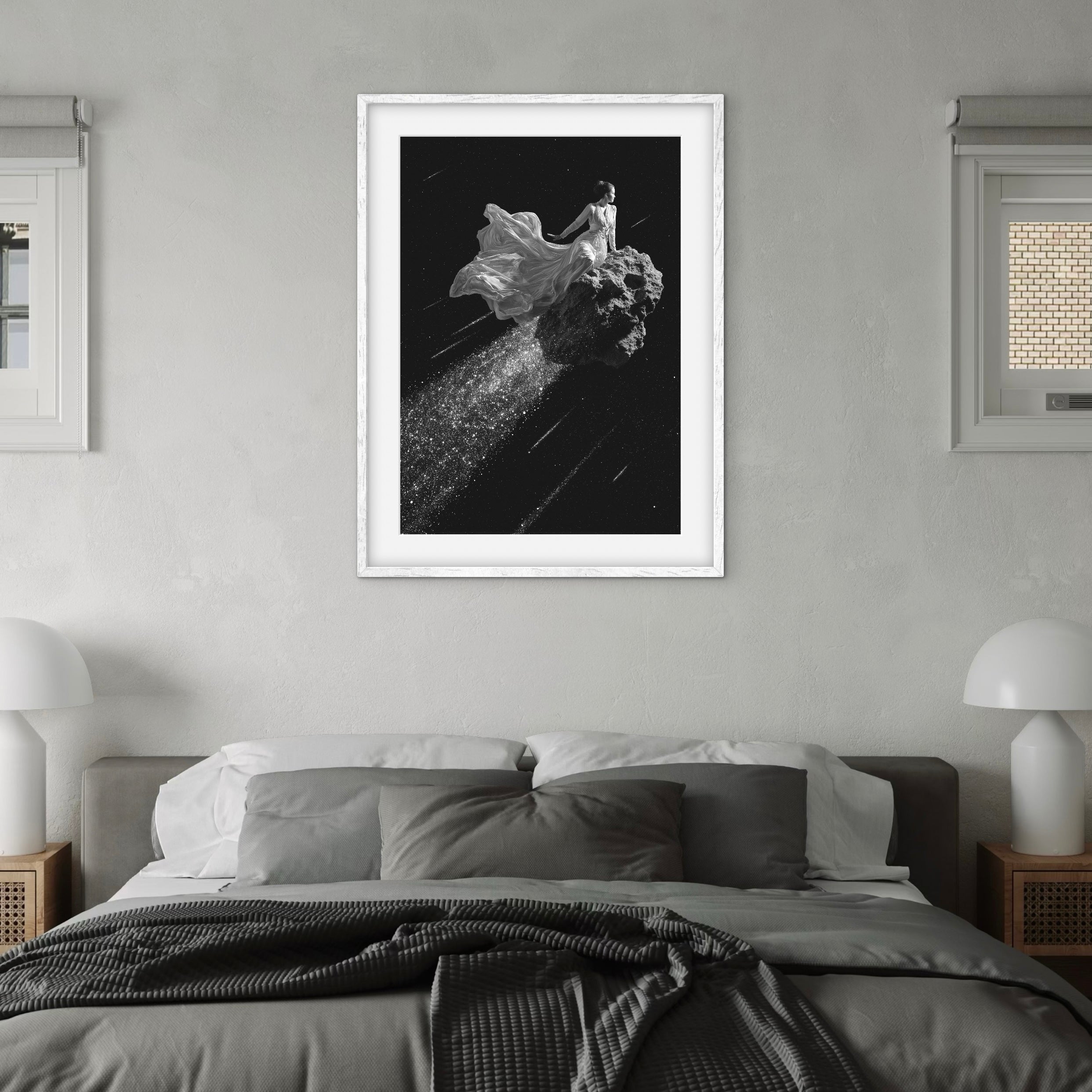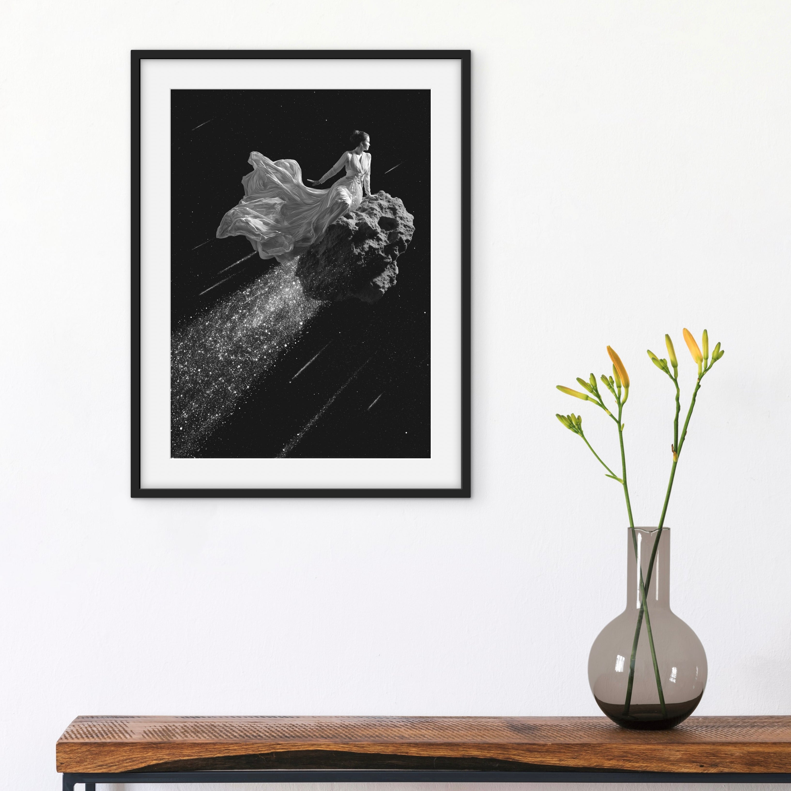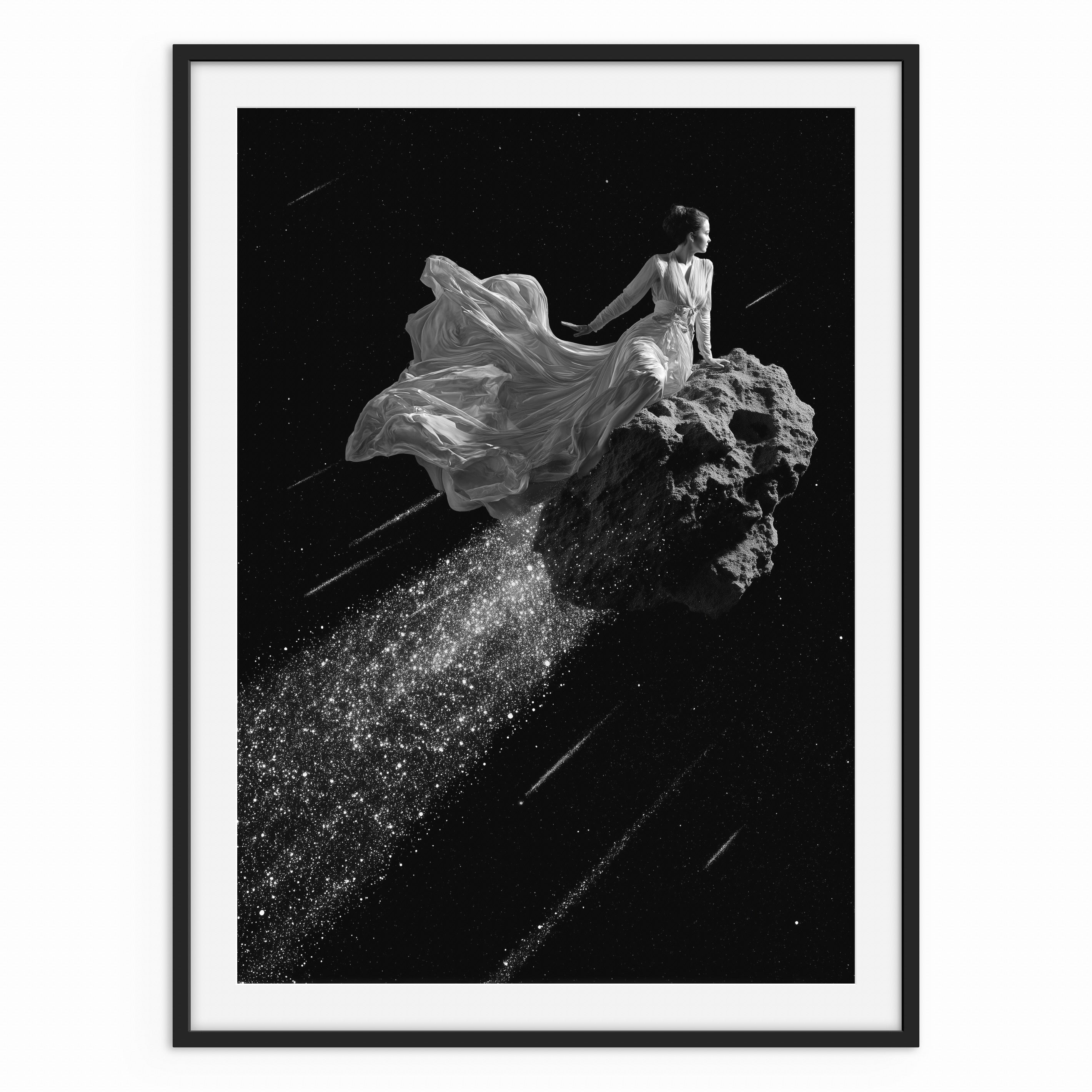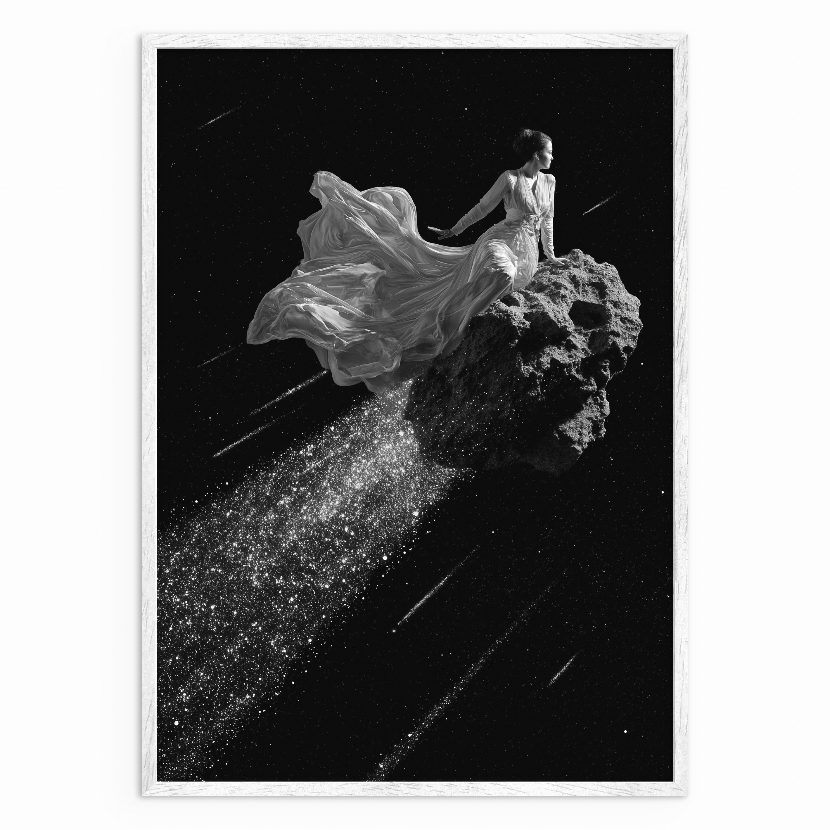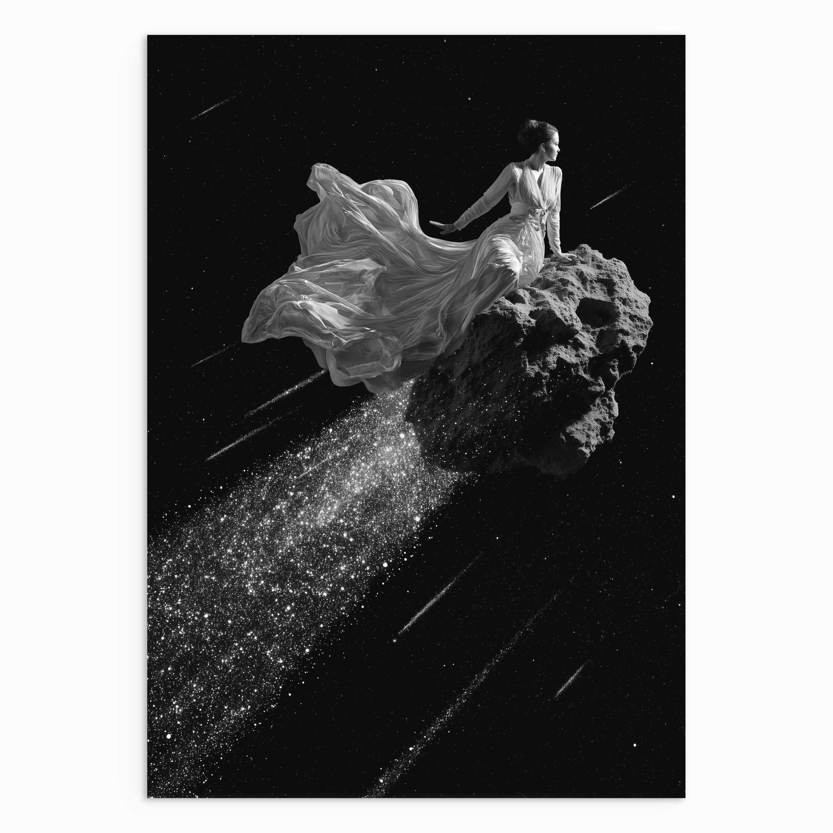 A surreal black-and-white artwork featuring a solitary figure seated on a drifting asteroid, suspended in a vast star-filled space. Flowing fabric dissolves into stardust, creating a sense of movement and weightlessness against the deep, dark backdrop. A striking monochrome piece that brings quiet drama and a sense of scale to modern interiors.