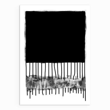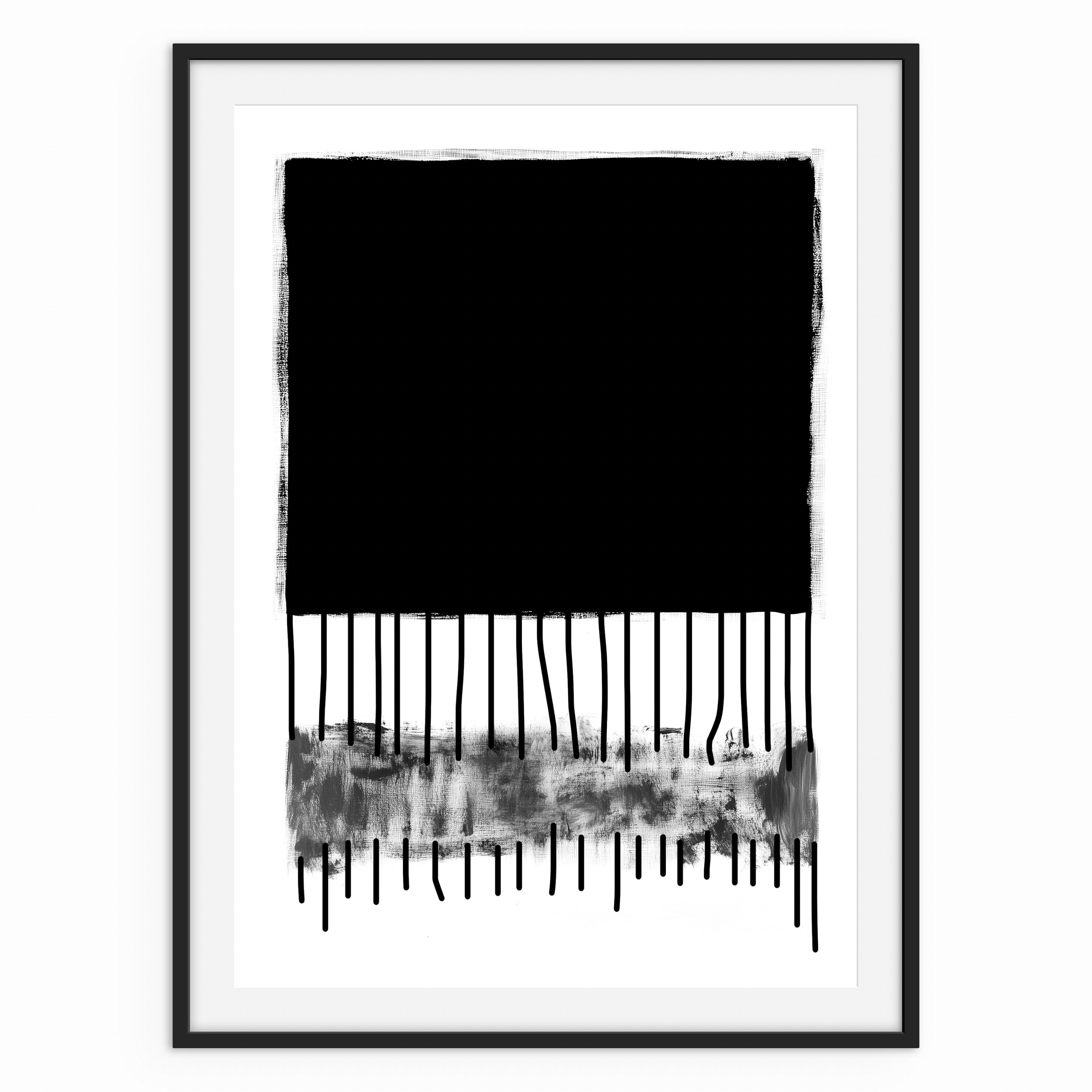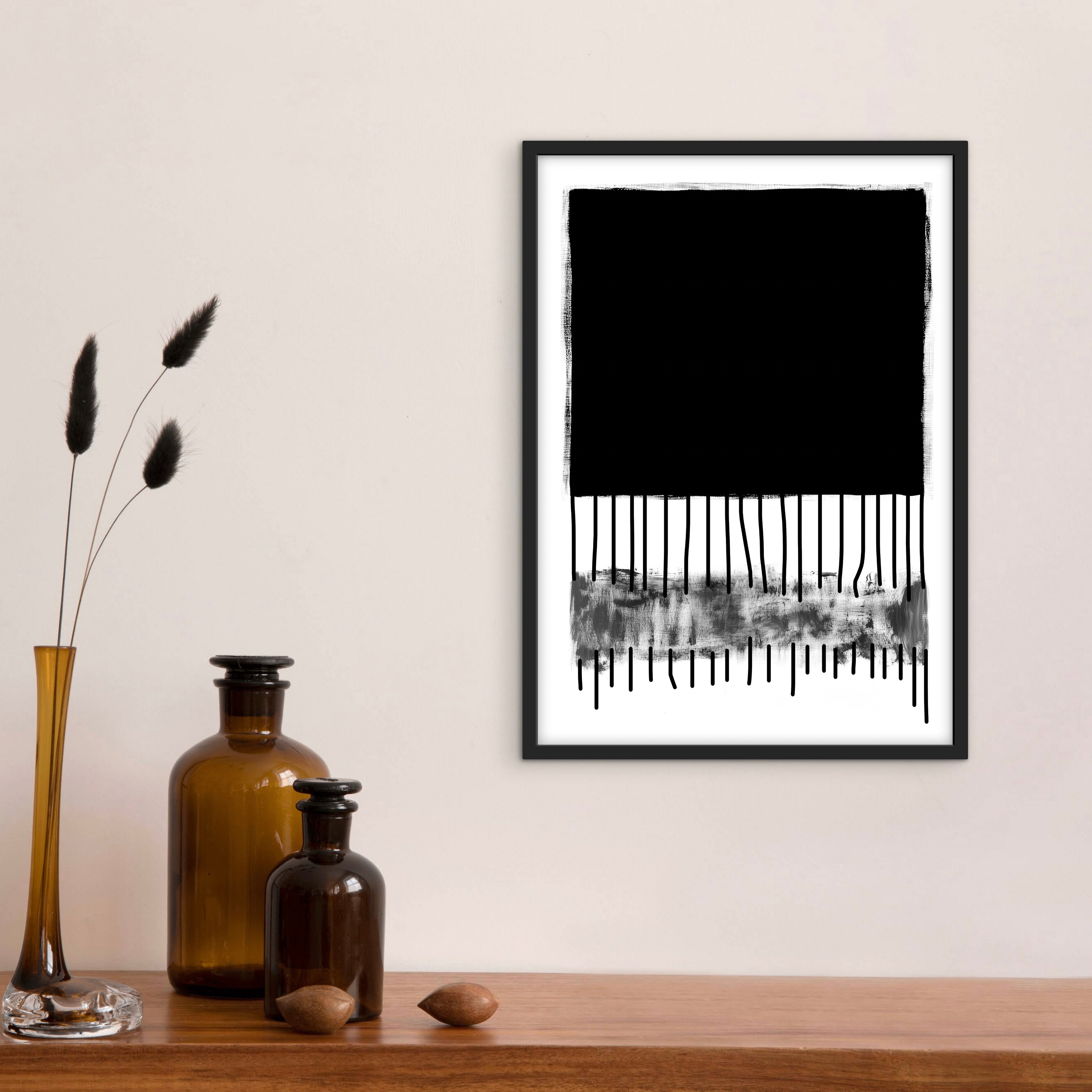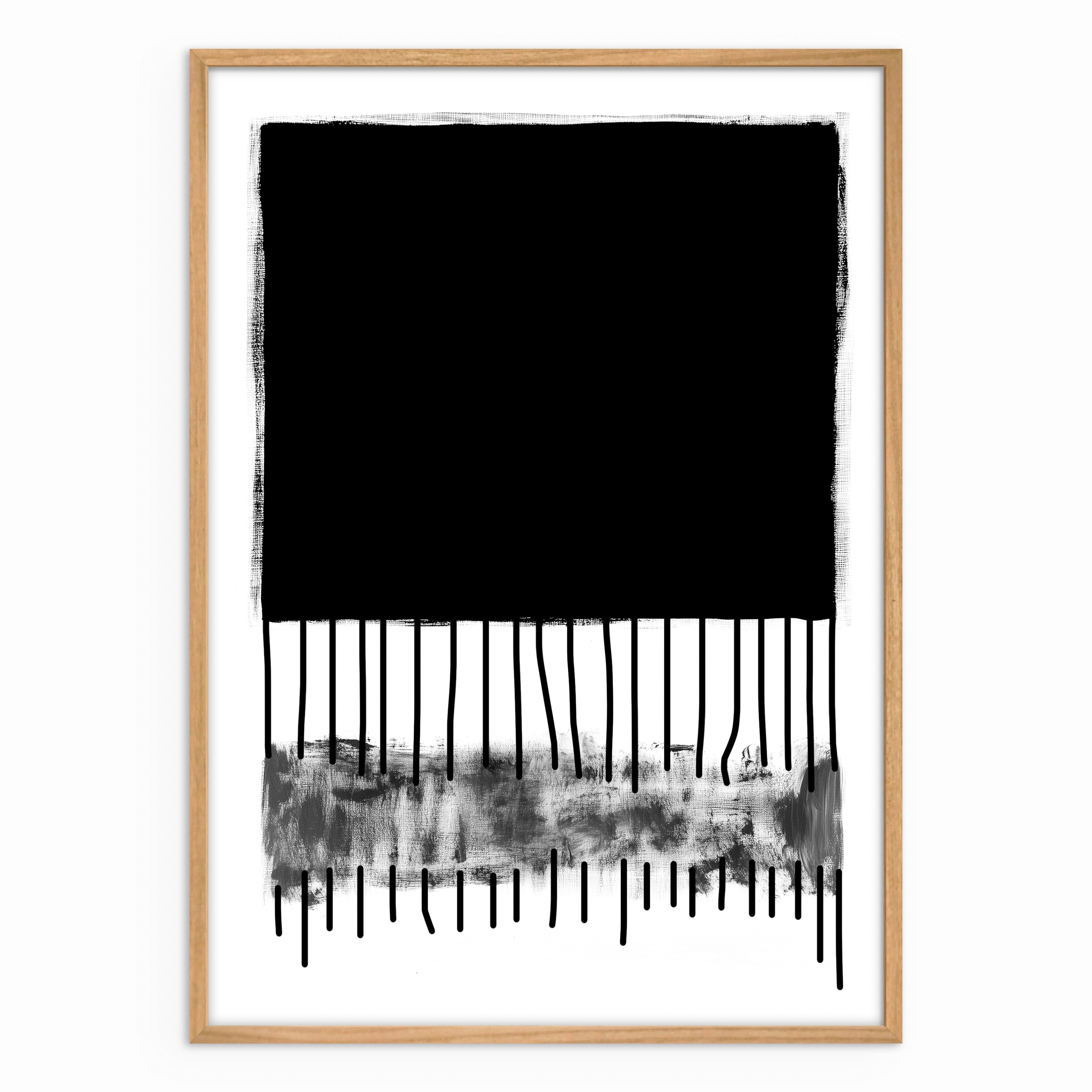 A bold black square dominates the upper portion of the composition, with thin vertical drips extending downward into a softer grey band. The contrast between hard edges and fluid marks creates tension without narrative. Ideal for contemporary, gallery-style interiors.
