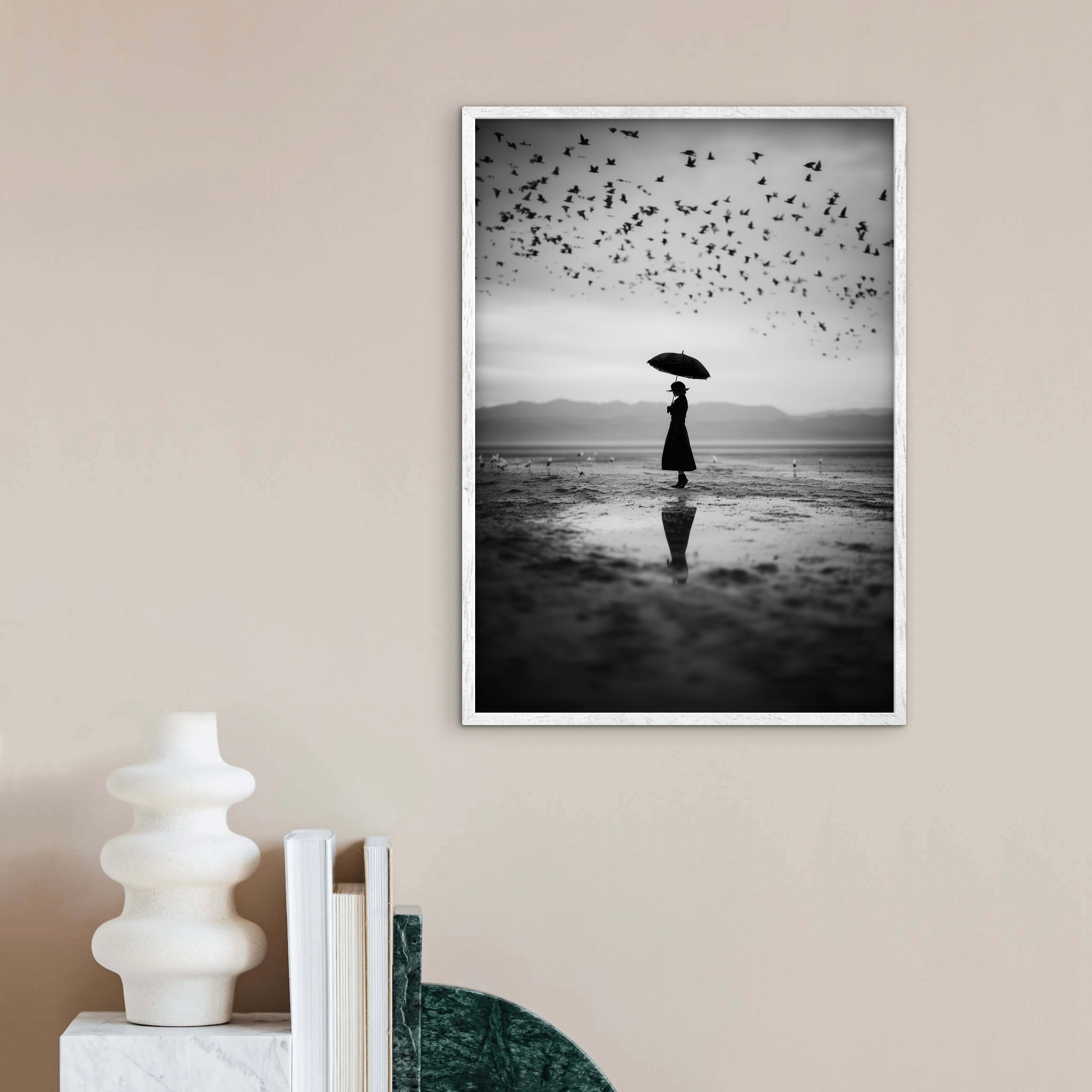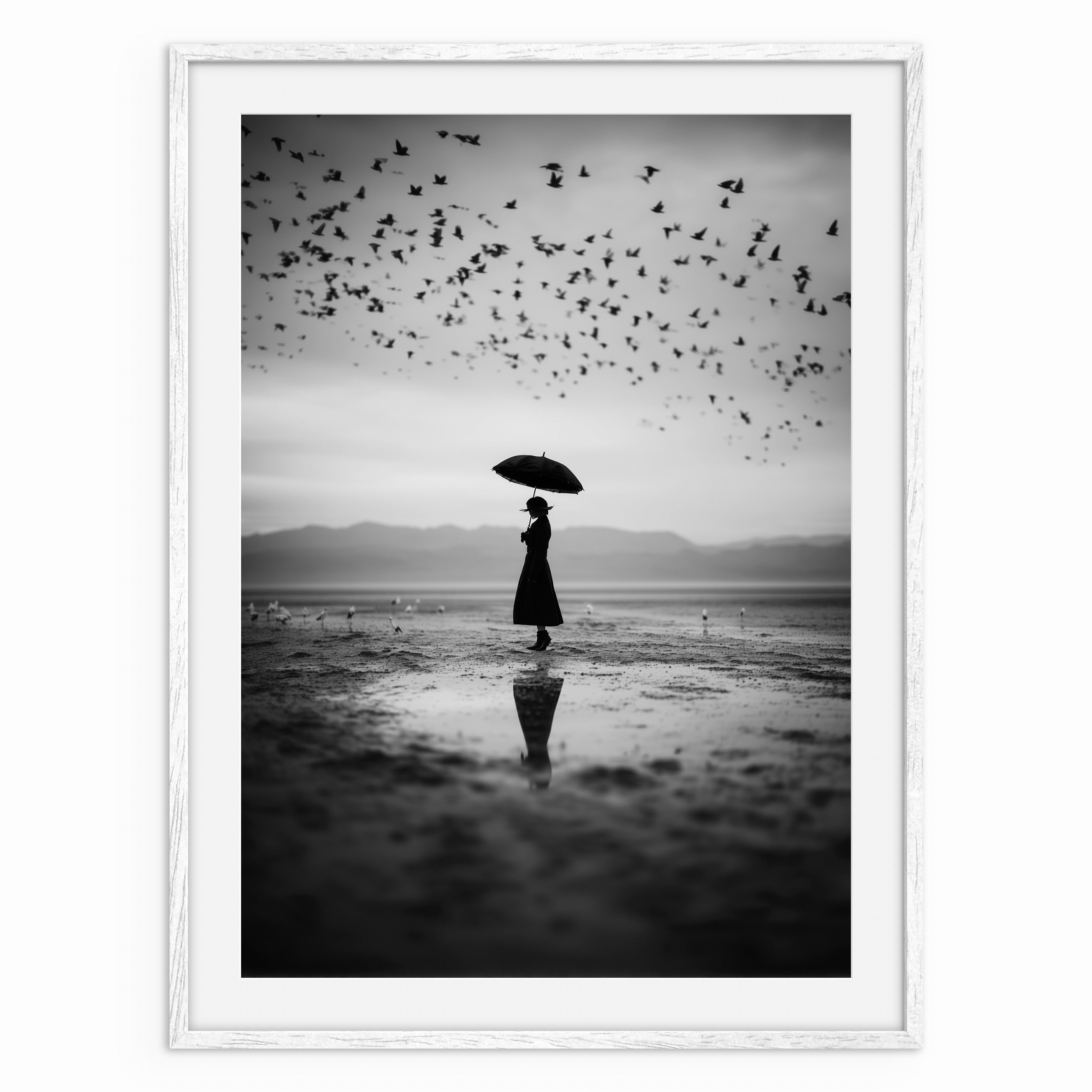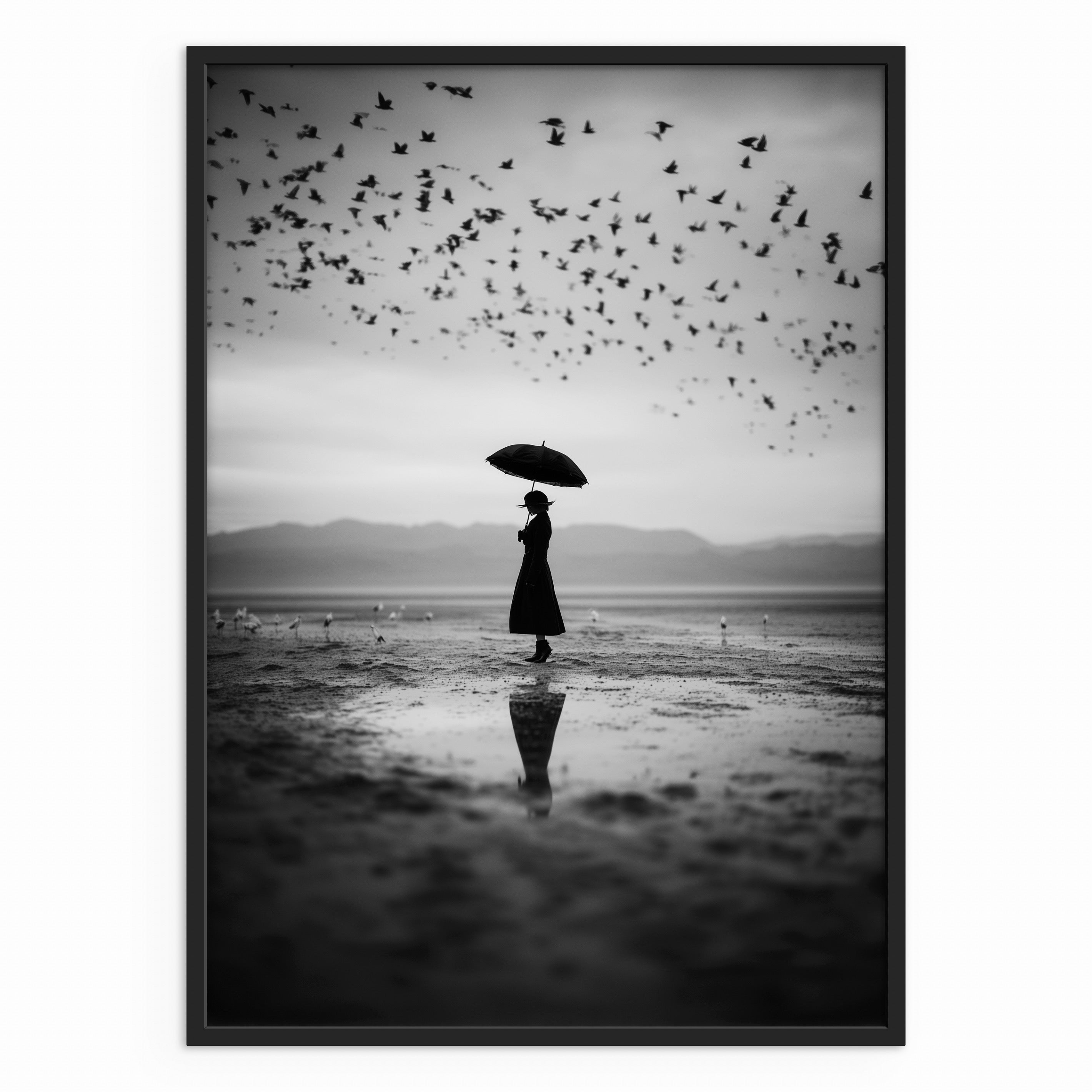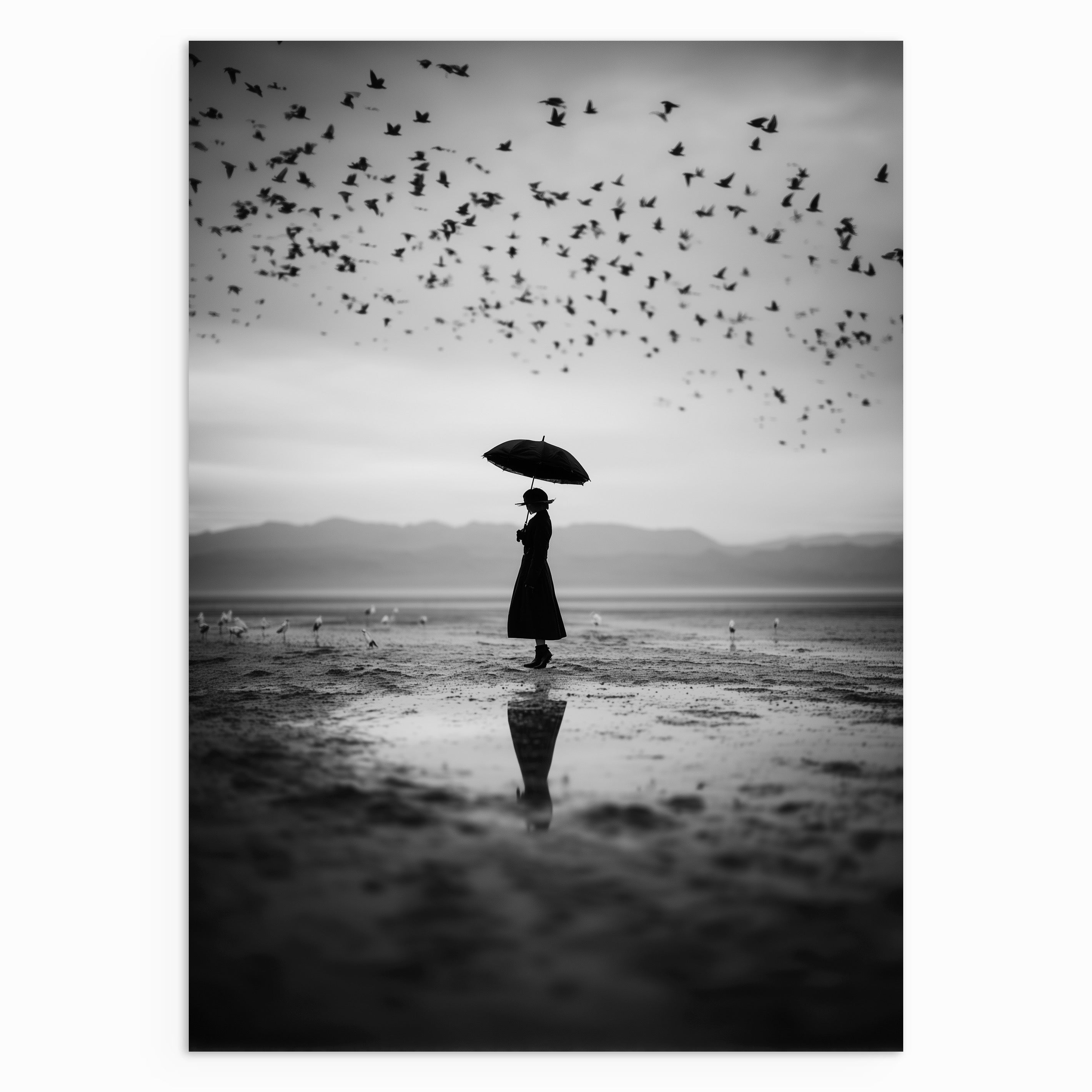 A solitary figure stands on a reflective shoreline holding an umbrella as a flock of birds moves across the sky above. The soft horizon and mirrored ground create a sense of pause within motion. A calm, cinematic artwork that works well in minimalist and monochrome spaces.