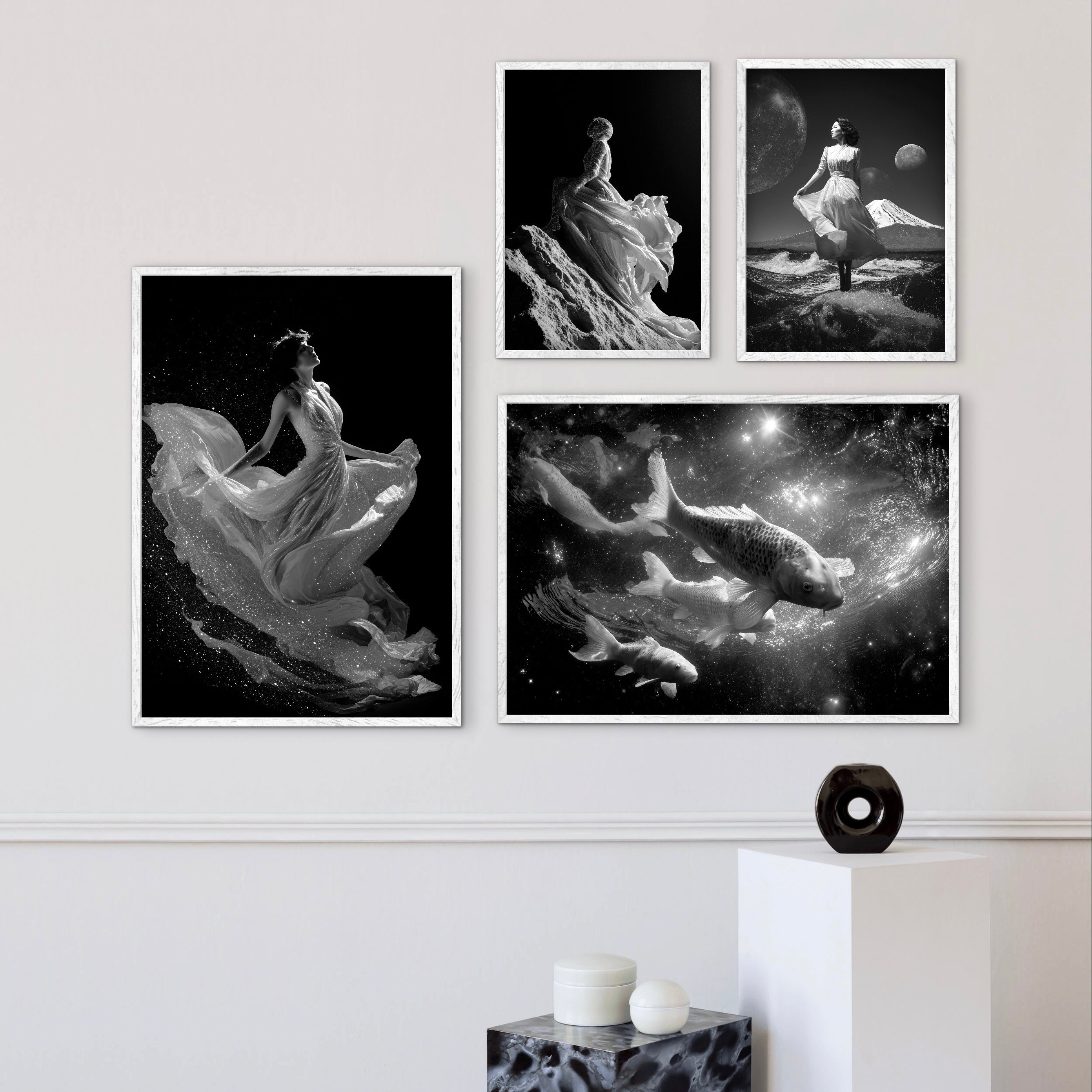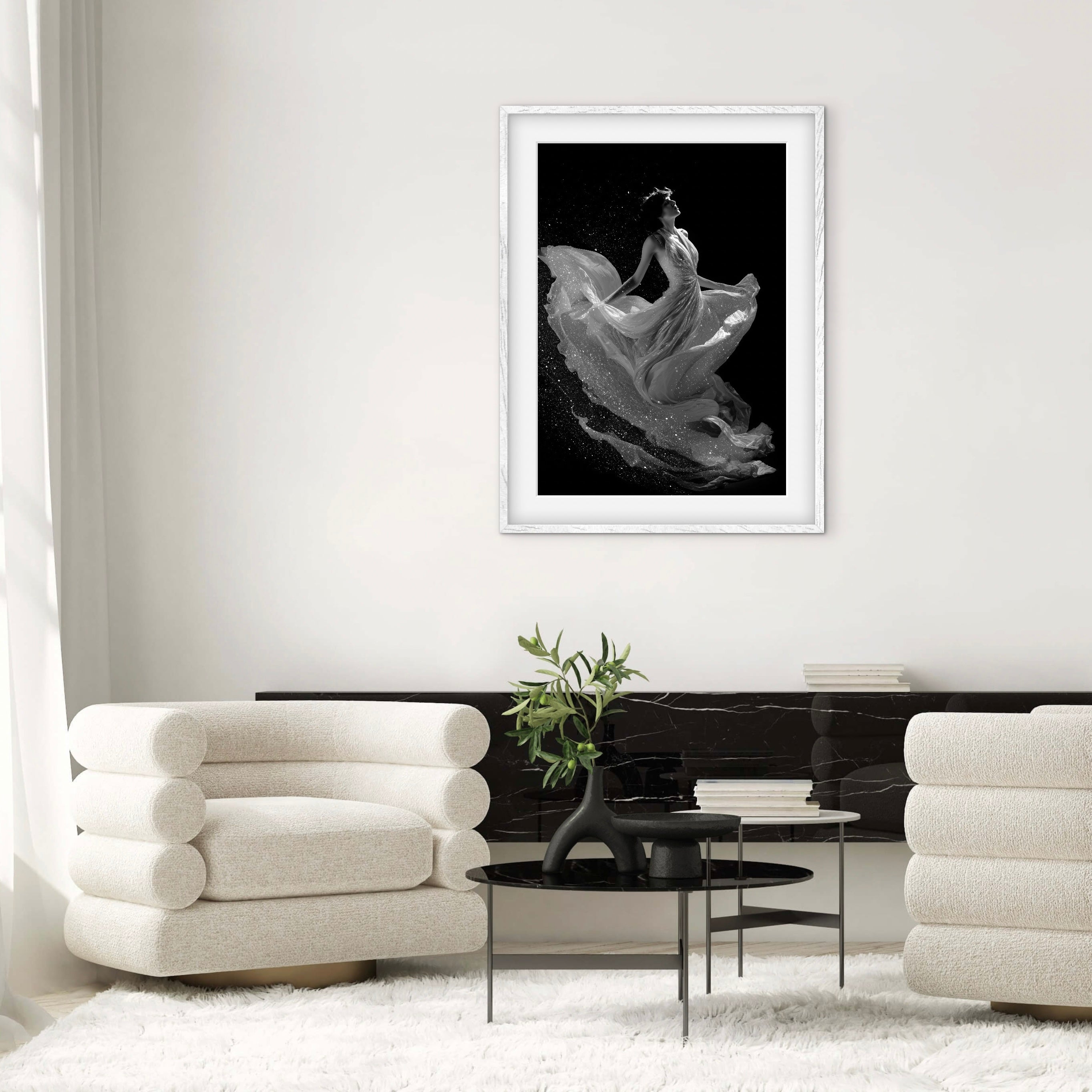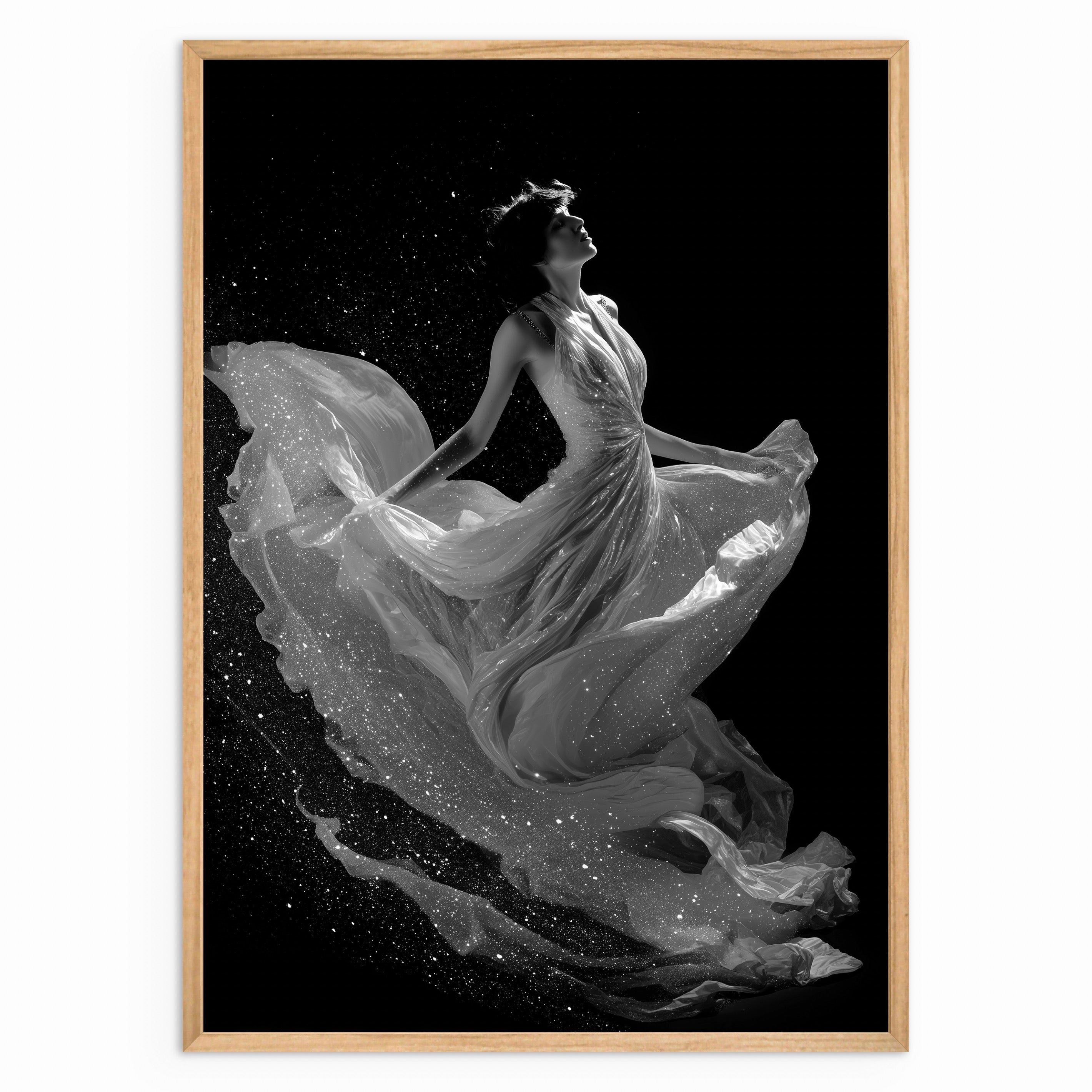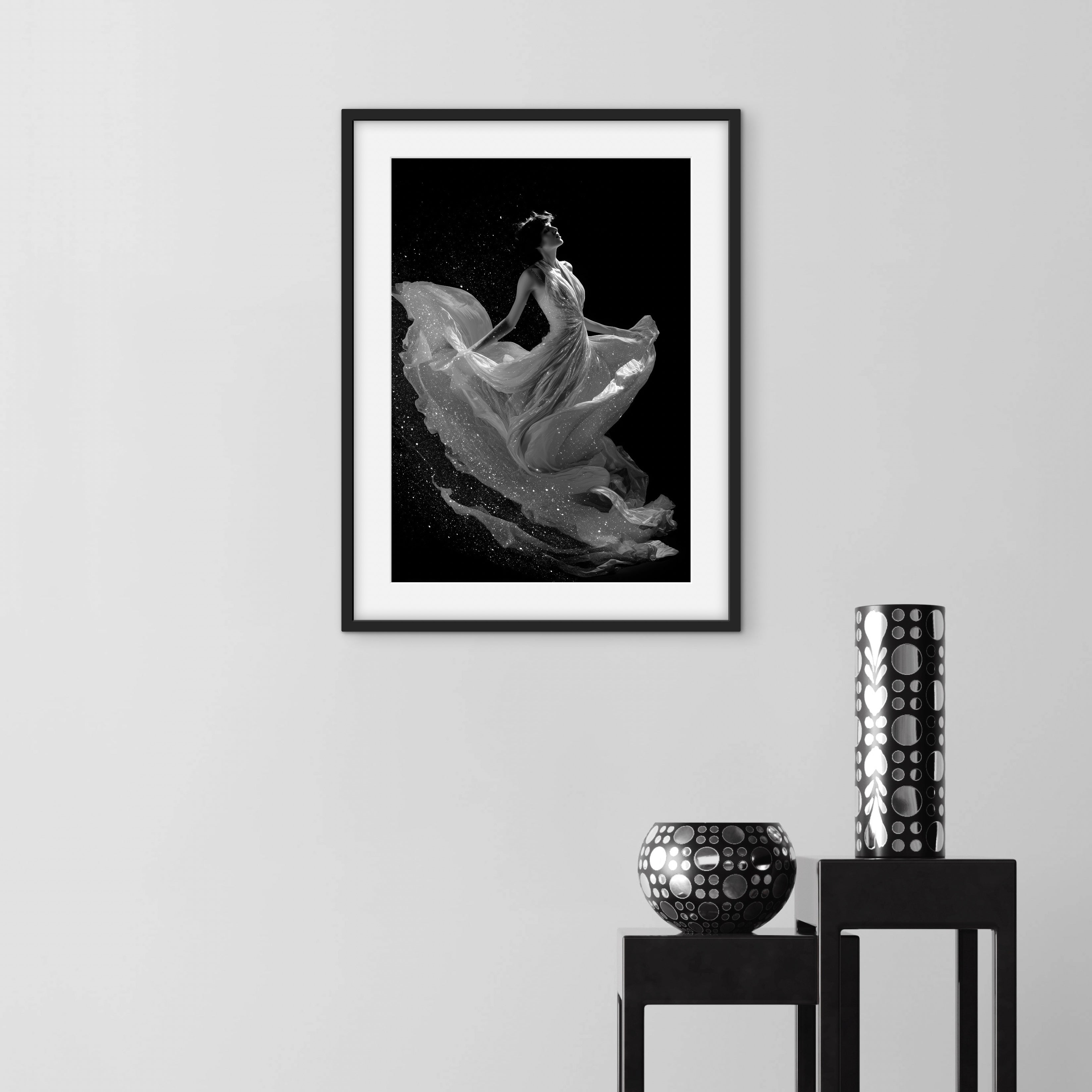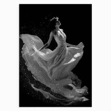A female figure is captured mid-motion, her flowing dress suspended as if caught by air. Fine particles surround the fabric, adding texture without overwhelming the form. The monochrome palette keeps the focus on movement and silhouette rather than narrative.
