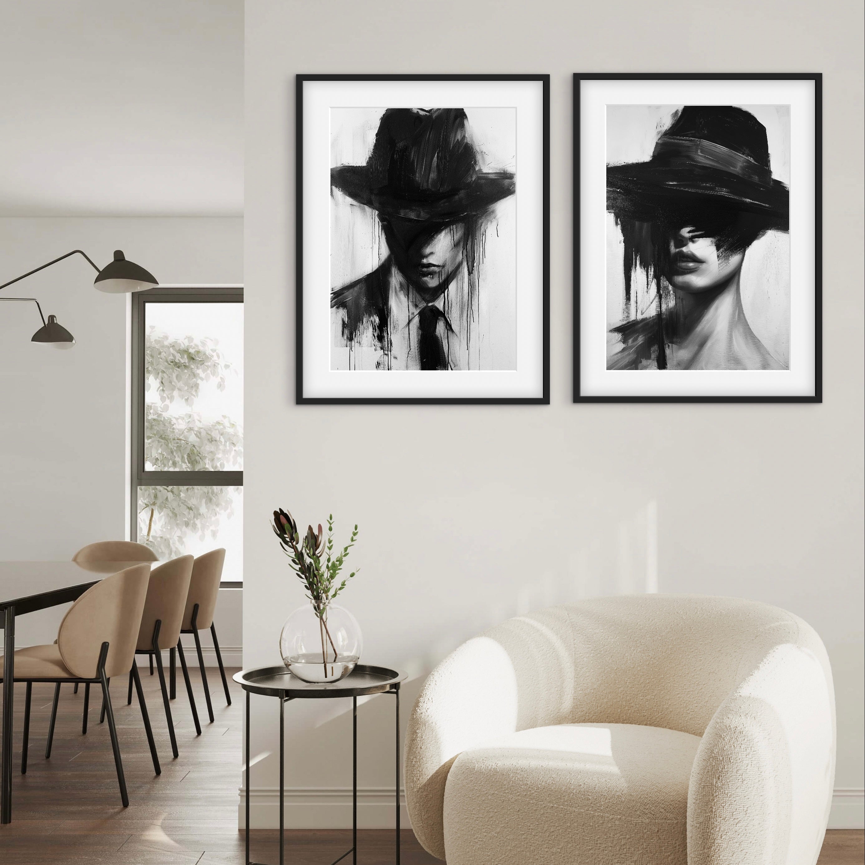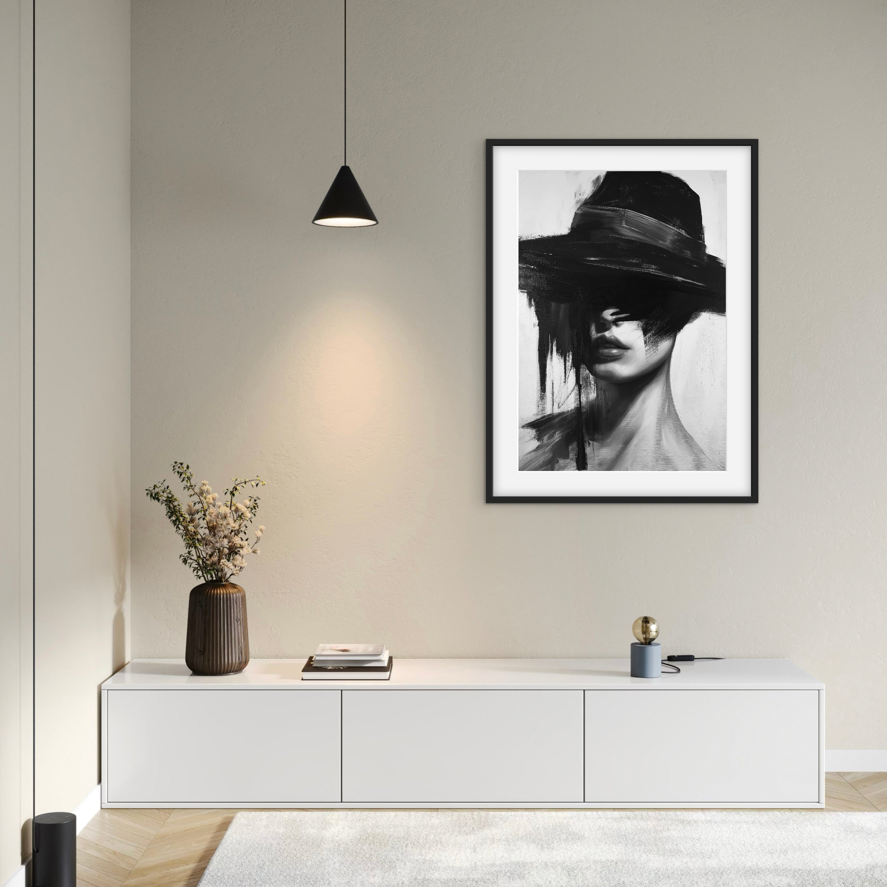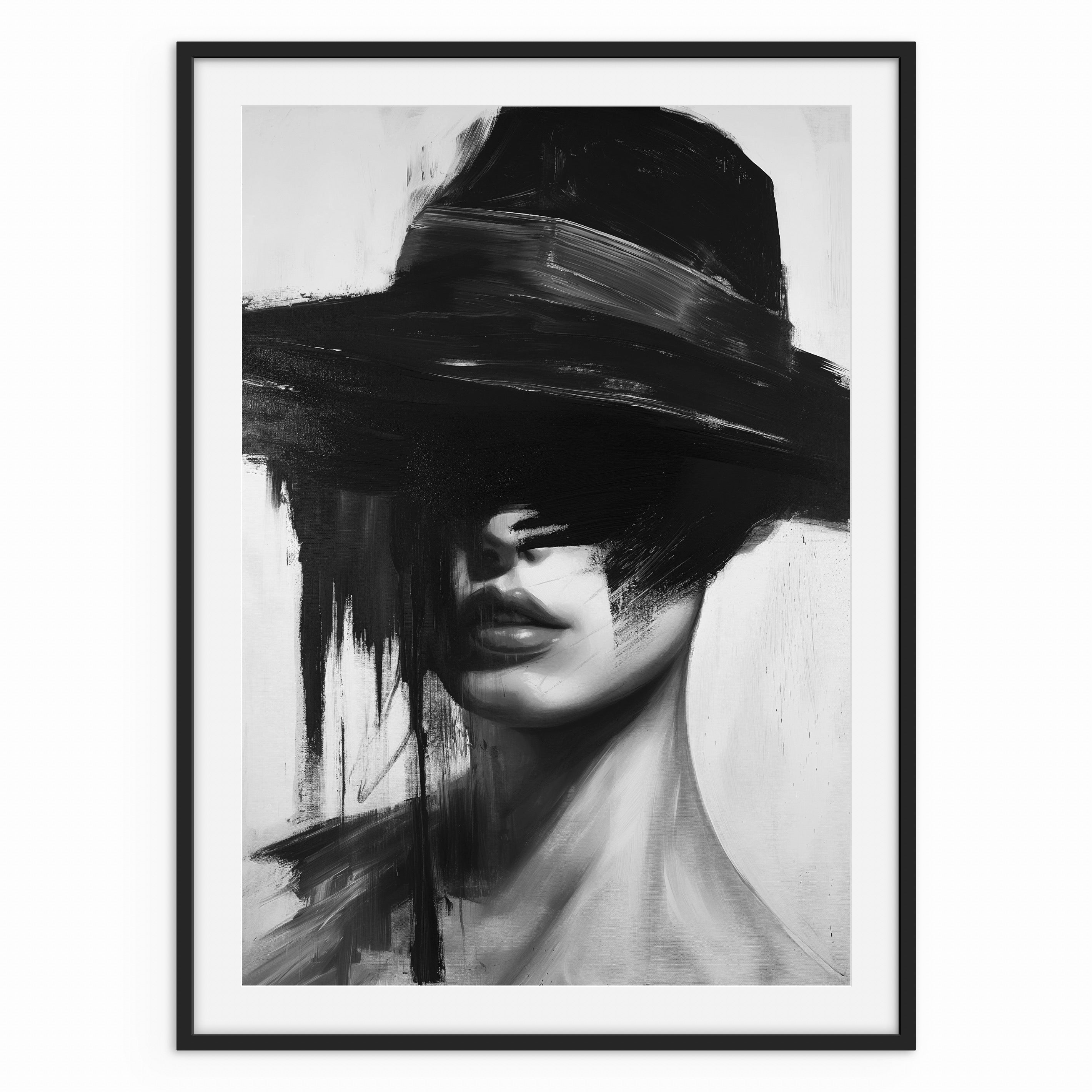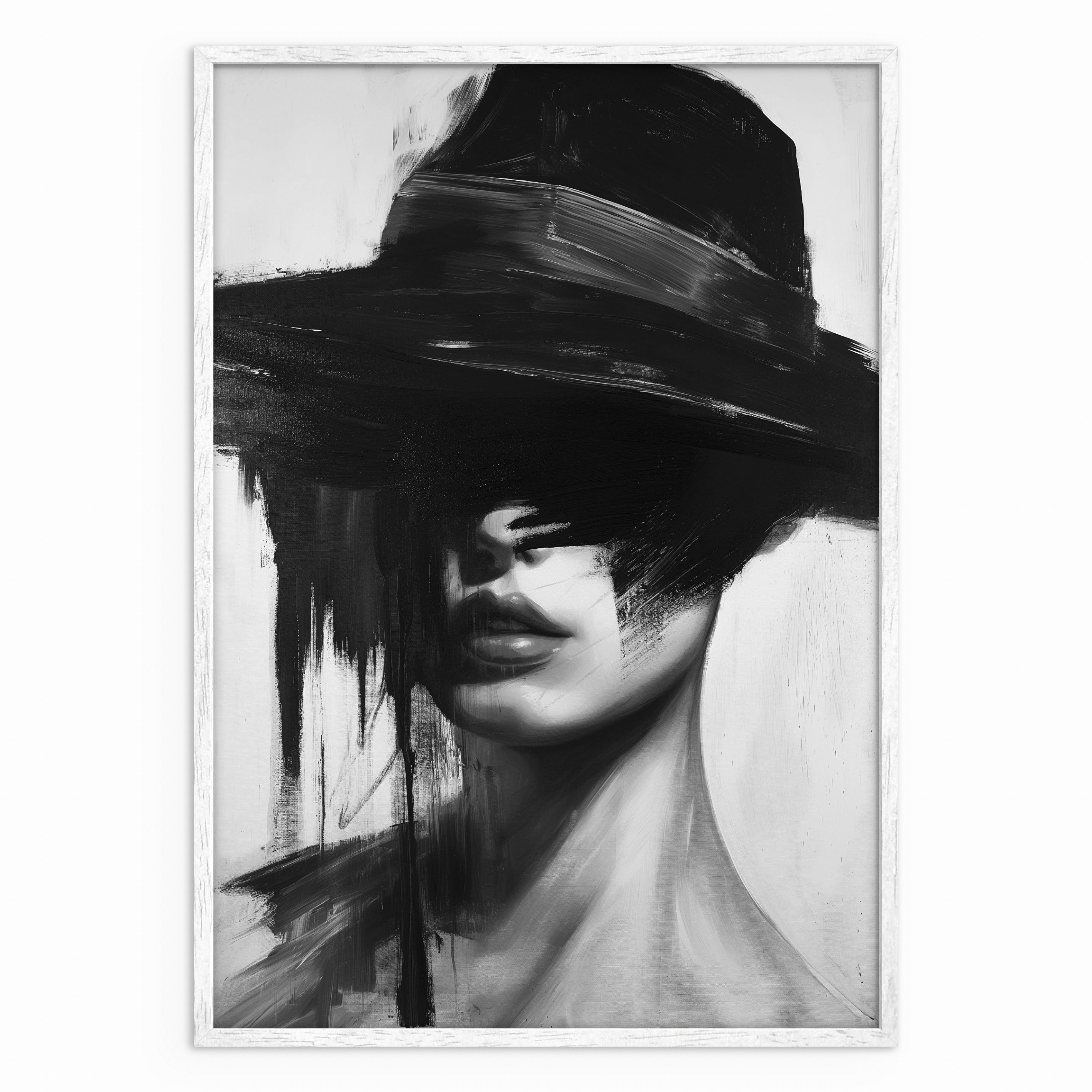 A monochrome portrait of a woman with her face partially concealed by bold, painterly strokes and a wide-brimmed hat. The contrast between soft skin tones and heavy black marks creates a sense of distance and anonymity. A strong, contemporary piece for modern interiors.