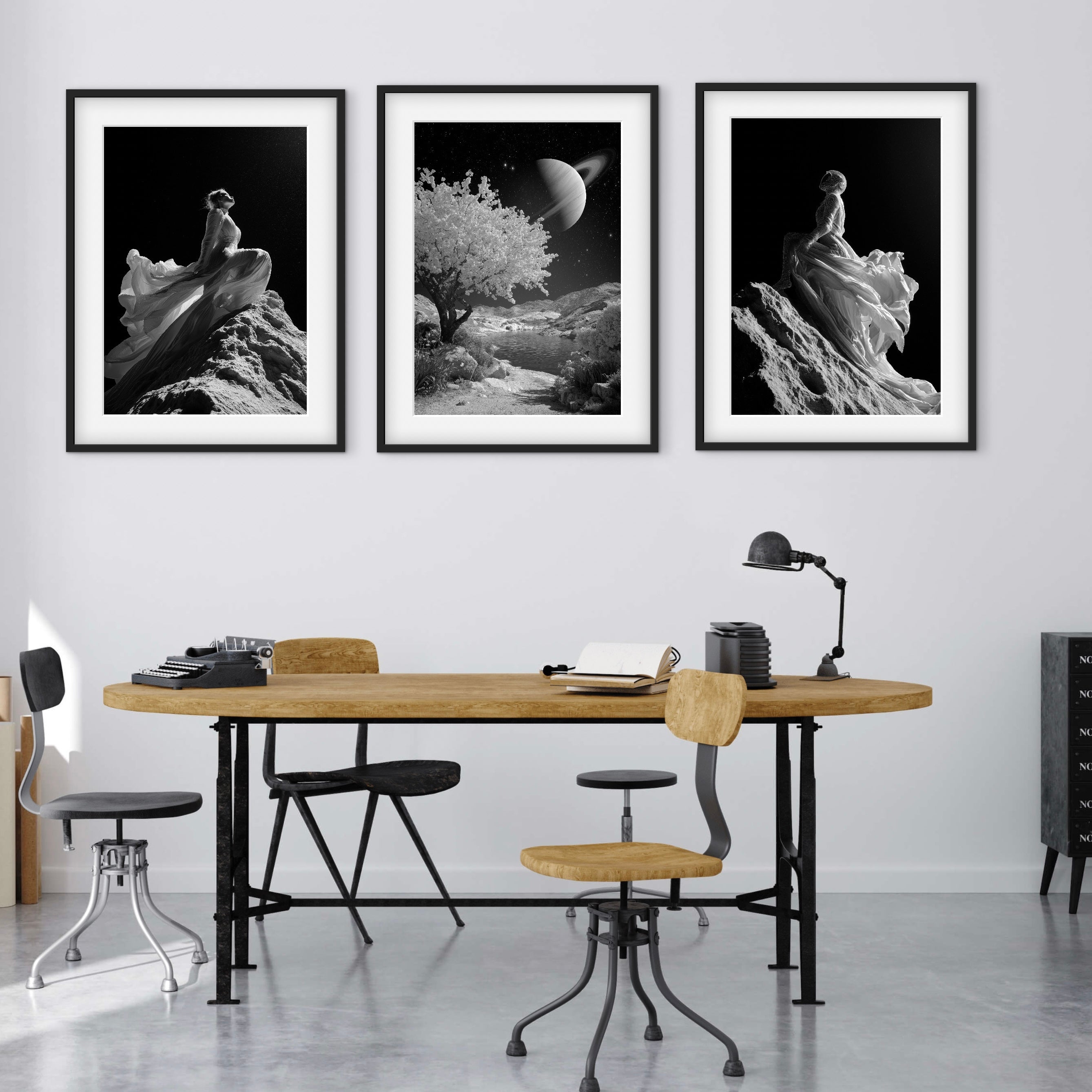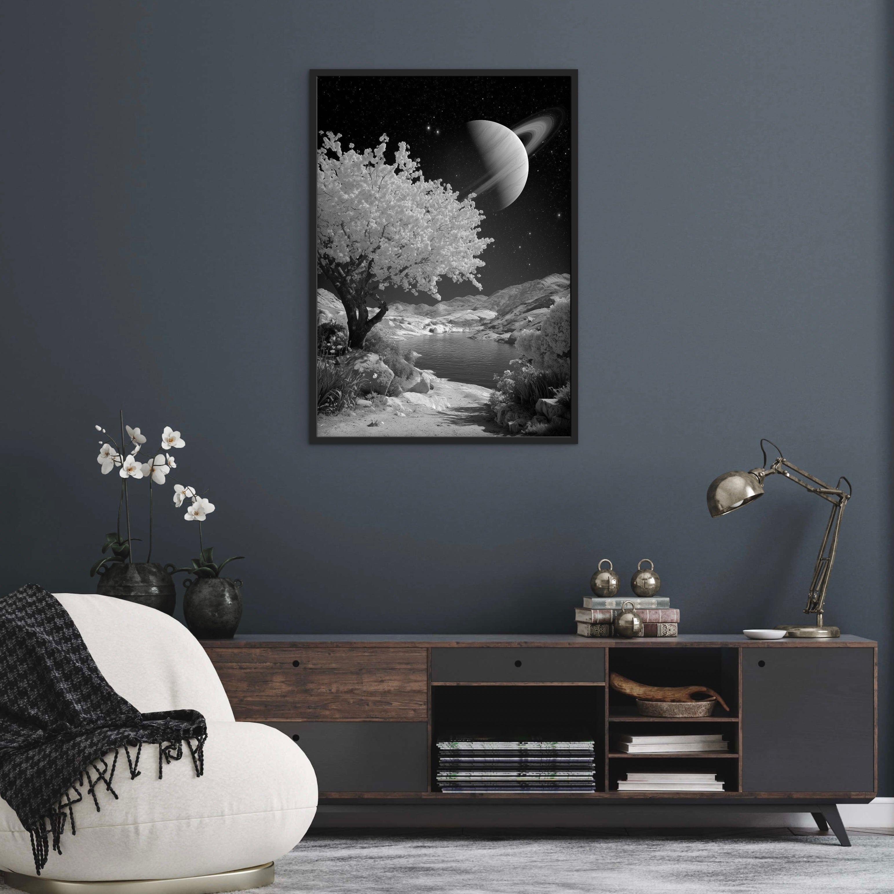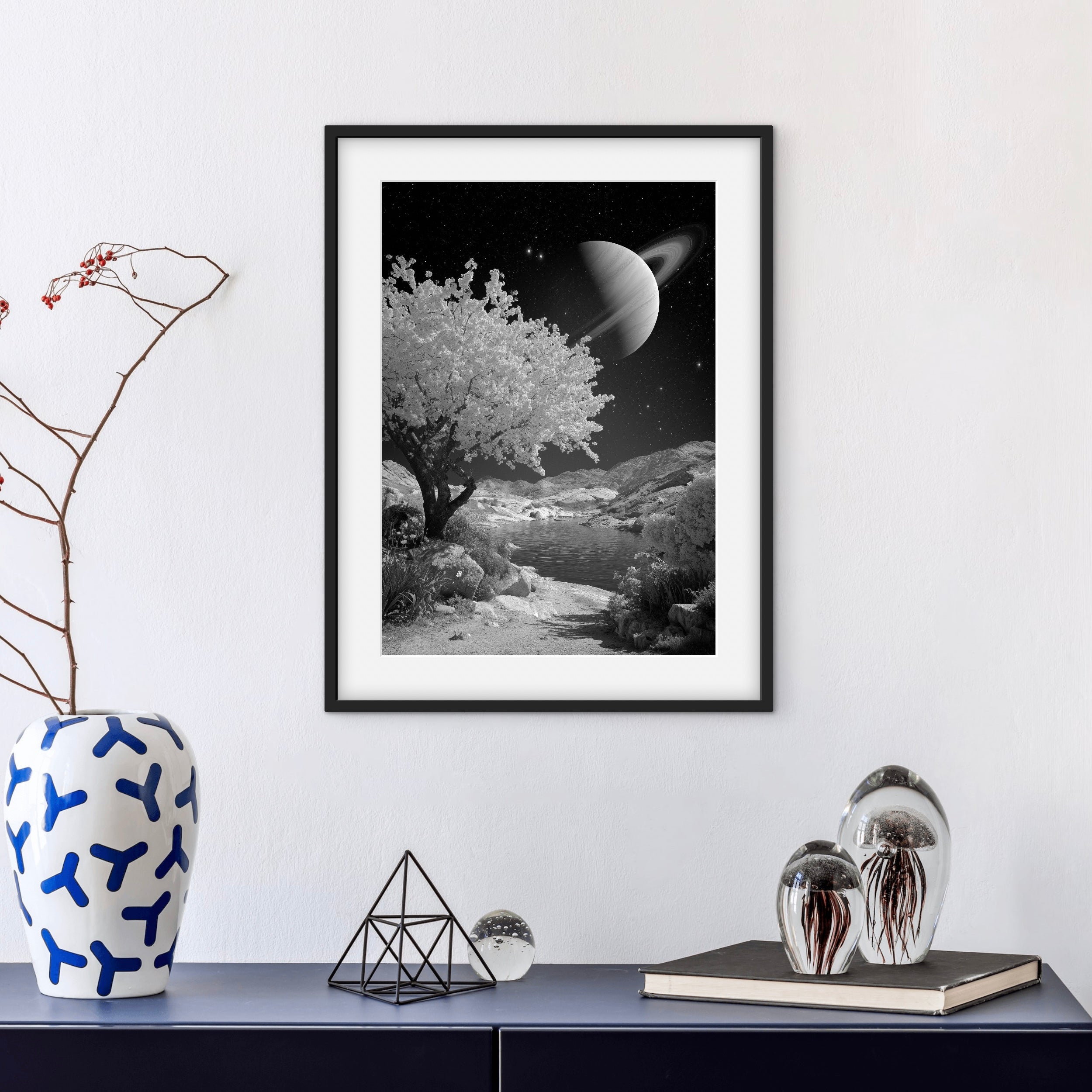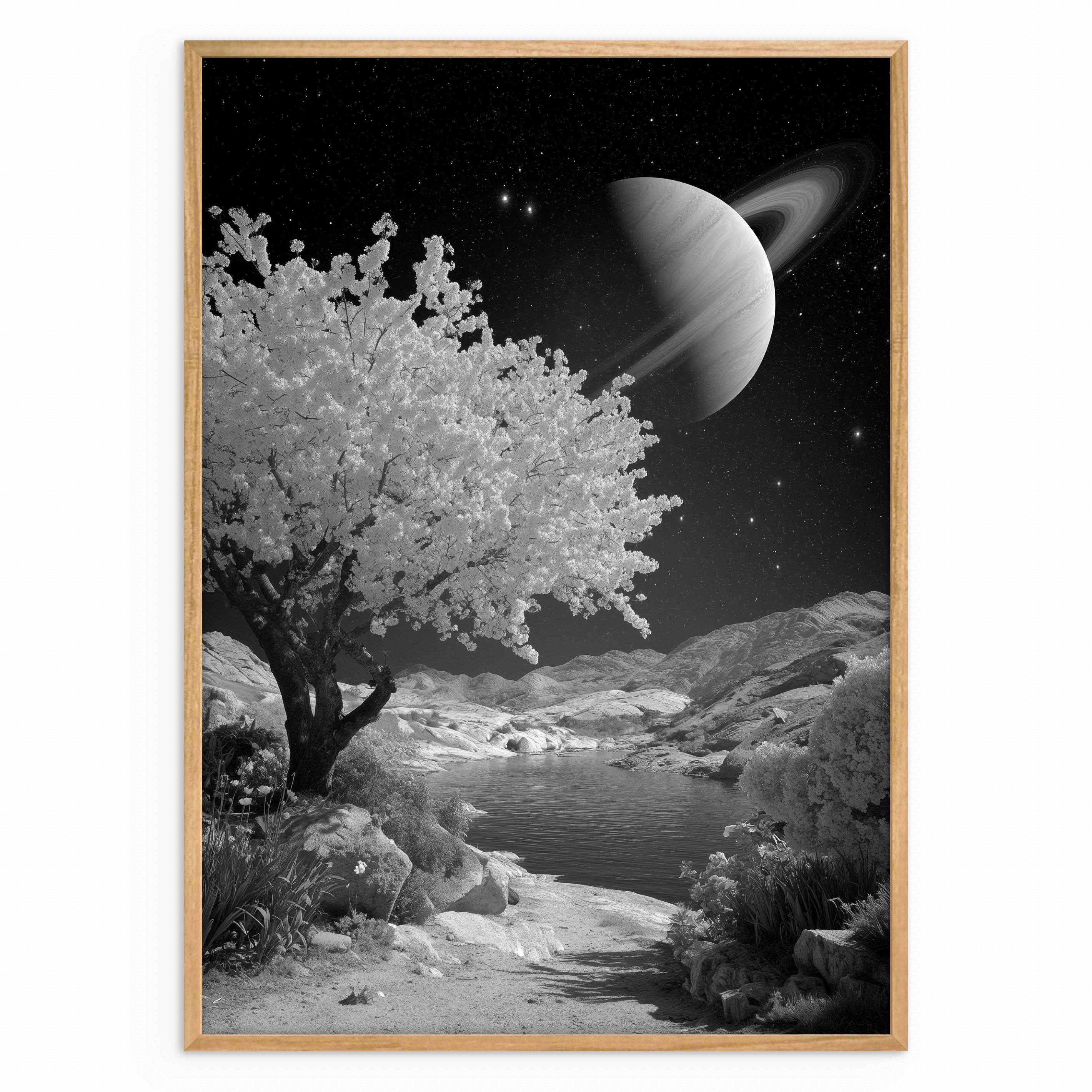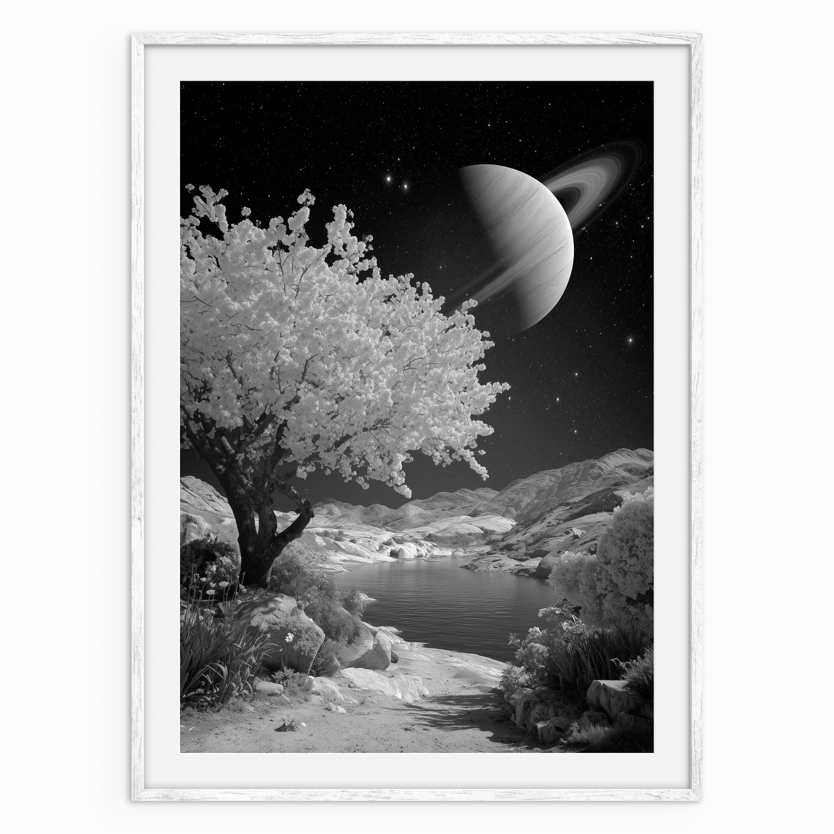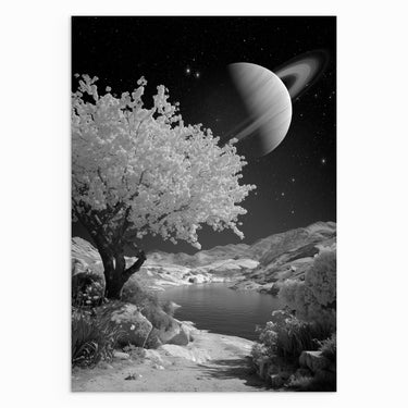 A monochrome landscape featuring a calm body of water framed by rocky terrain and a flowering tree beneath a large ringed planet. The scene merges celestial and natural elements, creating a sense of quiet isolation and scale. Ideal for contemporary and minimalist spaces.