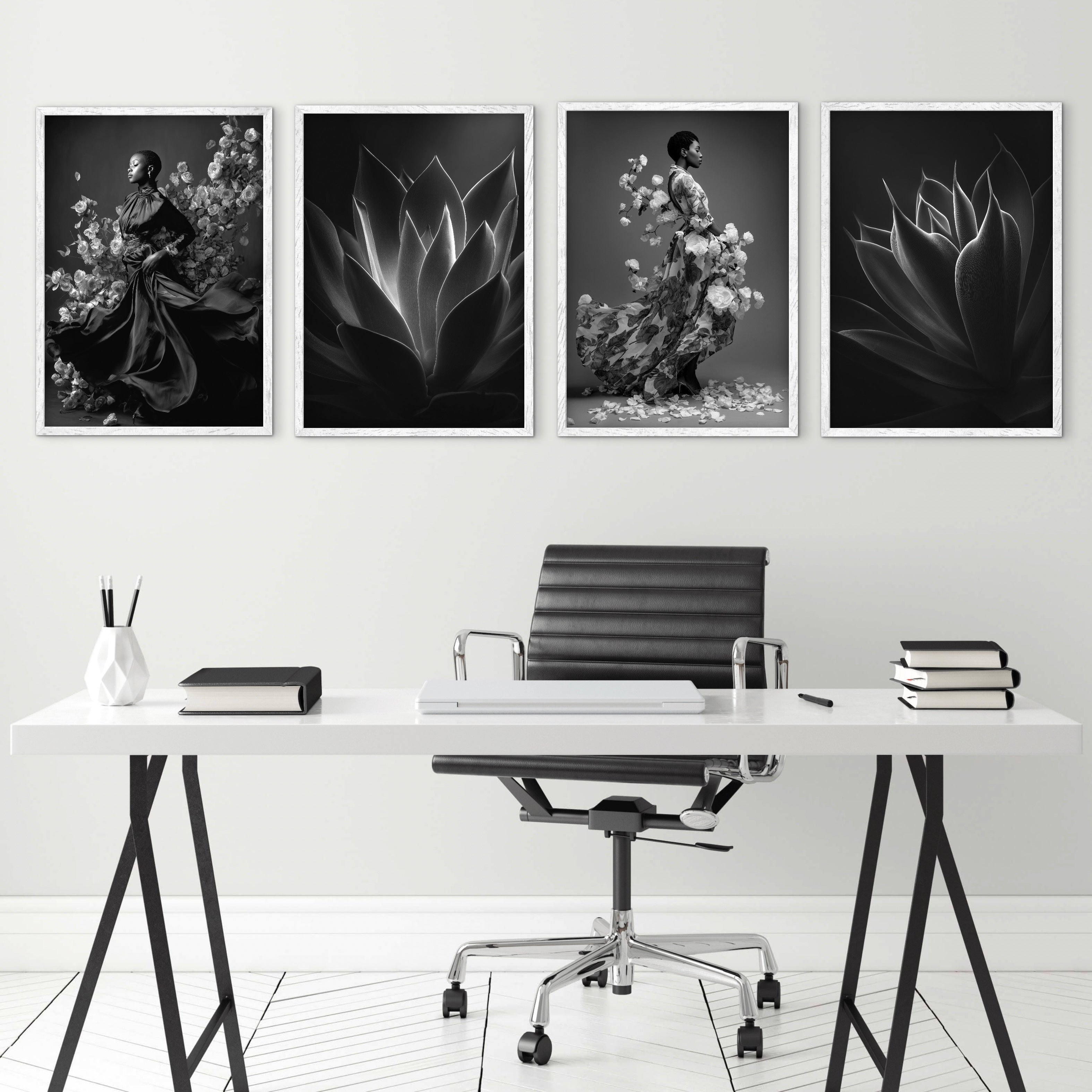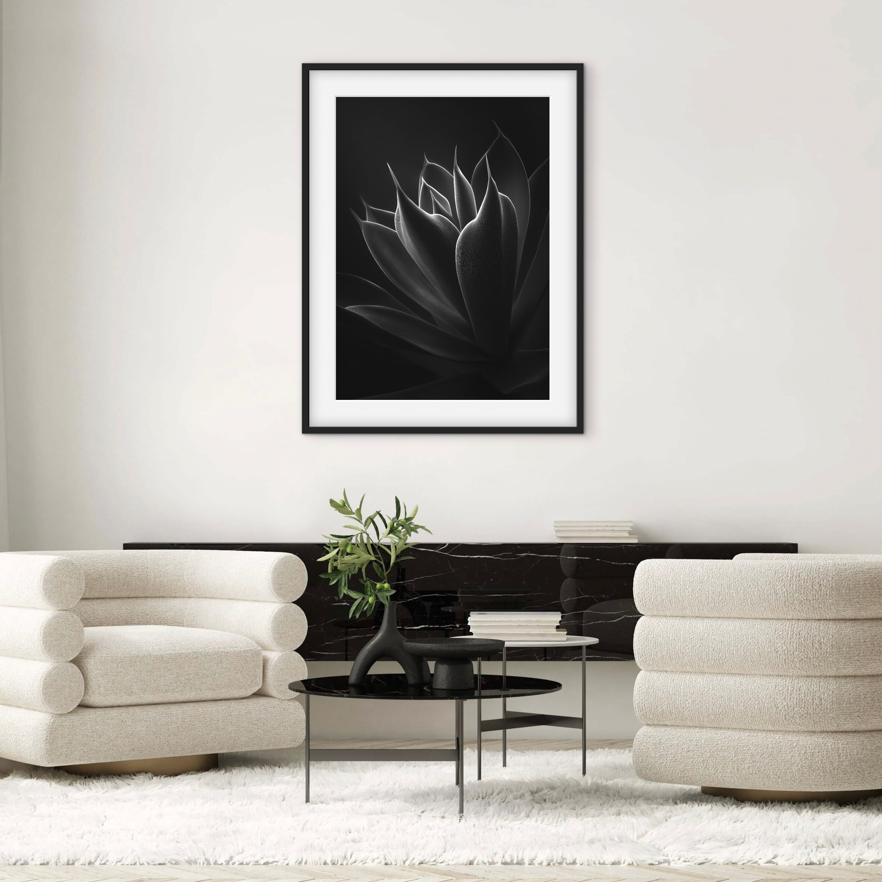 “Petals in Shadow” explores the layered geometry of a flower partially revealed by light. Fine lines and soft highlights create depth and movement, while the dark background enhances the sense of intimacy and focus. The artwork feels contemplative and refined, offering visual interest without overwhelming the space.