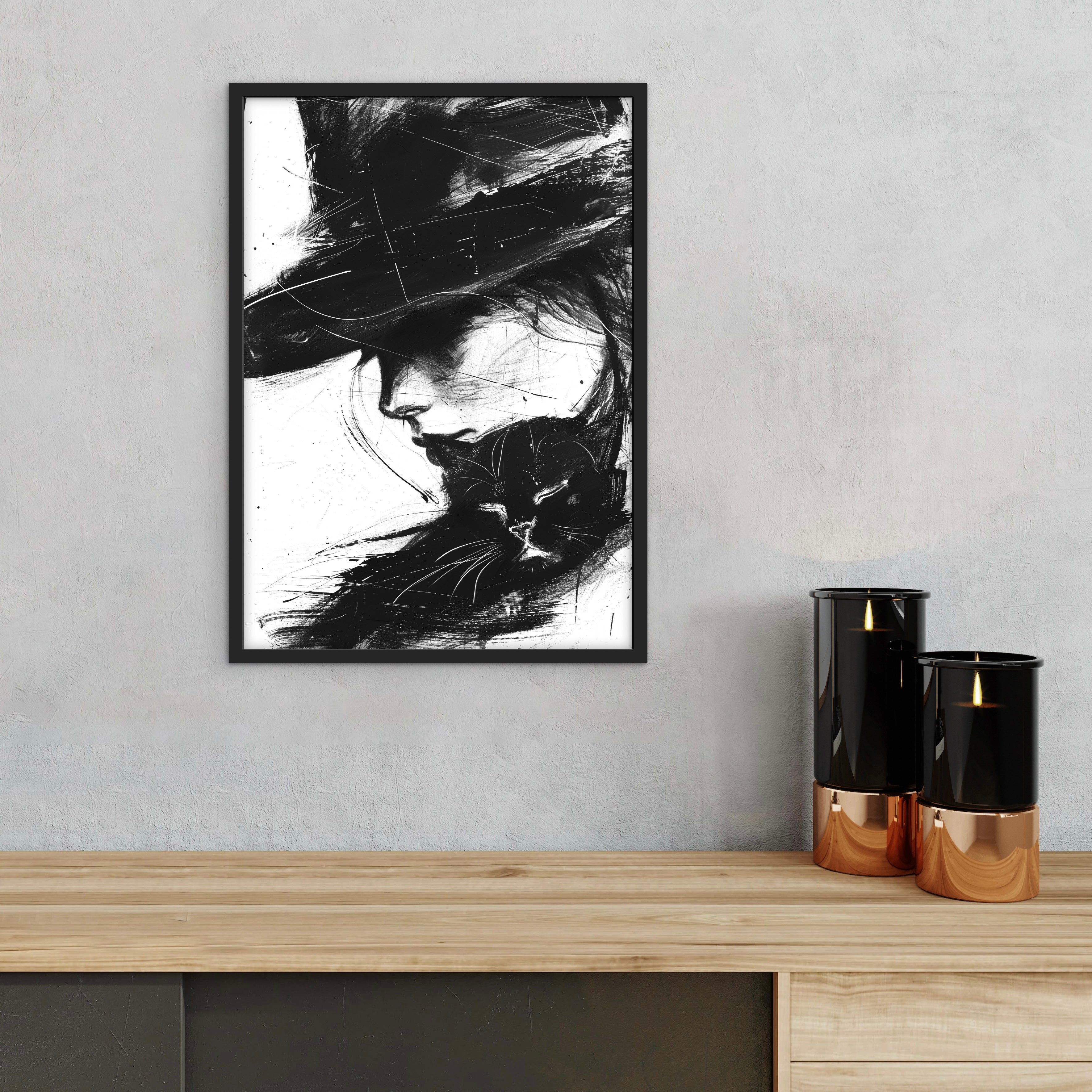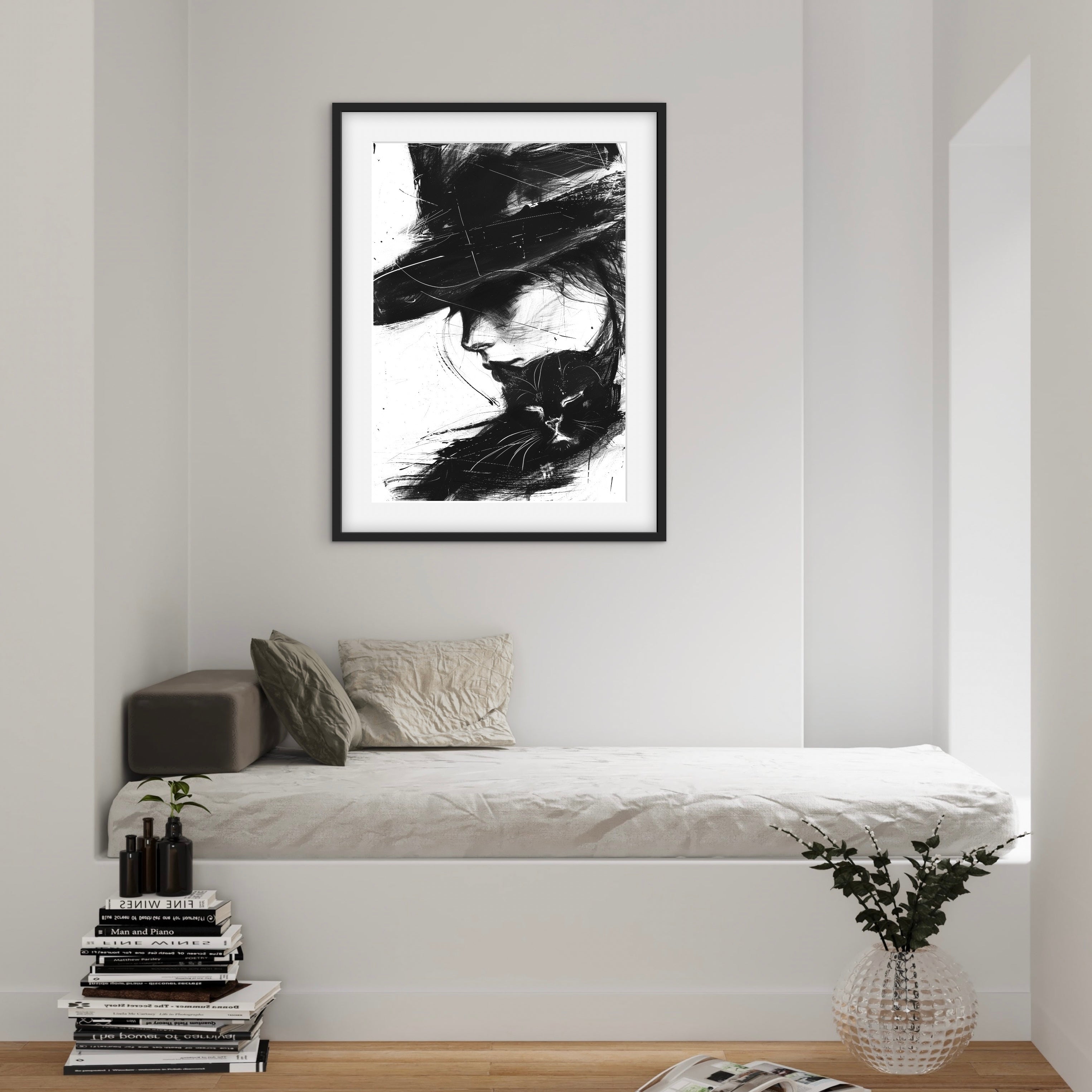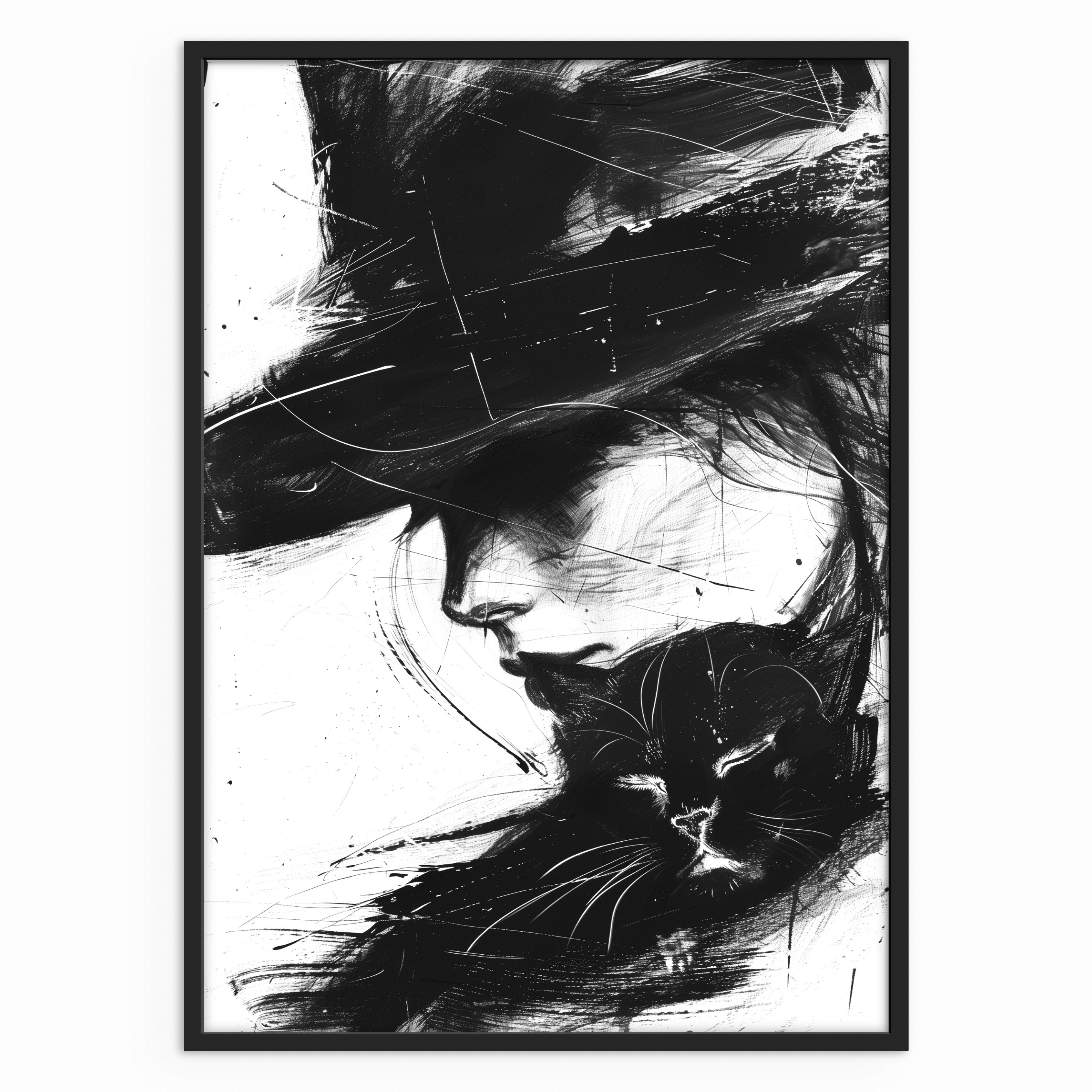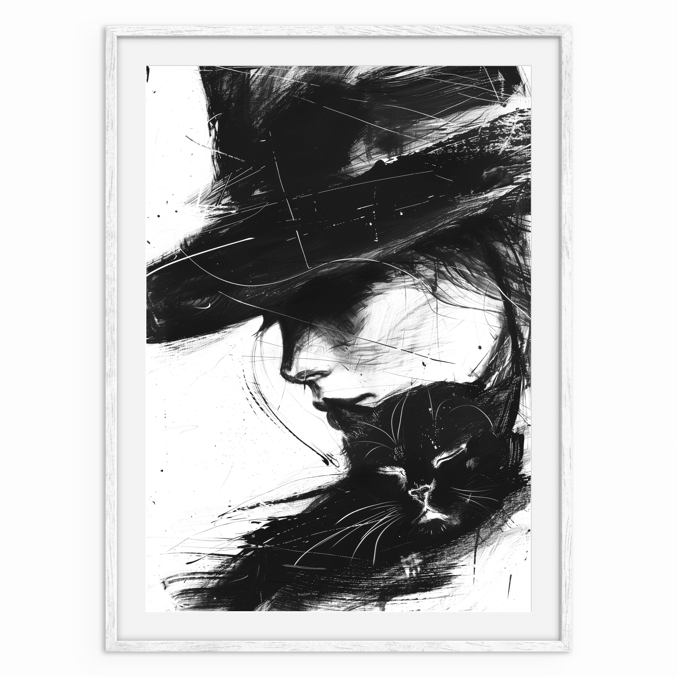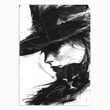 A black-and-white composition of a woman and a cat in a quiet, shared moment. Loose line work and soft shading give the piece a gentle, inward quality. Suits calm interiors and reflective spaces.