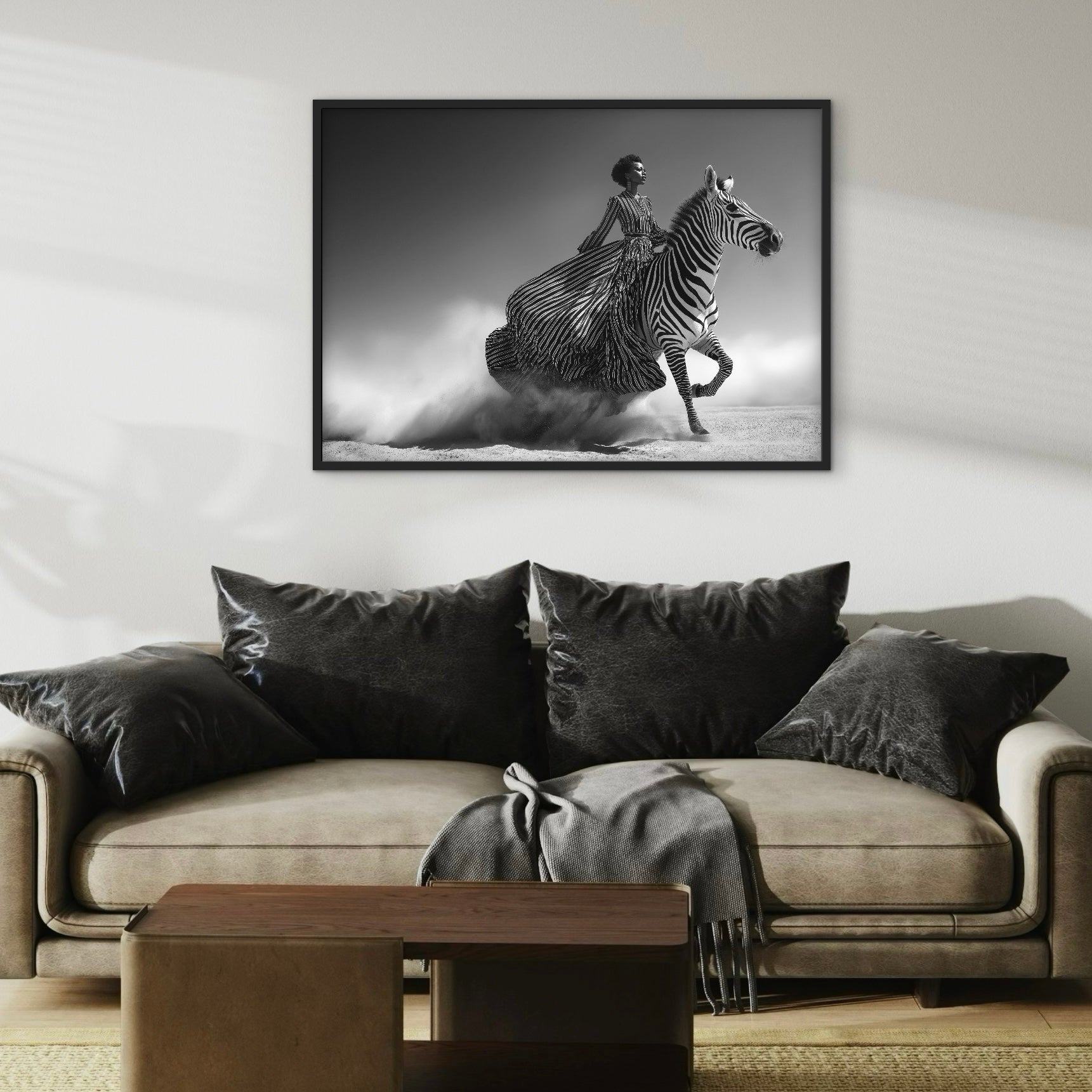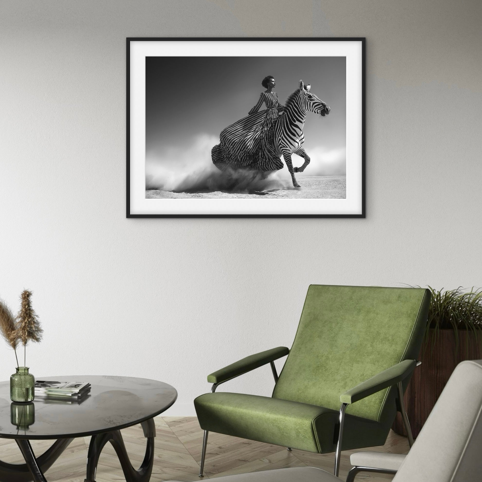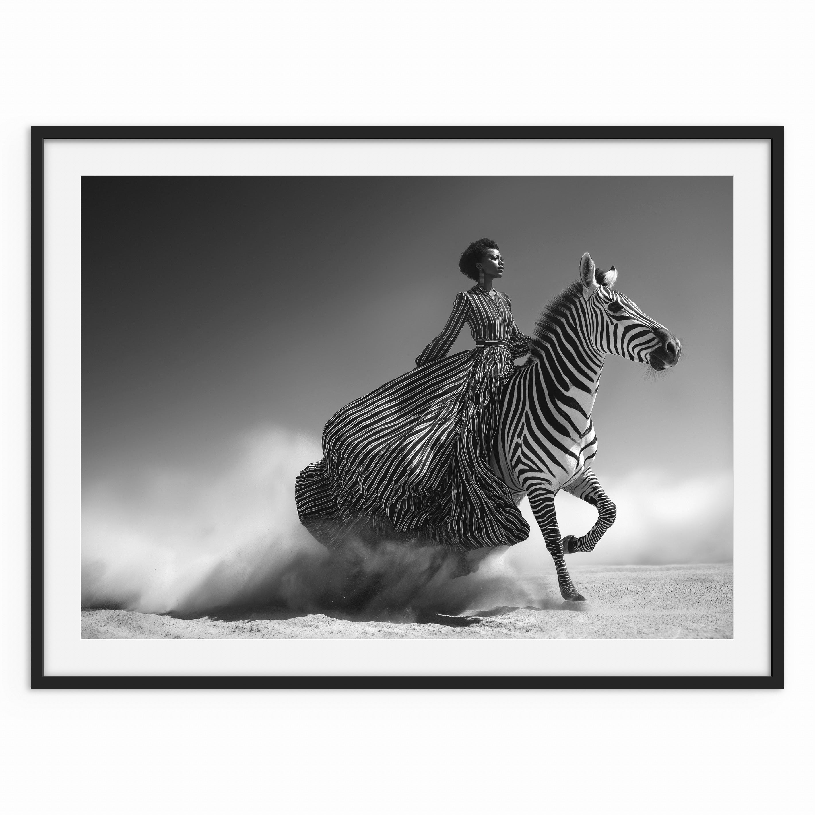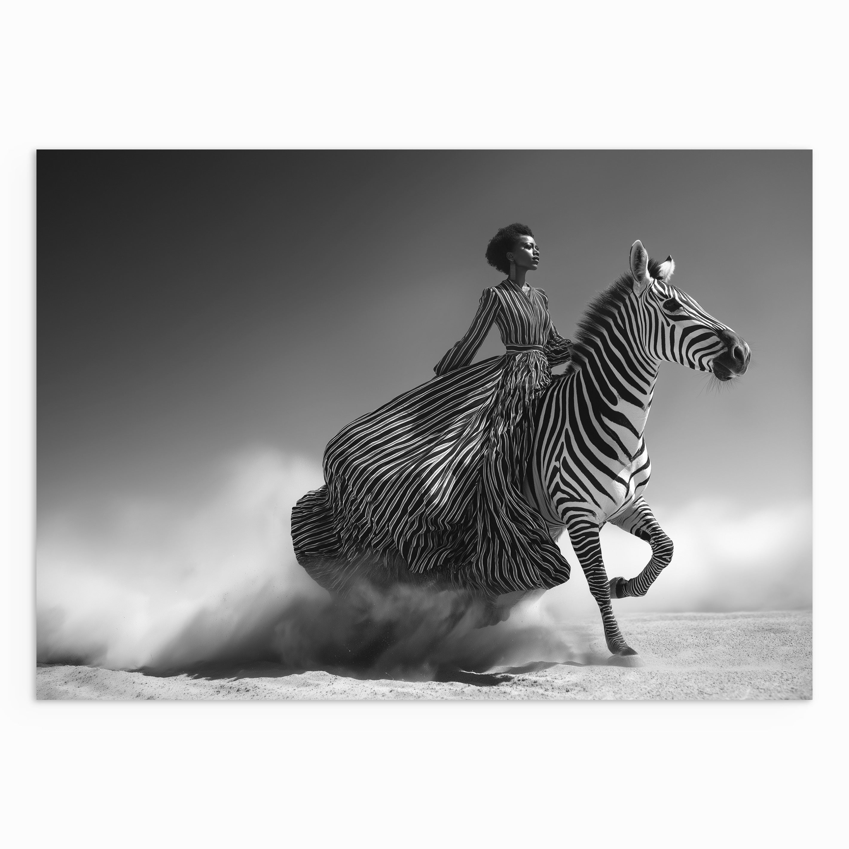 A striking black-and-white image of a woman riding a zebra across an open landscape, her striped dress flowing into the animal’s pattern. The scene blends fashion, movement, and symbolism, emphasising strength, control, and forward motion.