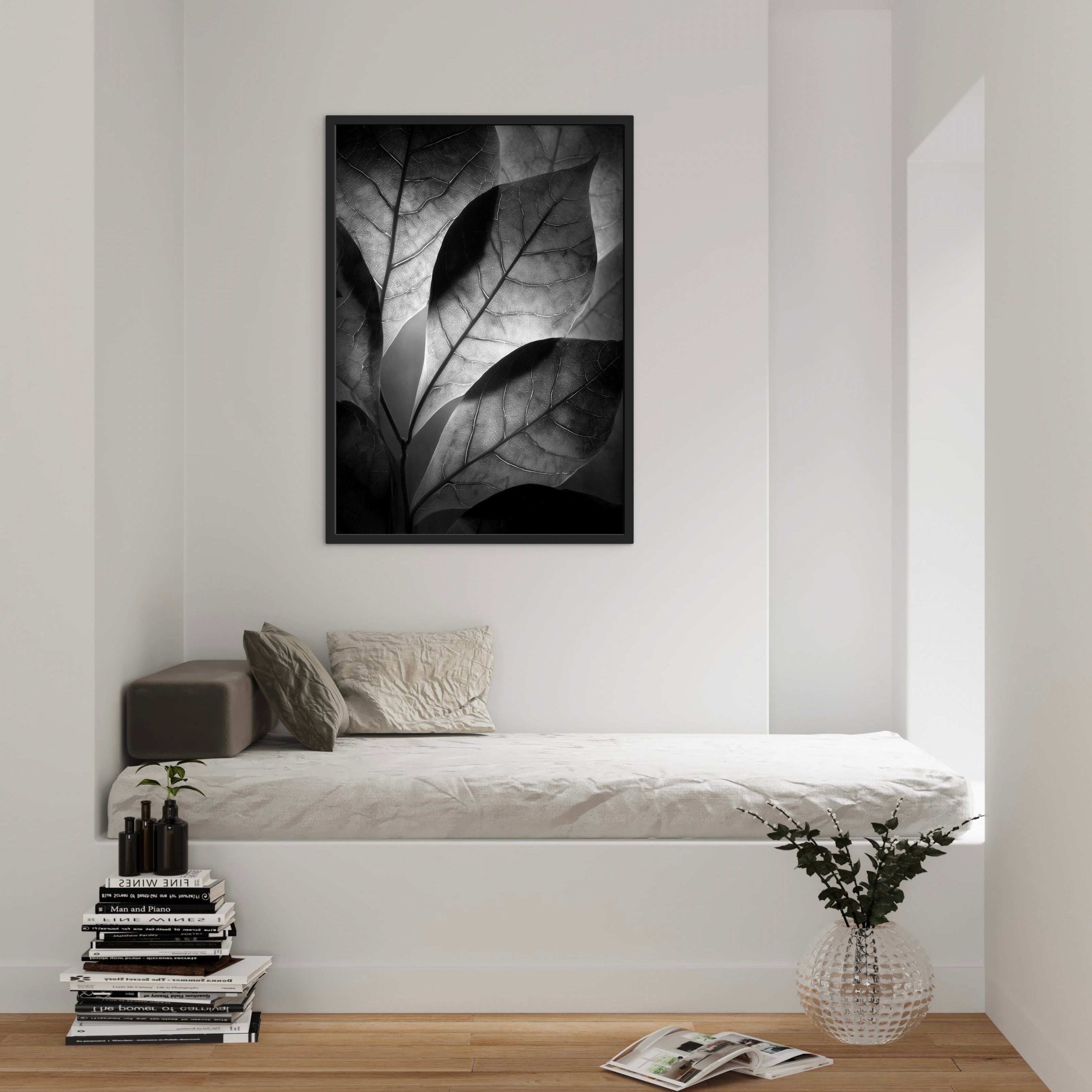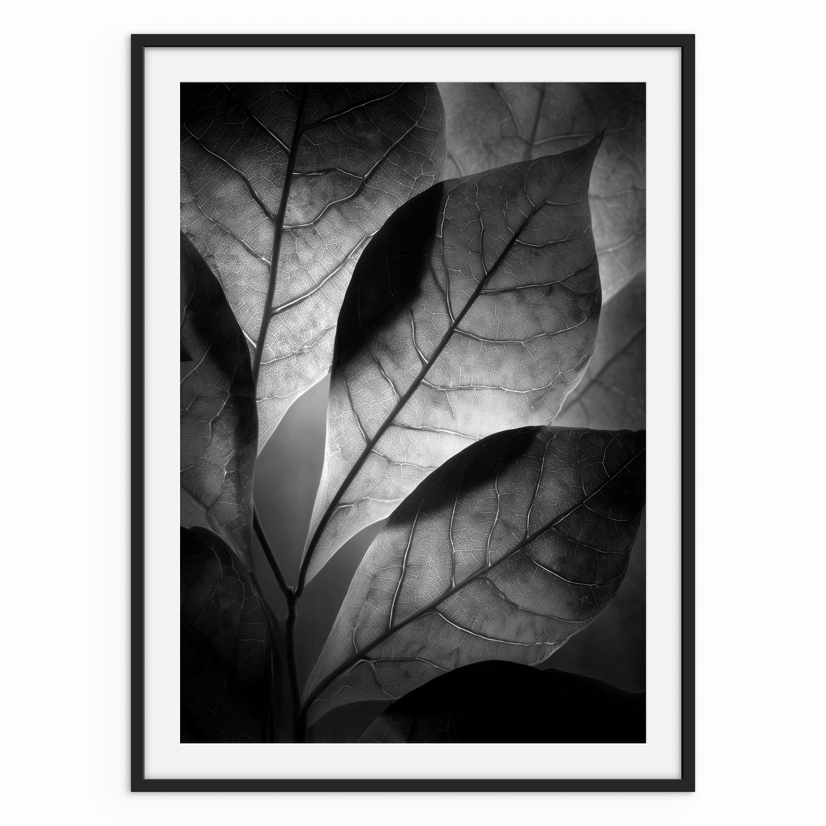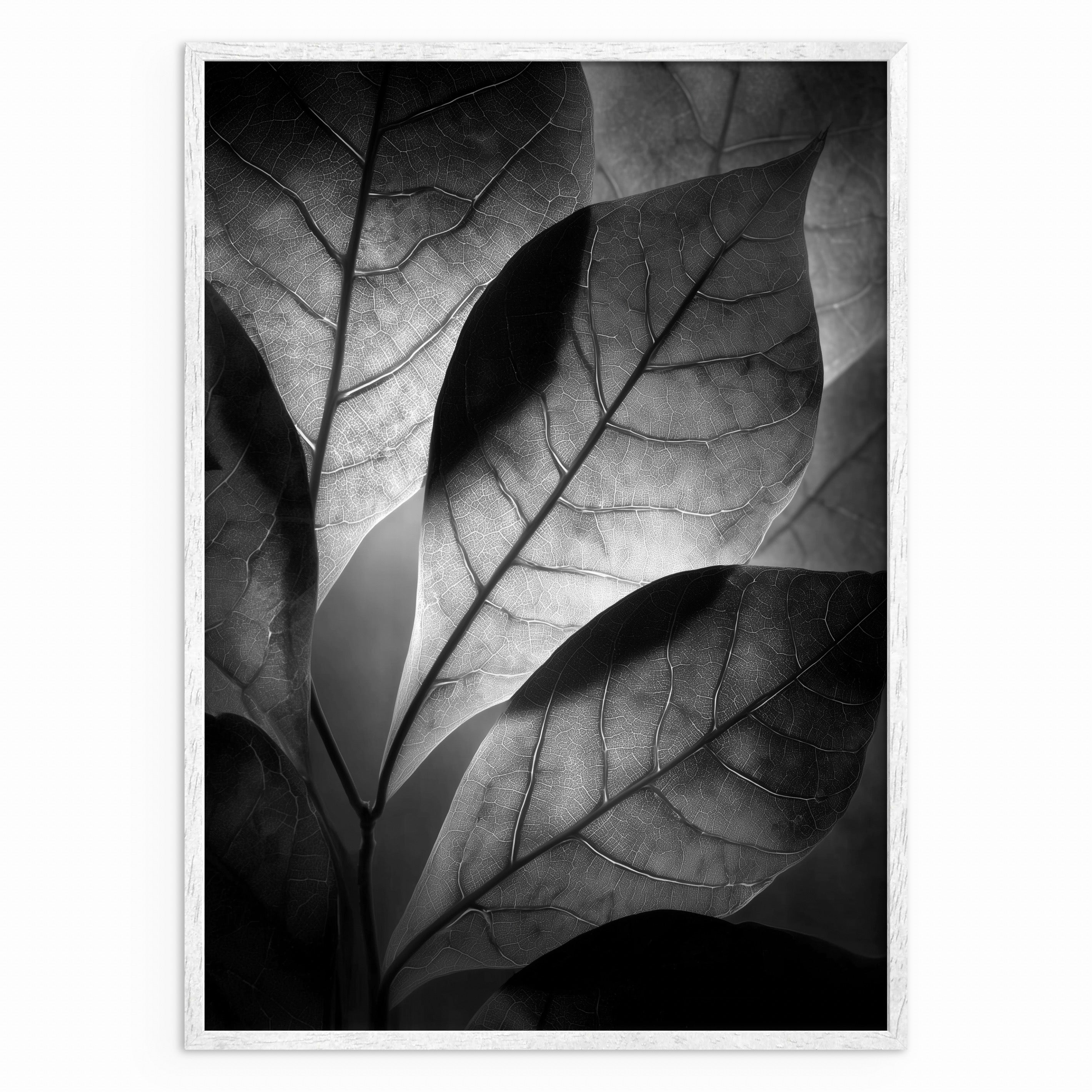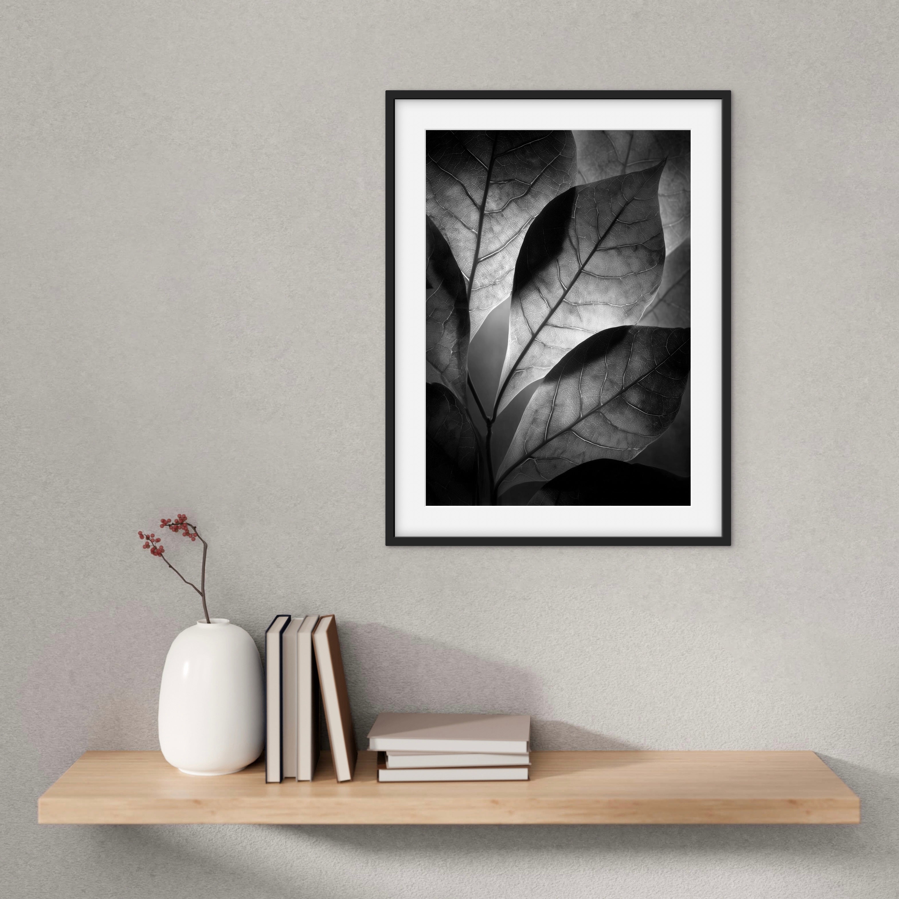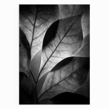 A close, layered view of leaves lit from behind, revealing fine vein structures and soft tonal shifts. The monochrome palette focuses attention on texture and form rather than colour. A subtle statement piece suited to calm, modern interiors.