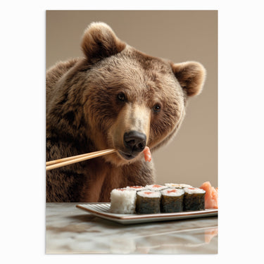 This adorable print portrays a bear delicately sampling sushi with chopsticks, offering a charming blend of wildlife and culinary art. The image brings together the unexpected combination of a bear dining on a sushi platter, making it a fun and quirky addition to any home. Ideal for kitchen decor or animal-themed spaces.