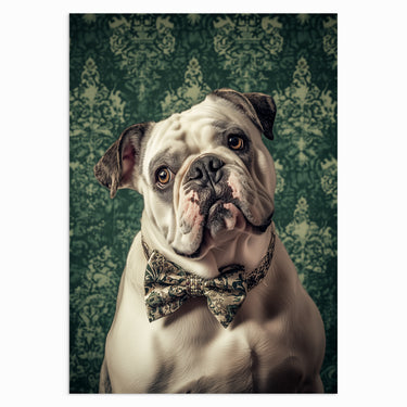 Bring a dose of charm to your walls with “Bulldog Charm,” showcasing a delightful bulldog with a floral bow tie set against a patterned green backdrop. The piece effortlessly combines the breed’s signature expressions with classic elegance, ideal for those who appreciate bulldog charisma and refined style.