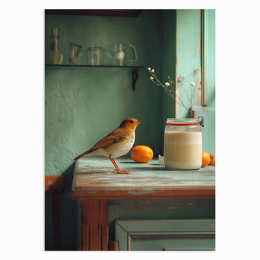 Country Morning Bird” captures the essence of a quiet morning in a country kitchen. A curious bird stands on a rustic wooden table, observing a jar of creamy goodness. The warm tones of the setting and the gentle sunlight evoke a sense of nostalgia and tranquility, making this piece a perfect addition to country-style kitchens or cosy living spaces.