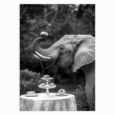 Join this delightful elephant as it enjoys a refined afternoon tea in a tranquil forest setting. This black-and-white artwork adds a playful, yet elegant touch to any room, making it ideal for animal lovers who enjoy a touch of humor in their décor.
