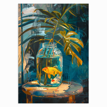 “Golden Companions” is a vibrant and lively piece that brings the charm of nature into your home. The artwork features two goldfish swimming gracefully in a glass jar, surrounded by lush green leaves. The vivid colors and intricate details make this print a perfect addition to any room, adding a touch of warmth and serenity.