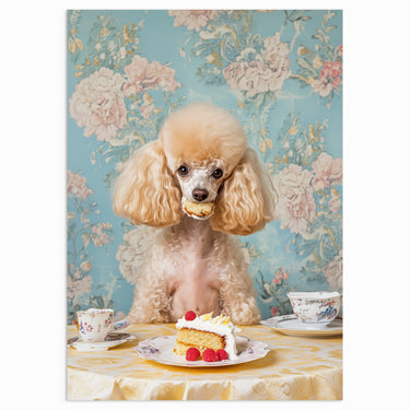 “Poodle’s Perfect Pastry” captures a charming moment of elegance as a stylish poodle enjoys a slice of cake, set against a beautiful floral background. This adorable wall art brings a touch of whimsy to any dining room or kitchen.