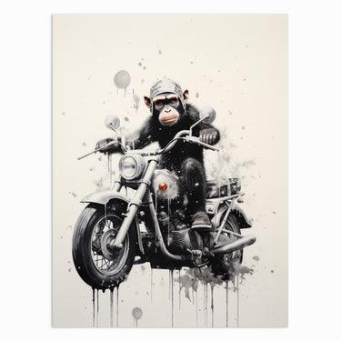 Embrace your wild side with “Rebel Rider,” a playful and rebellious artwork featuring a chimpanzee confidently riding a motorcycle. The combination of monochrome tones with splashes of ink adds a modern and edgy vibe to this piece, making it a fun addition to any room. Perfect for those who appreciate art with a sense of humor.