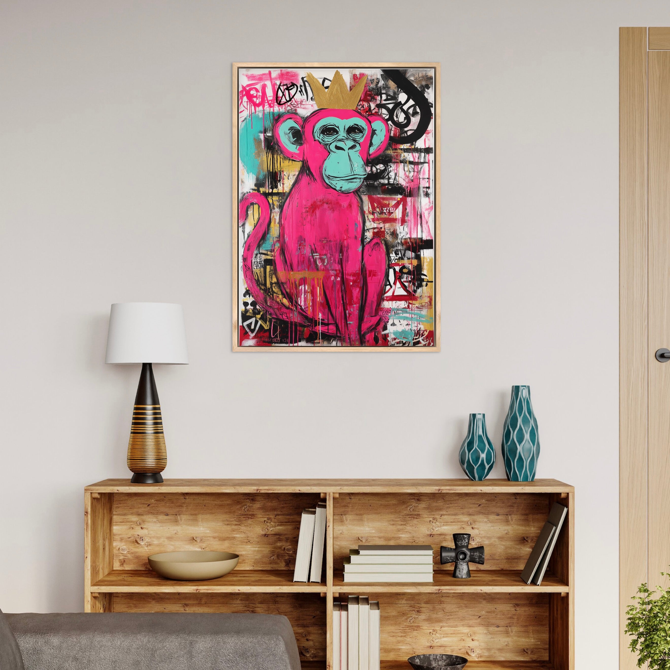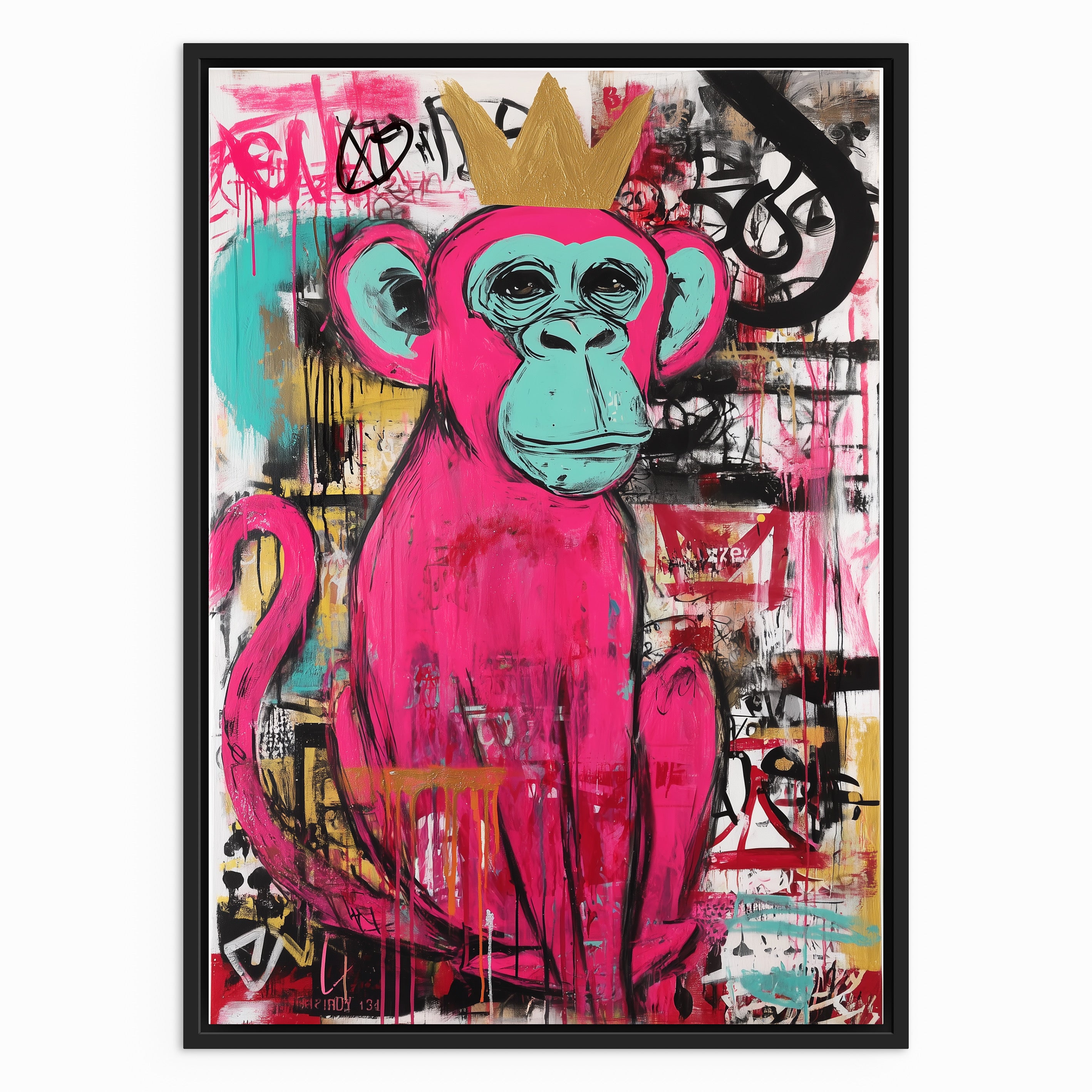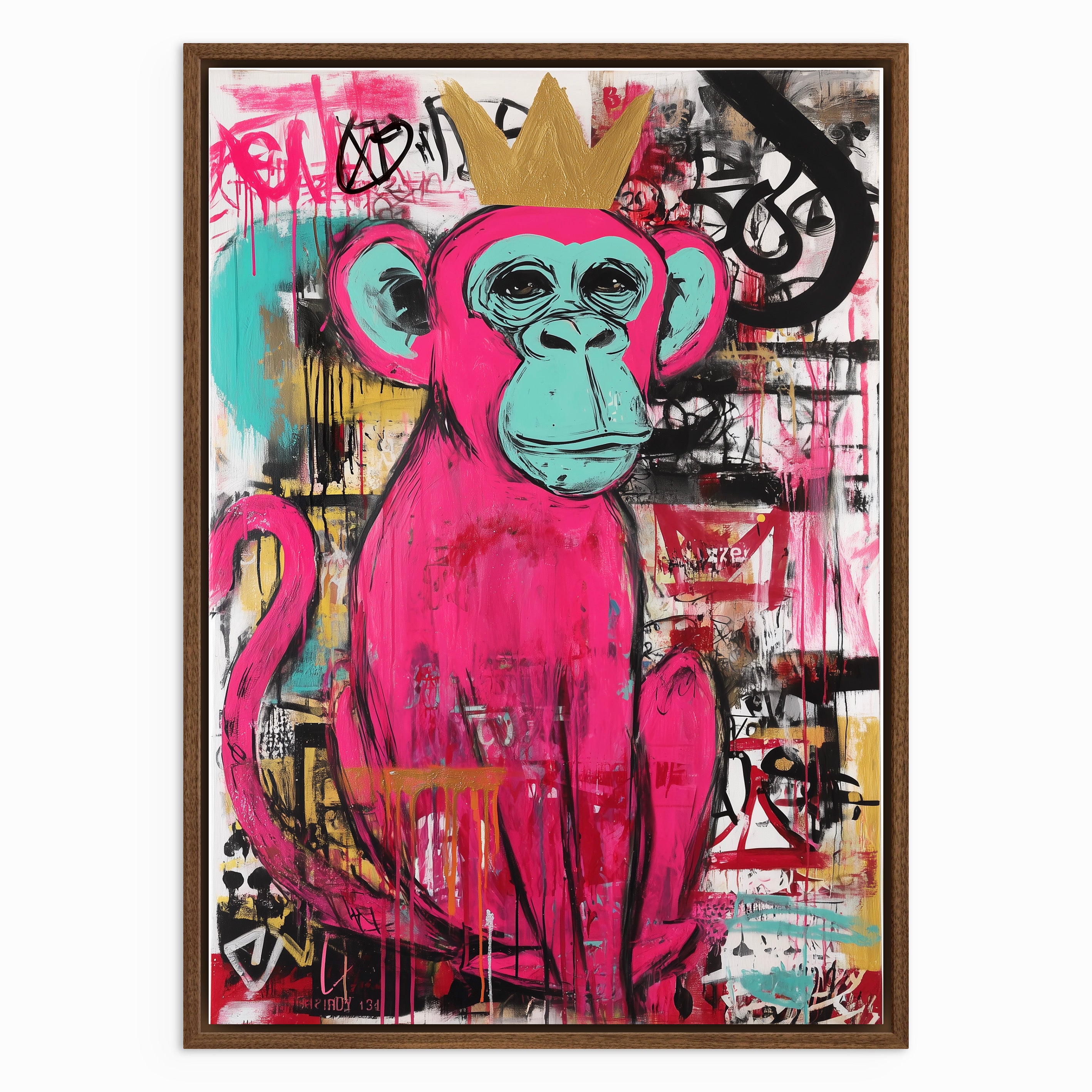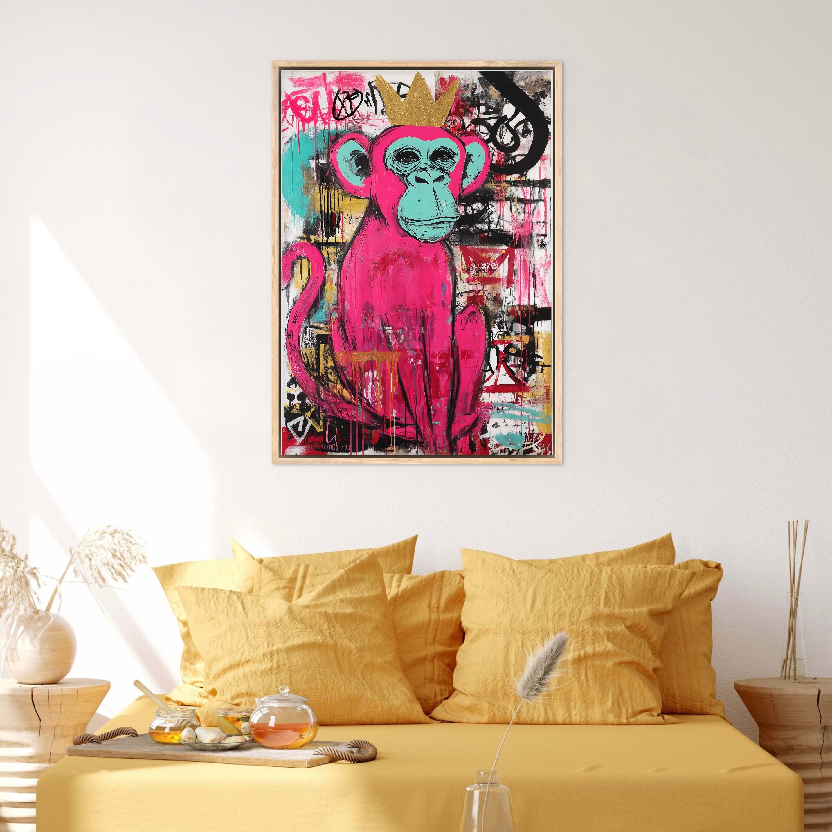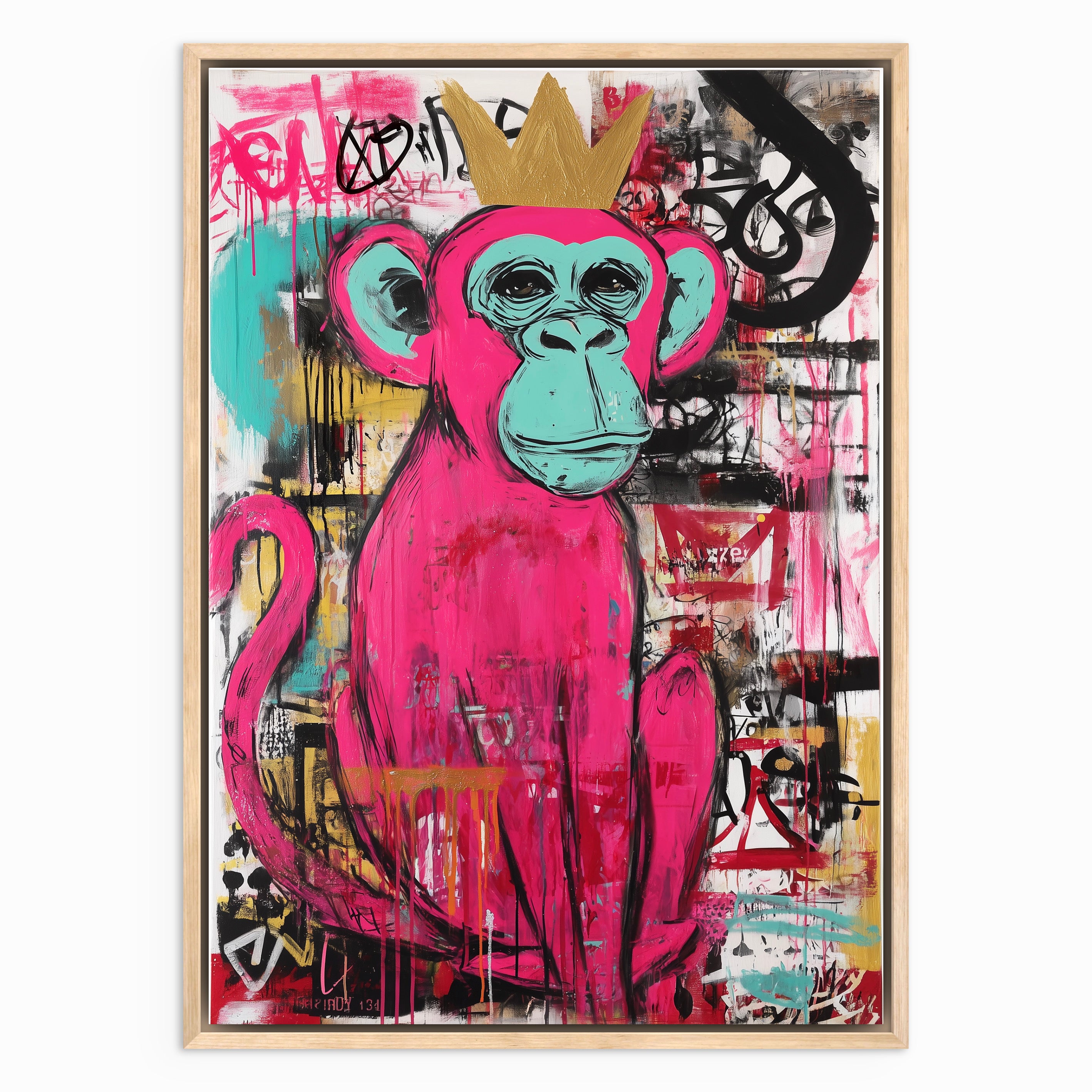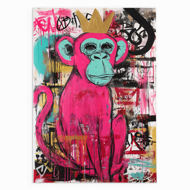 “The Graffiti King” captures the playful spirit of street art through a bold pink monkey crowned in gold. Set against an expressive background of layered paint drips, graffiti marks, and urban textures, the piece balances humour with attitude. The vibrant colours and confident character make the artwork feel lively and rebellious, celebrating individuality and creative freedom. Perfect for modern interiors, this piece adds energy, colour, and a touch of urban royalty to any wall.