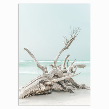 “Driftwood Shores” showcases a beautifully weathered piece of driftwood resting on a pristine beach. The soft pastel tones of the sea and sky merge harmoniously, creating a peaceful and calming atmosphere for any coastal-themed interior.