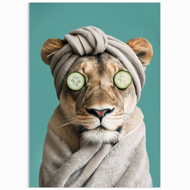 Add a touch of humour to your bathroom with 'Luxury Lioness,' a playful portrait of a lioness indulging in a spa day. With cucumber slices over her eyes and a tranquil expression, this artwork captures the regal feline in a moment of pure relaxation. Perfect for bringing a smile to your face and a bit of fun to your space.