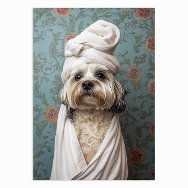 Elevate your space with this charming artwork featuring a stylish Shih Tzu wrapped in a fluffy white towel, exuding an air of relaxed elegance. The soft pastel background adds a touch of warmth, making this print perfect for dog lovers and those who appreciate a whimsical touch in their decor. Whether displayed in a bathroom, bedroom, or living area, this artwork will bring a smile to your face every time you see it.