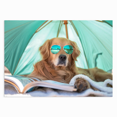 “Cool Canine Chill” showcases a laid-back golden retriever lounging under a beach umbrella, complete with sunglasses, embodying the ultimate relaxed beach day vibe. Perfect for dog lovers and beach enthusiasts alike, this fun and quirky print will add a playful and relaxing atmosphere to any room.