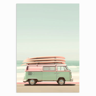 Embark on a nostalgic journey with “Retro Ride.” Featuring a pastel-coloured vintage van loaded with surfboards, this print brings a retro beach vibe to your home. Perfect for adding a laid-back, summery feel to any room.