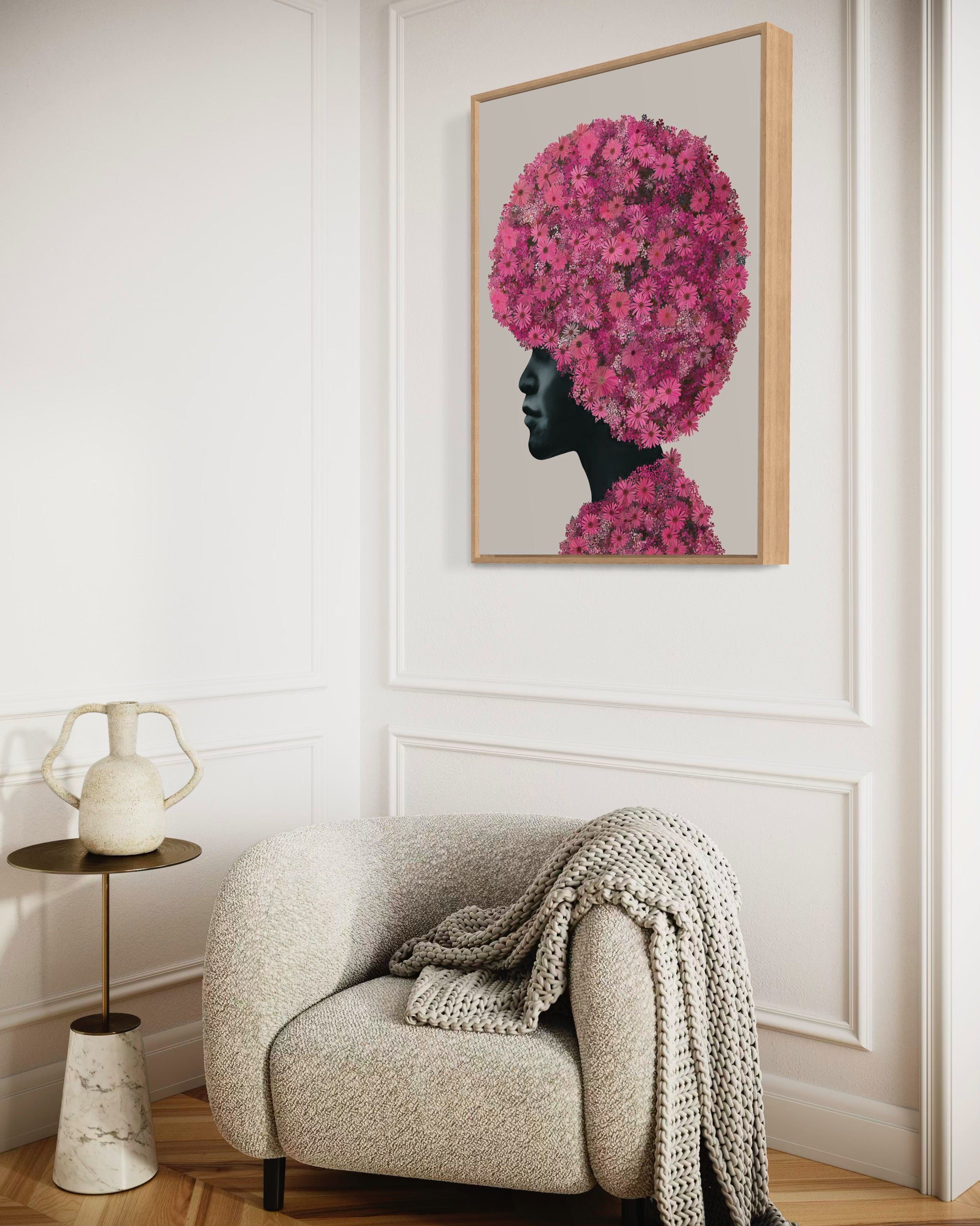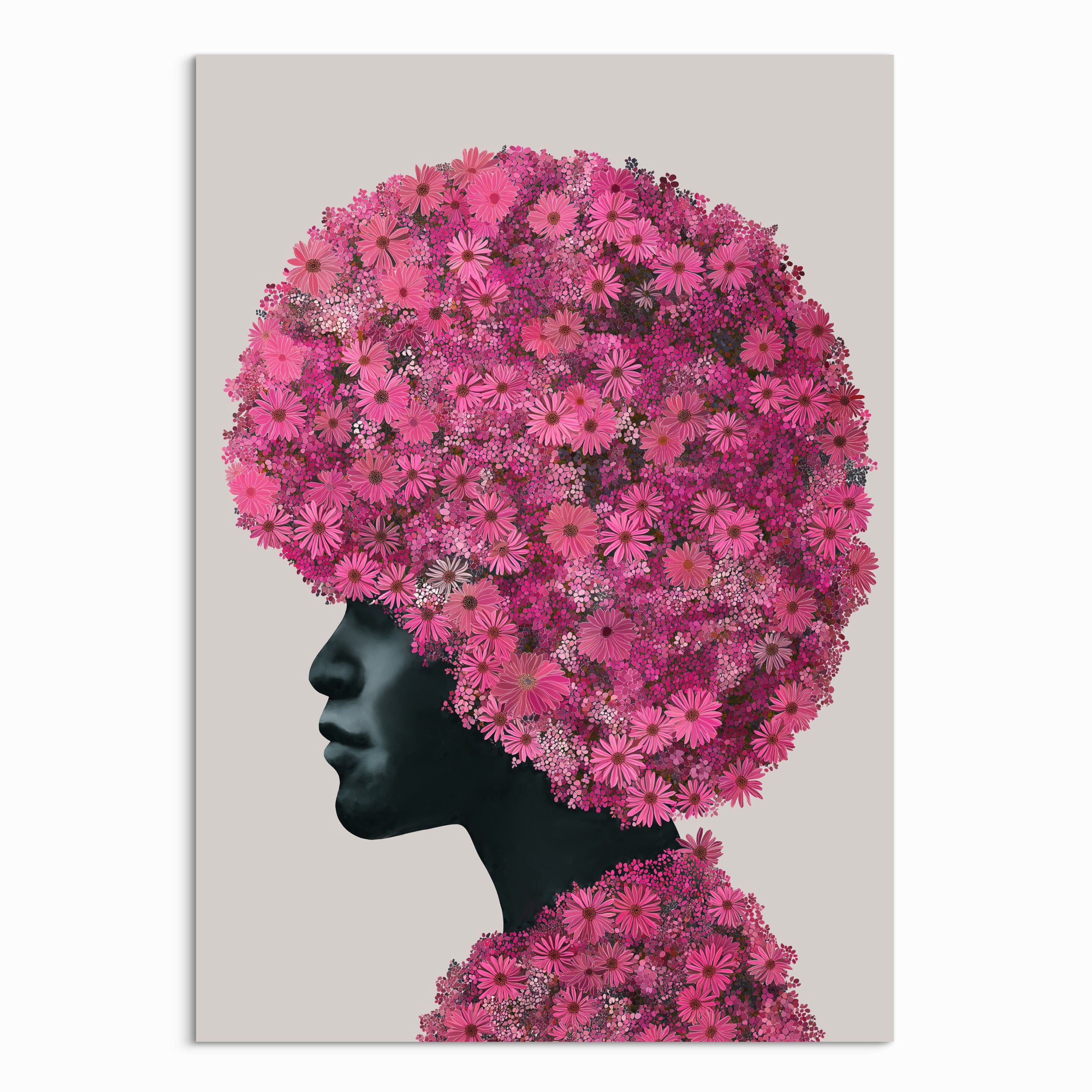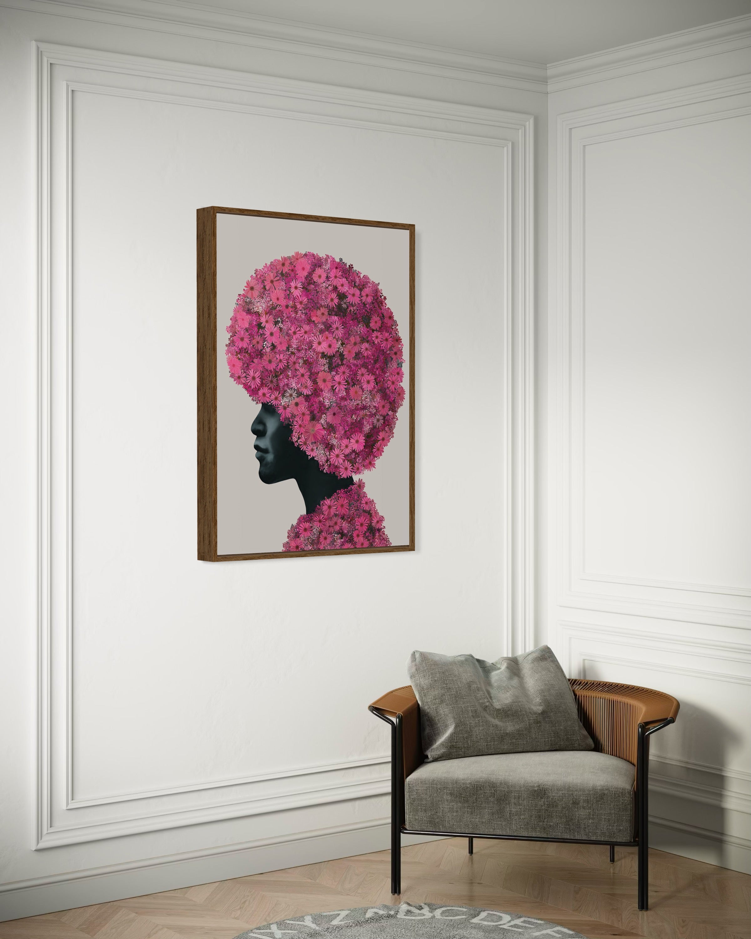 Celebrate bold beauty and empowerment with “Flora Crown,” a striking portrait that fuses botanical elegance with Afro-futuristic flair. This stunning silhouette of a woman is adorned with an afro made entirely of vivid pink flowers, creating a powerful visual statement of identity, femininity, and nature’s harmony. With a clean neutral background, the vibrant floral textures take centre stage — perfect for modern interiors, statement walls, or art lovers seeking pieces that celebrate culture and style. Ready to hang and printed on premium canvas.