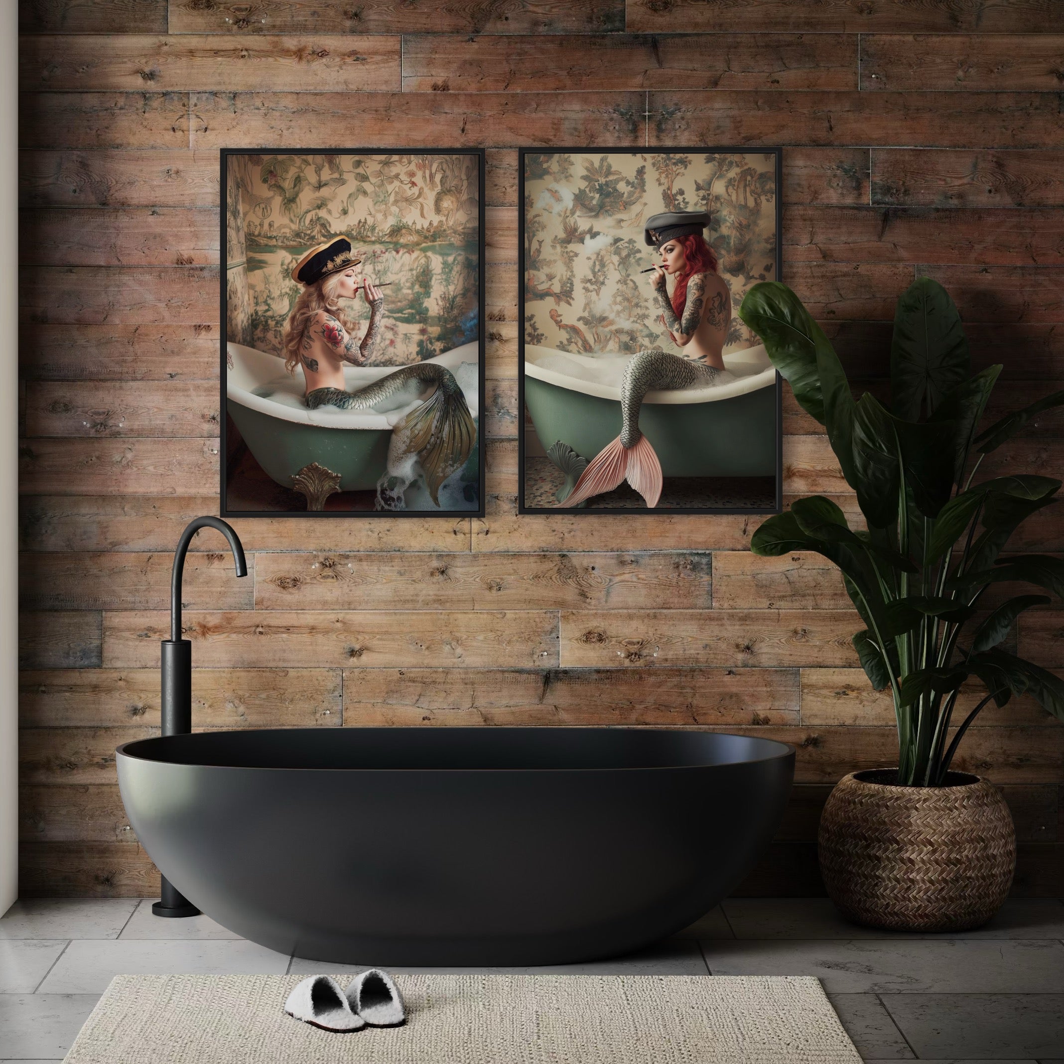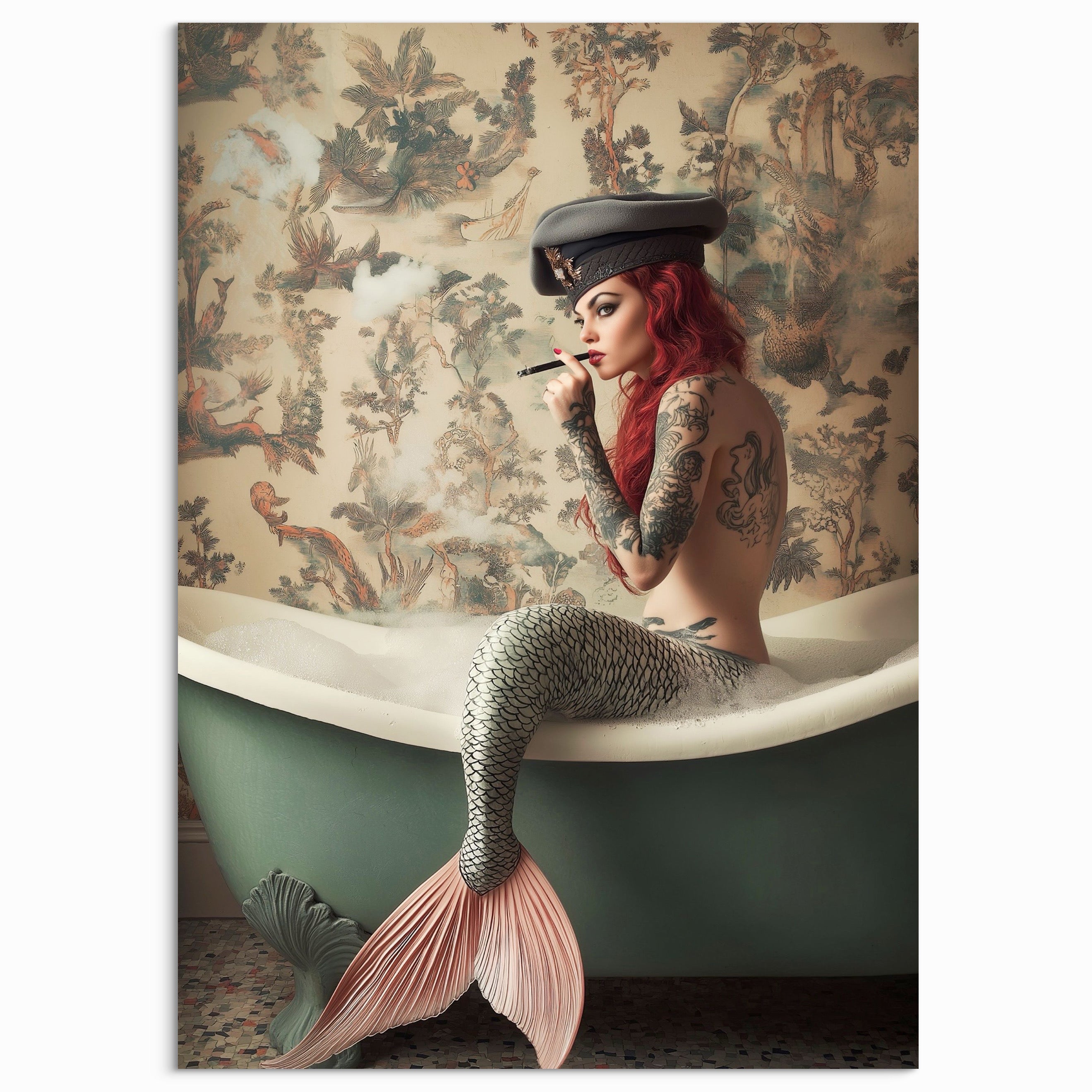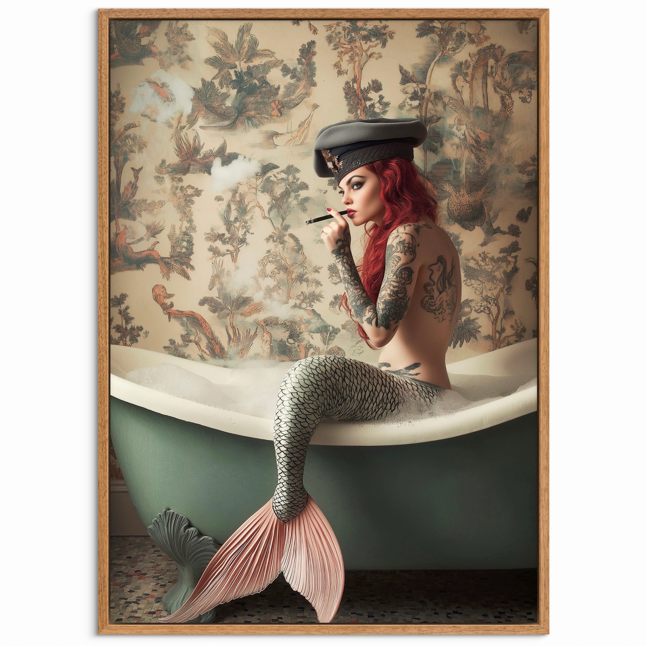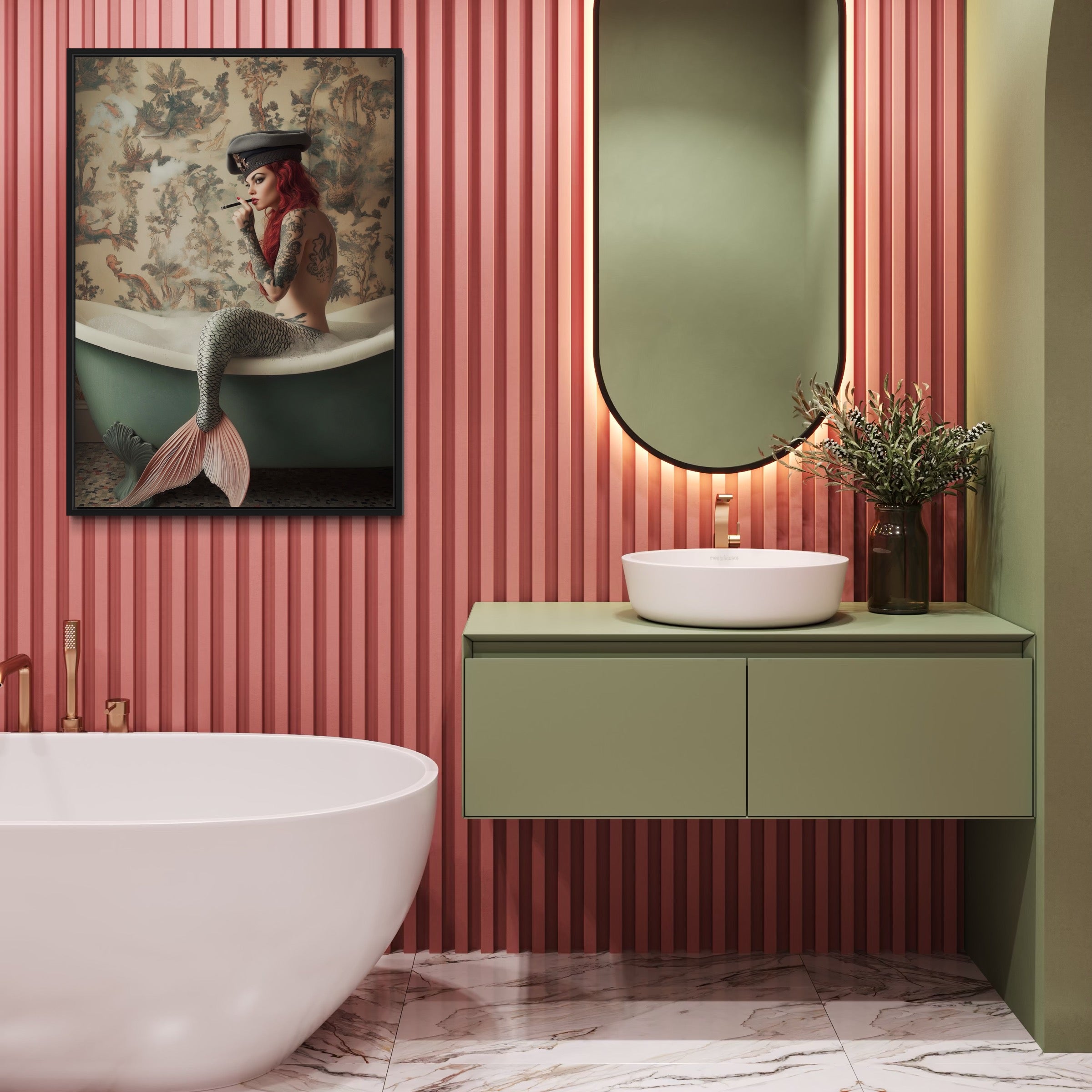 “Rose Ink & Rebellion” captures a captivating red-haired mermaid in a surreal mix of softness and strength. Seated confidently on the edge of a vintage tub, her pink-toned tail and detailed tattoos stand out against the muted, floral wallpaper behind her. With a bold gaze and a wisp of smoke, this piece feels like a cinematic still—effortlessly cool, stylish, and full of untold stories. A striking choice for interiors with attitude.