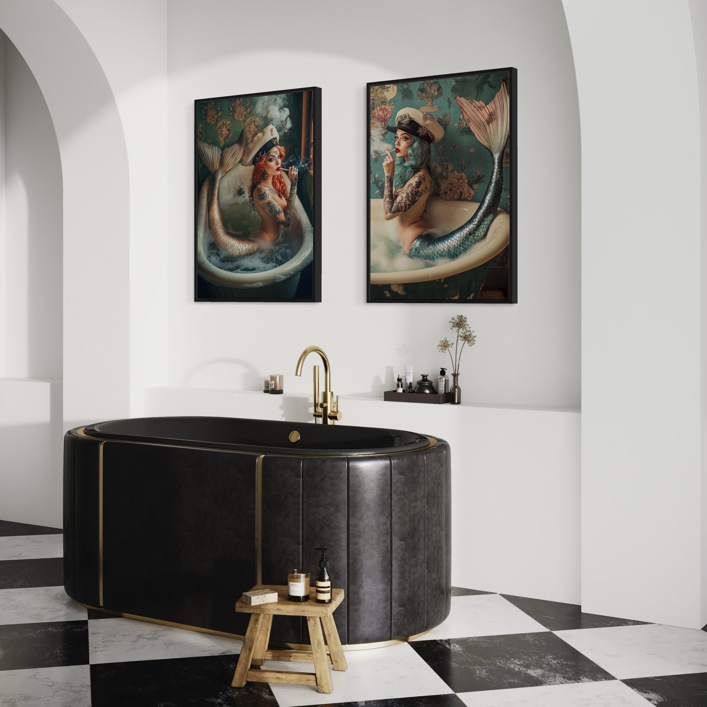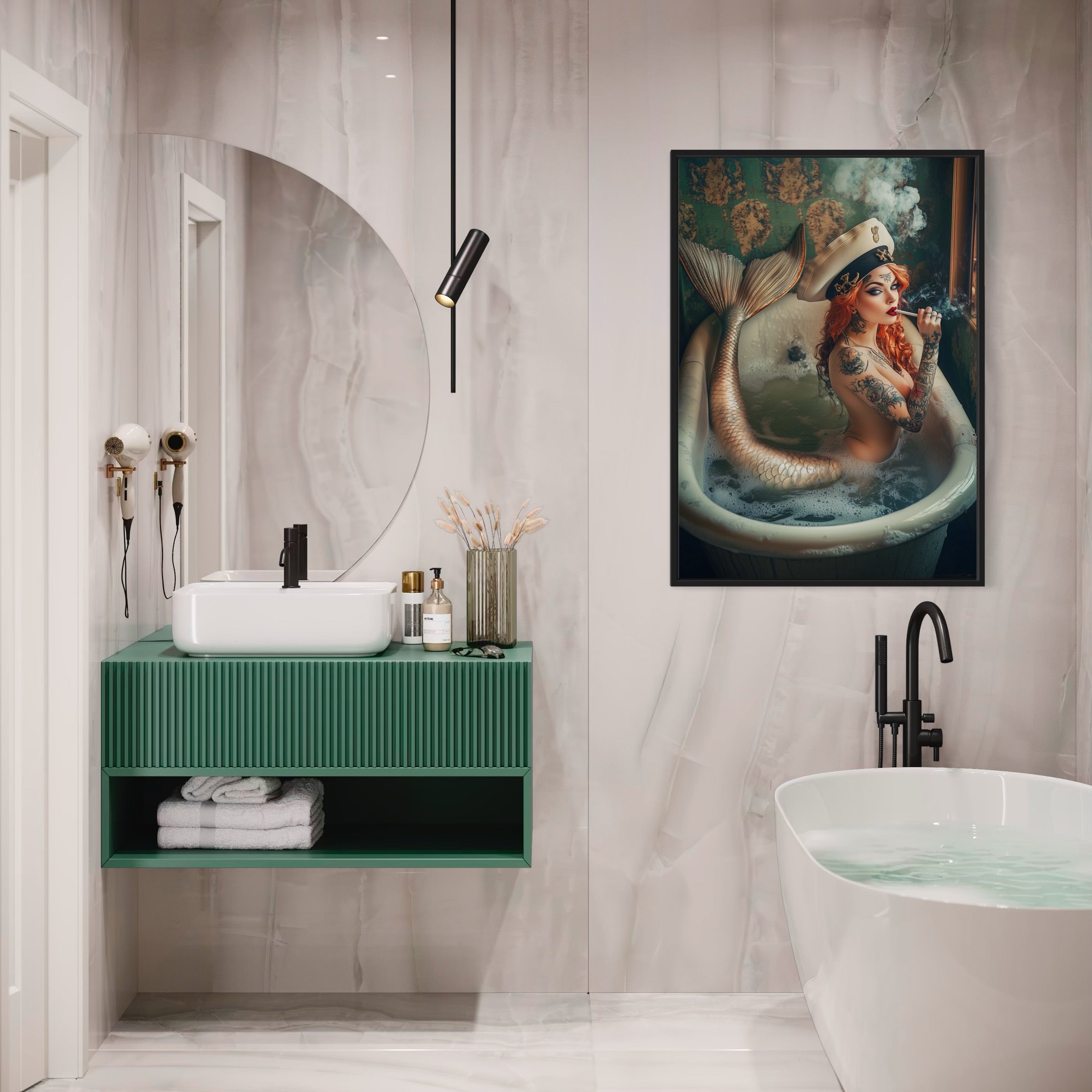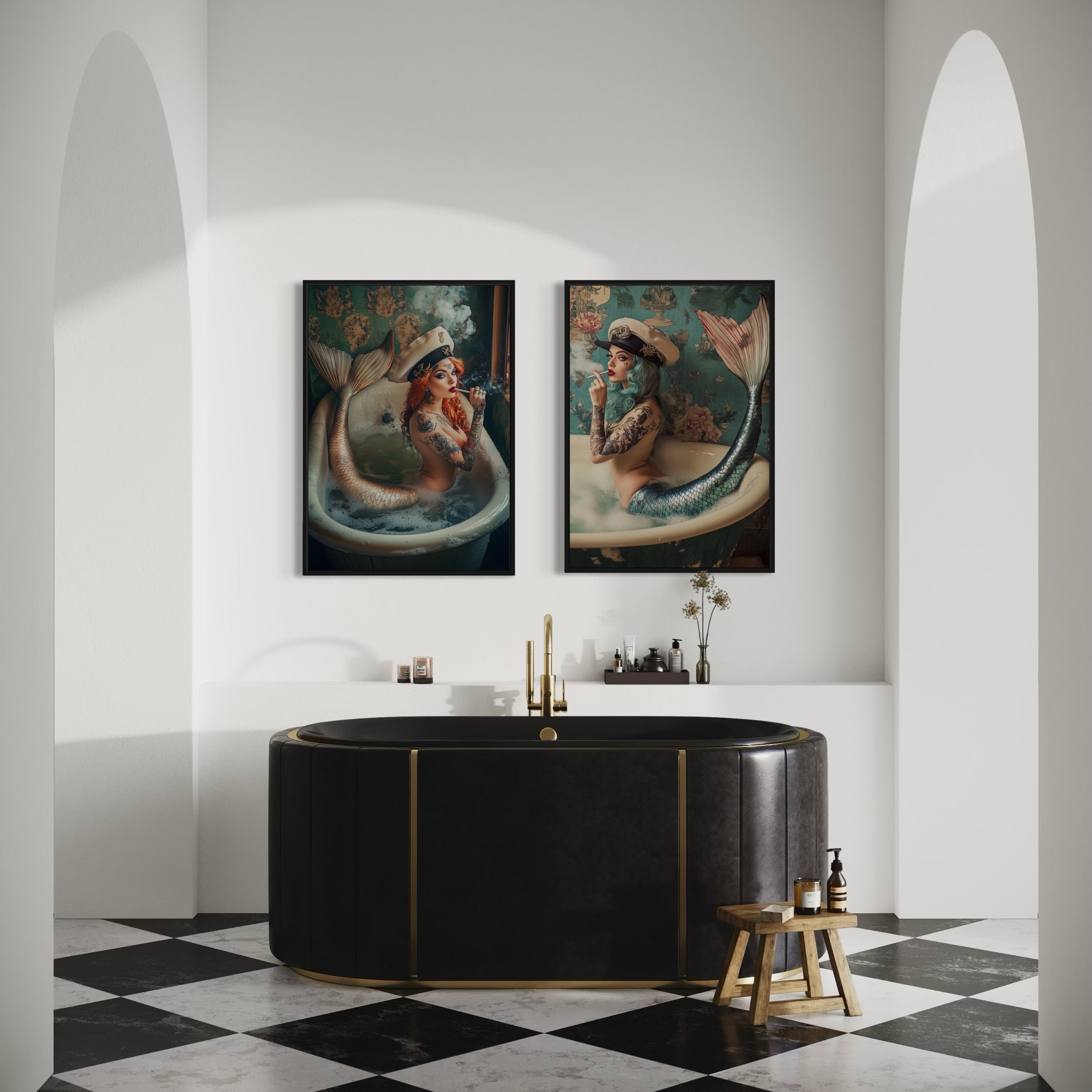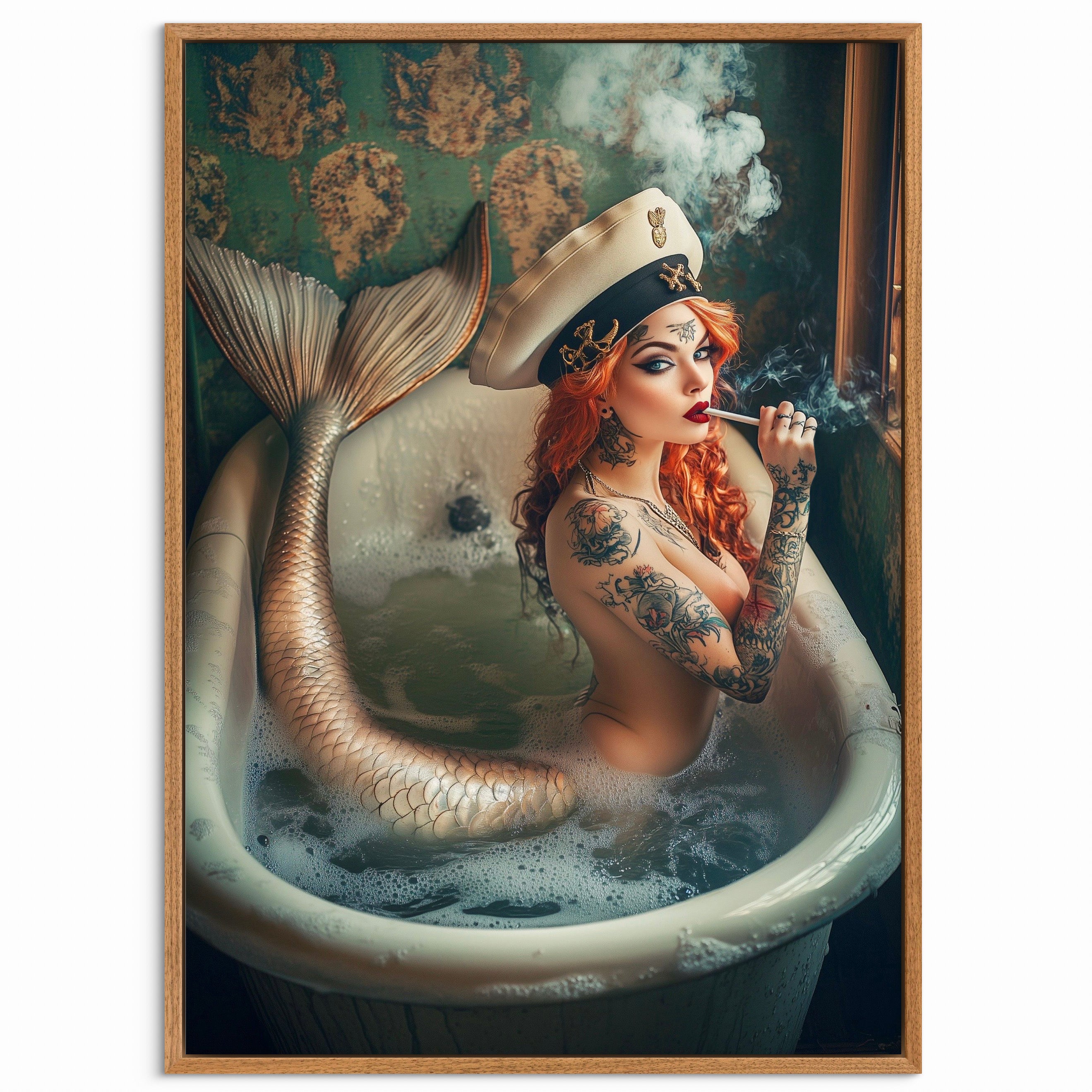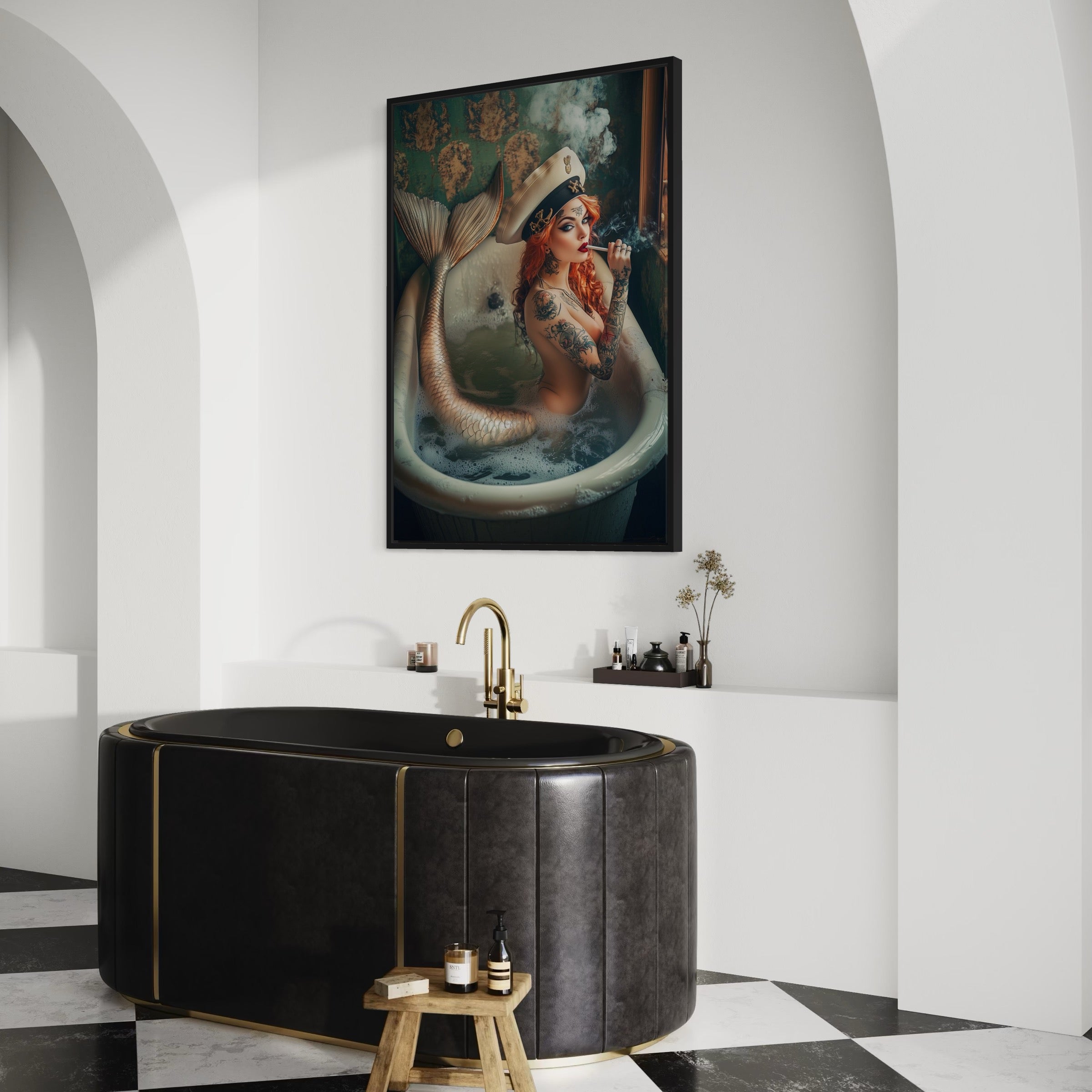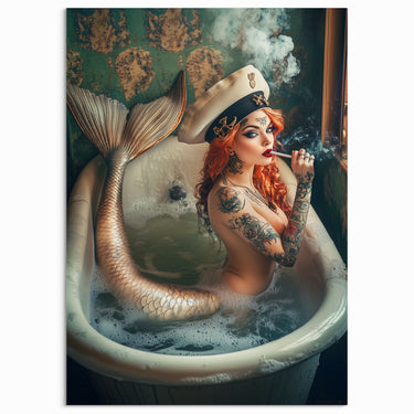Commanding attention with her fiery hair and inked skin, “Siren in Command” reimagines the classic mermaid with attitude and edge. Set in an antique bathtub against a richly textured backdrop, this artwork blends fantasy and rebellion in a beautifully styled scene. Her commanding presence and gaze, paired with the naval hat and rising smoke, offer a narrative of power, independence and myth turned modern. A captivating choice for eclectic spaces that embrace bold expression.