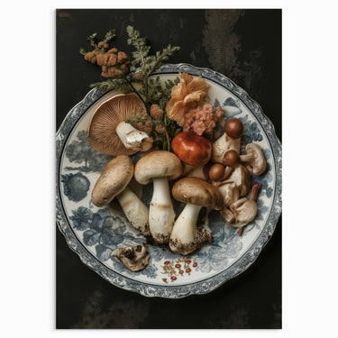 “Culinary Forager’s Delight” captures an exquisite arrangement of fresh mushrooms and botanical accents on an ornate plate. The earthy tones and intricate details bring a touch of nature’s elegance to your kitchen or dining space. This composition showcases a variety of fungi, highlighting their diverse textures and shapes against a dark background, creating a captivating and rustic aesthetic.