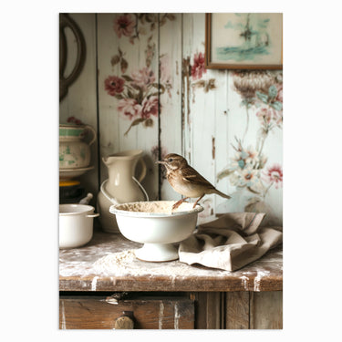 In a rustic kitchen setting, a sparrow stands proudly in a bowl of flour, bringing a playful charm to the art of baking. This nostalgic scene, filled with soft pastels and weathered textures, captures the innocence of a countryside moment, perfect for any kitchen or dining space.