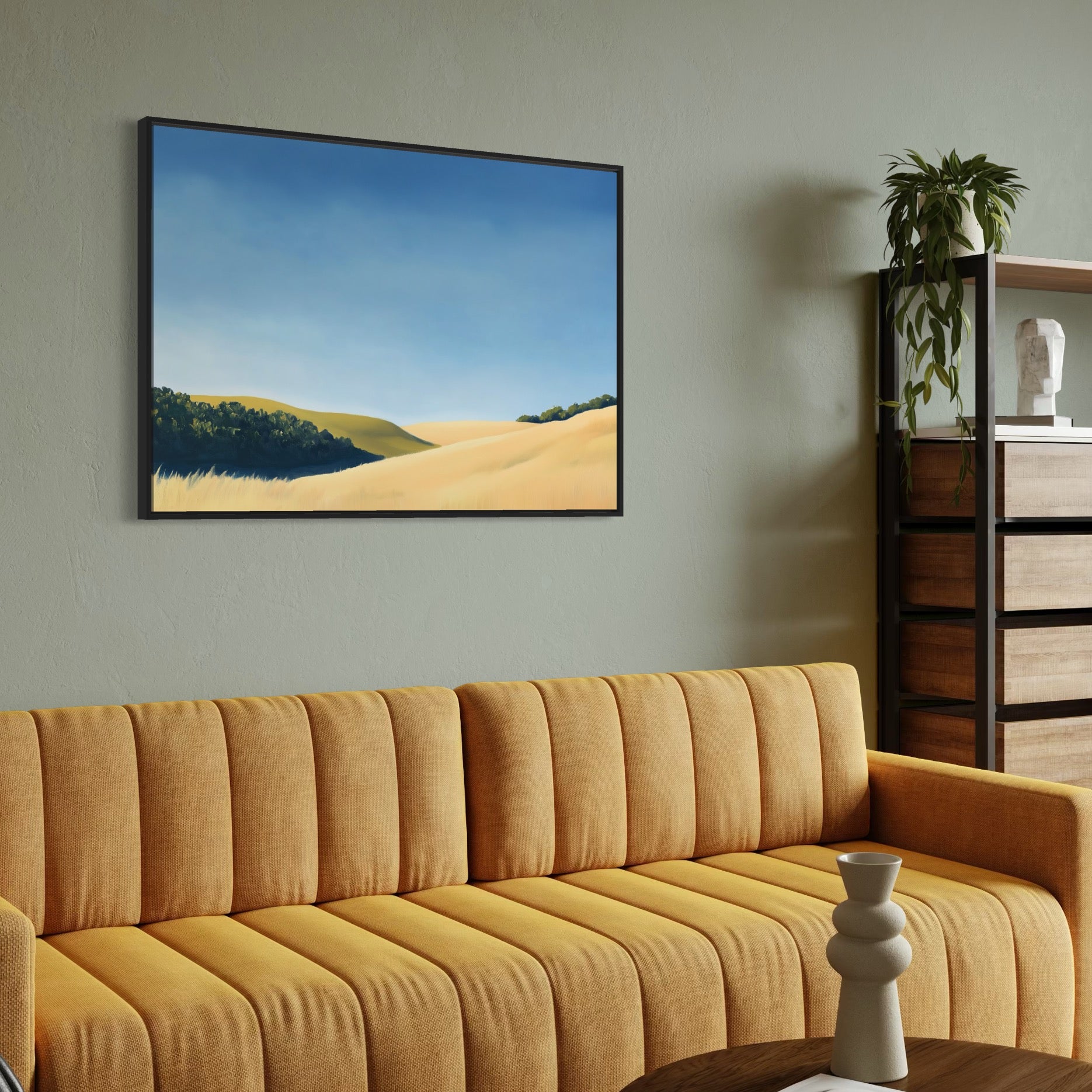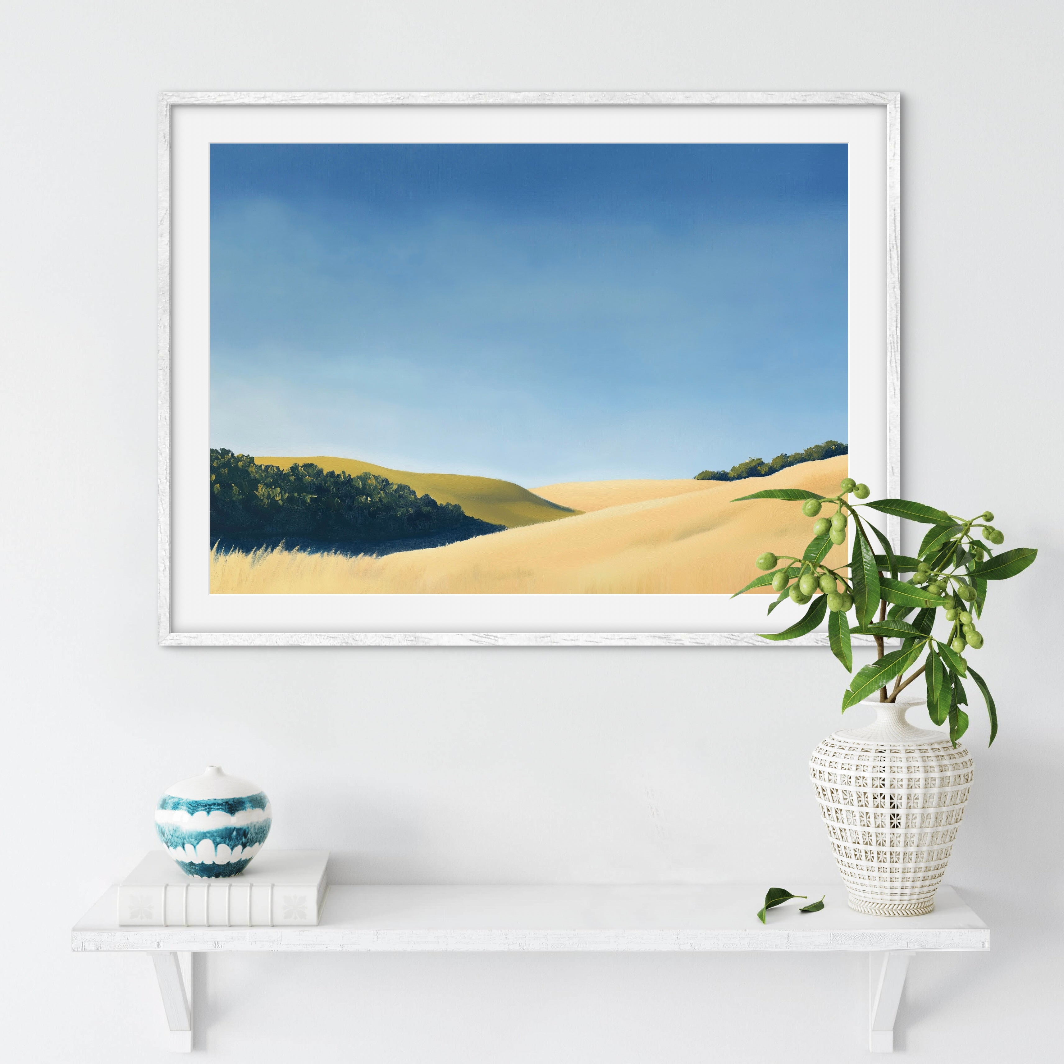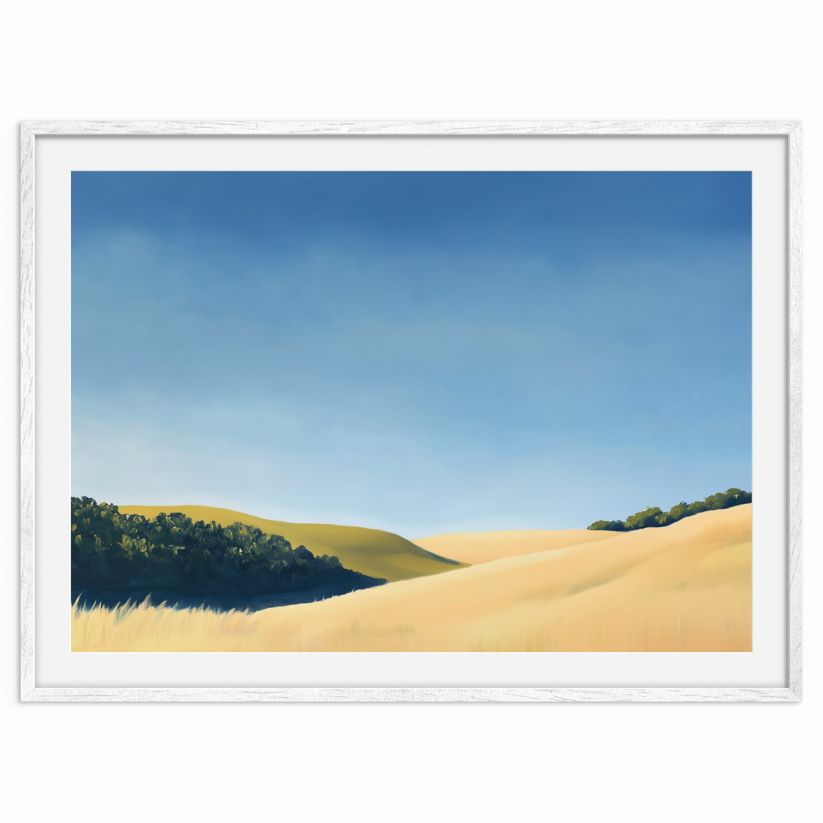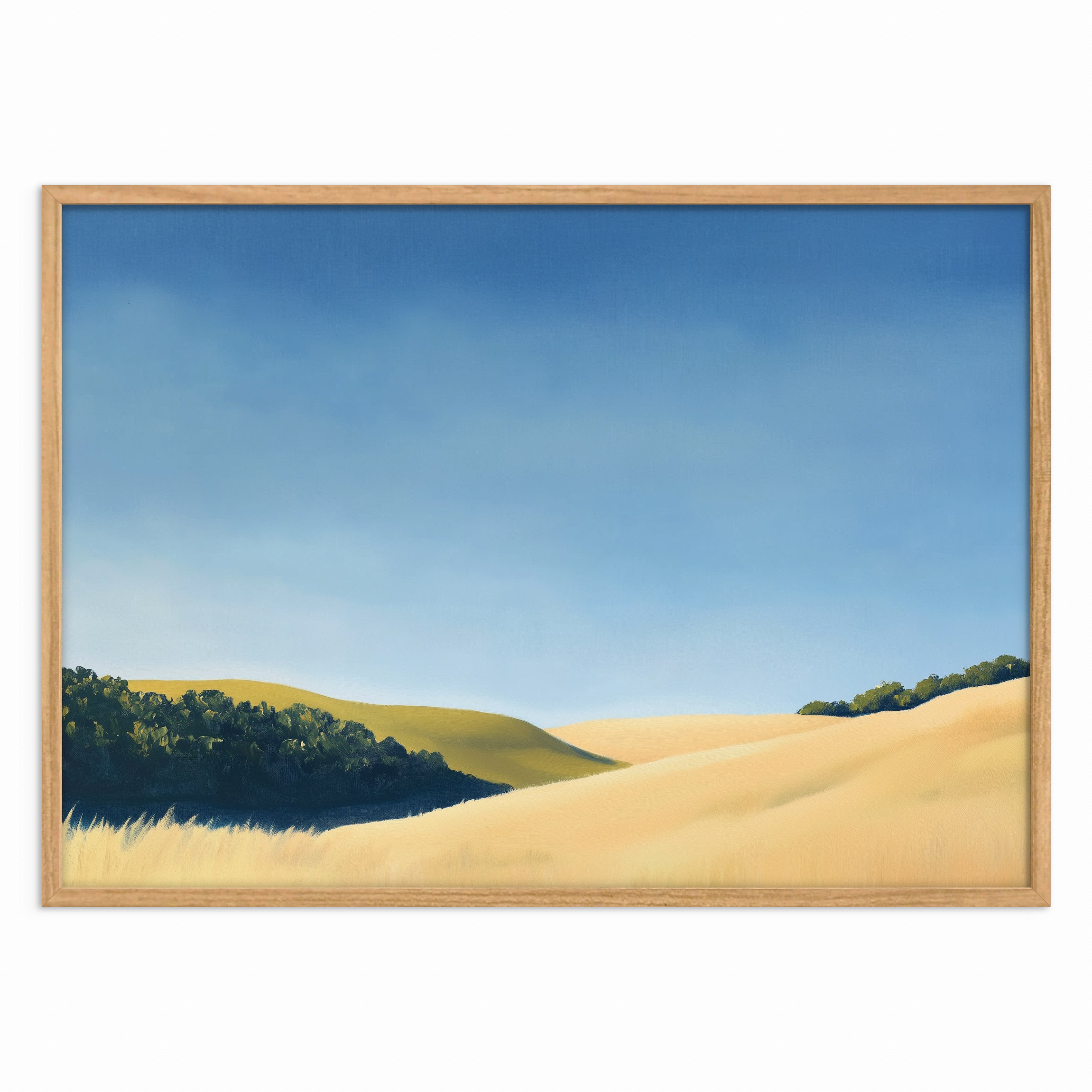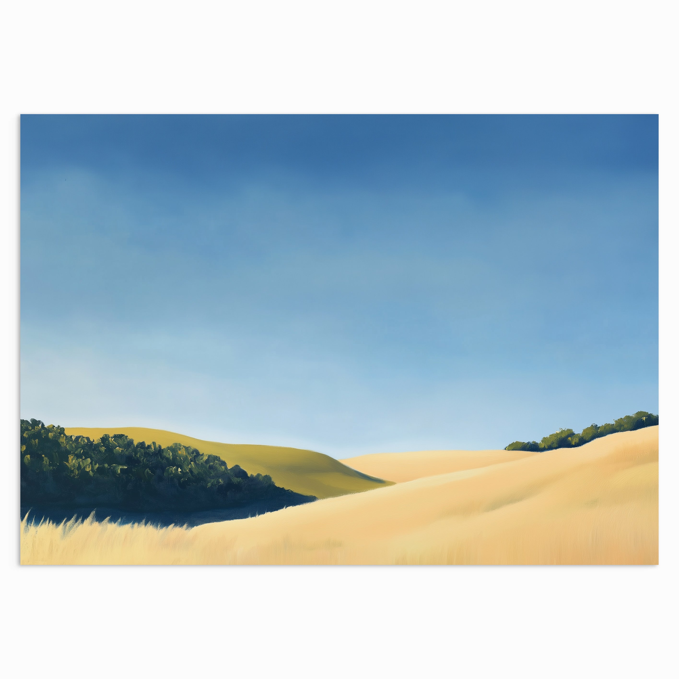 Let your gaze drift over golden hills bathed in soft morning light with “Fields of Quiet Light.” This gentle landscape captures the serenity of untouched grasslands beneath a wide, calming sky. Hints of shadow and distant tree lines add depth and grounding to the scene, making it a beautiful piece for anyone seeking warmth, stillness, and understated beauty in their space.
