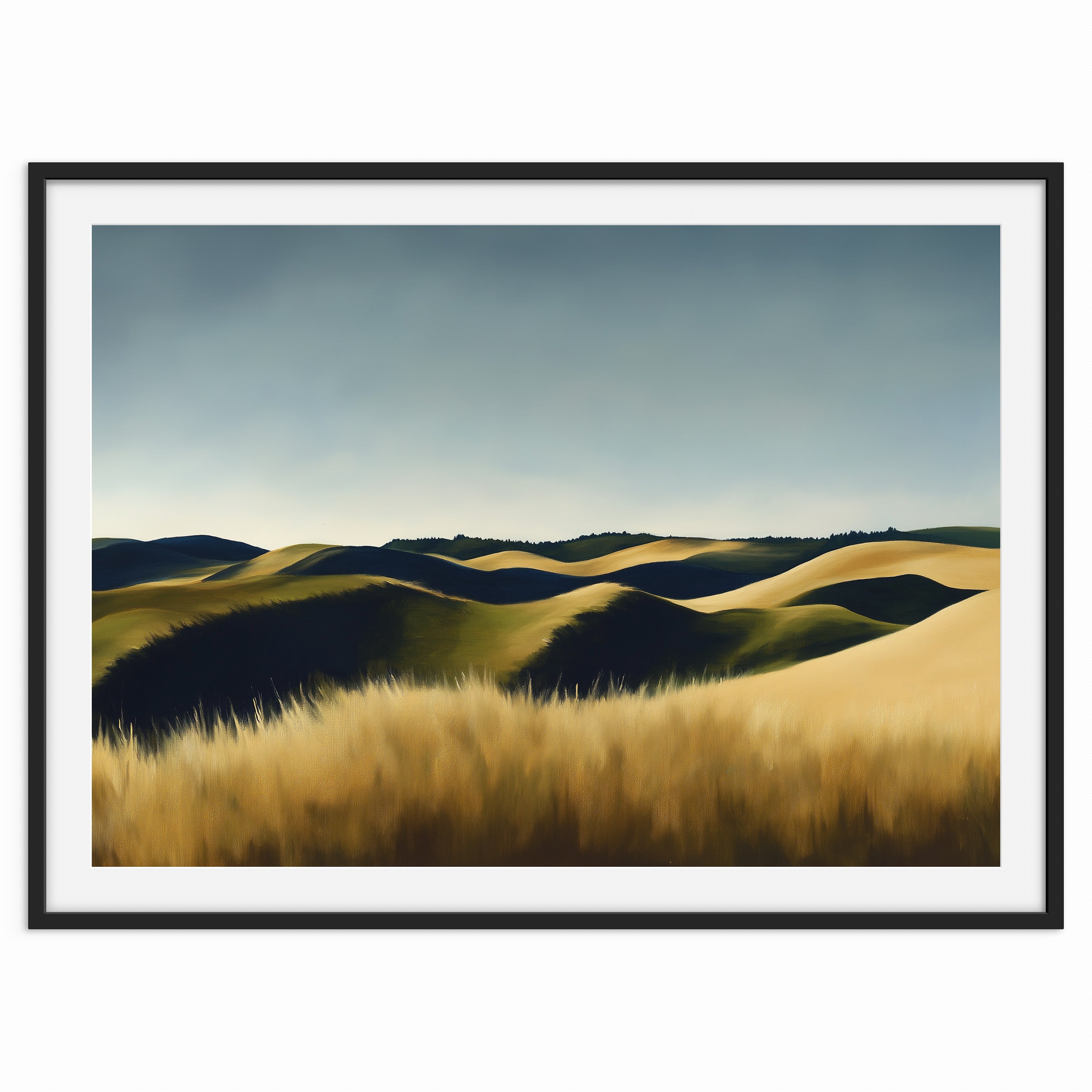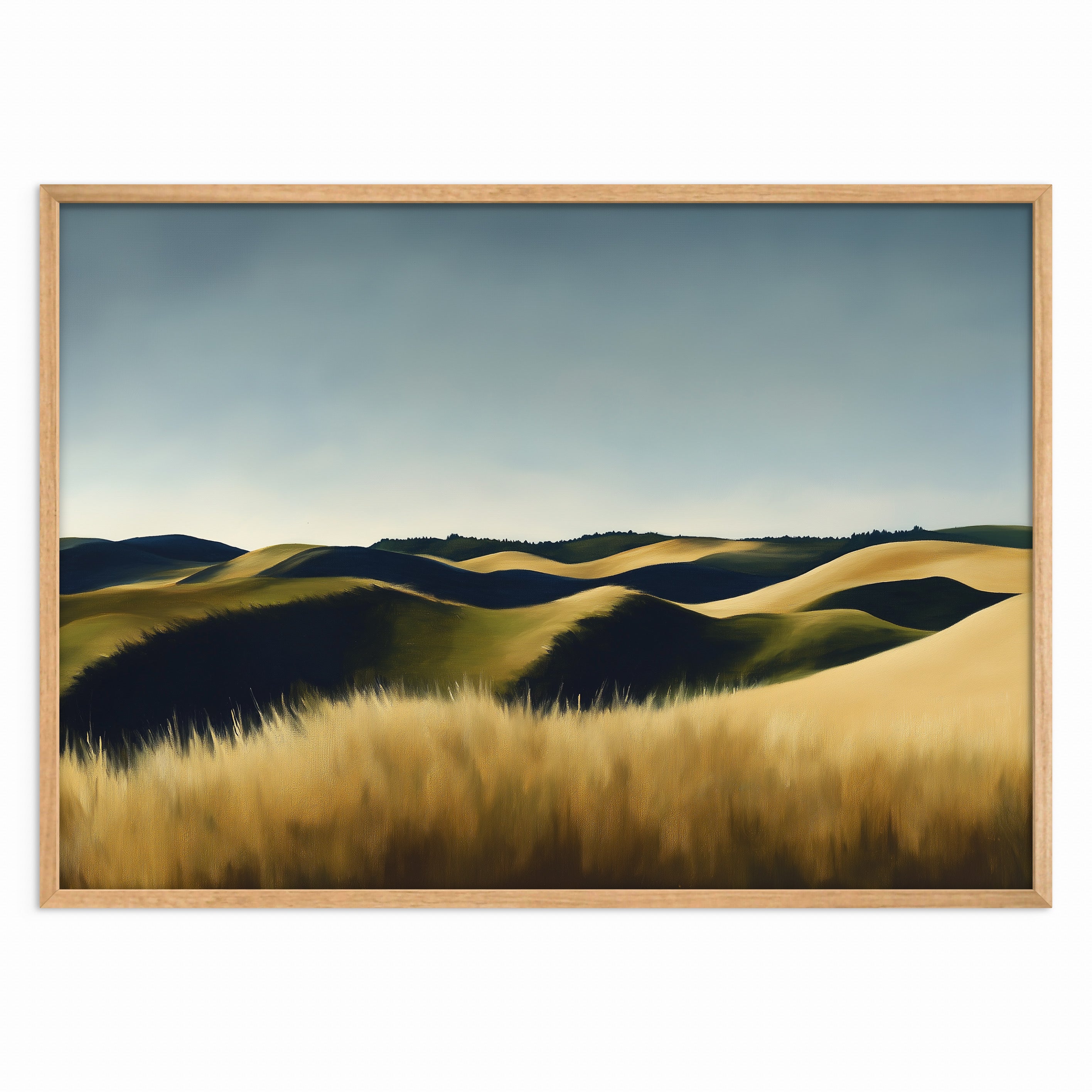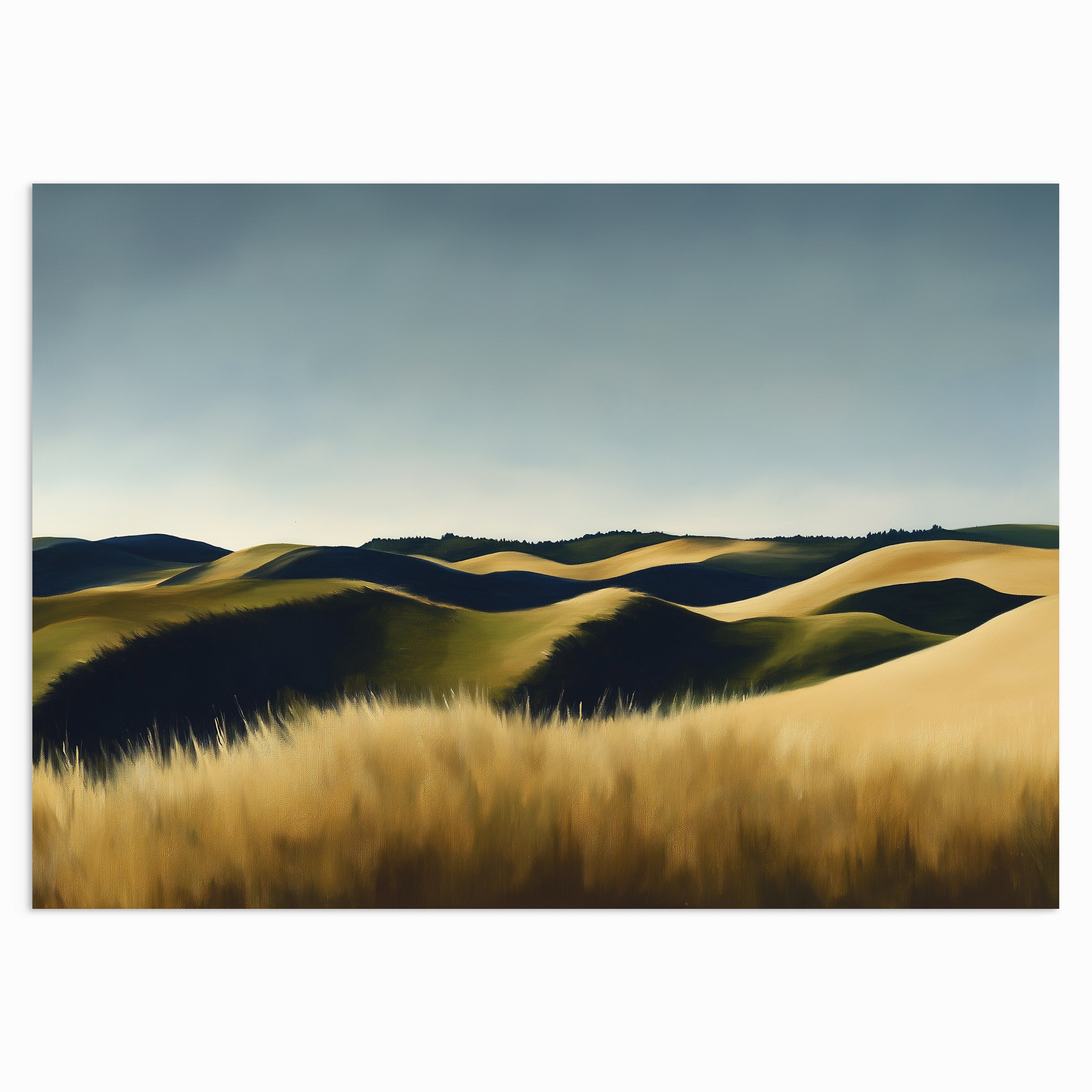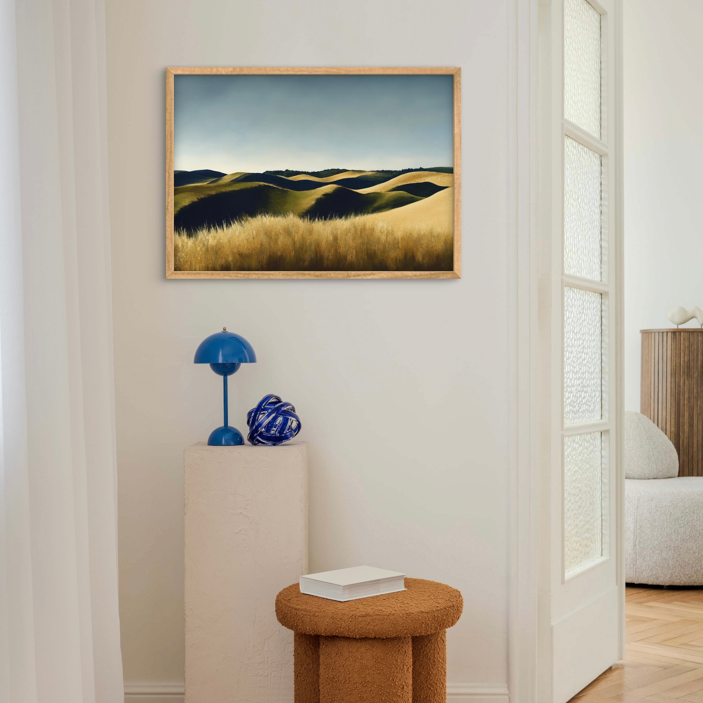 “Whispers Over the Ridge” is a sweeping view of sun-drenched hills where light and shadow dance across the landscape. The golden grasses in the foreground give way to undulating slopes, bathed in quiet light beneath a vast blue sky. It’s a serene statement piece that speaks of openness, calm, and contemplation.