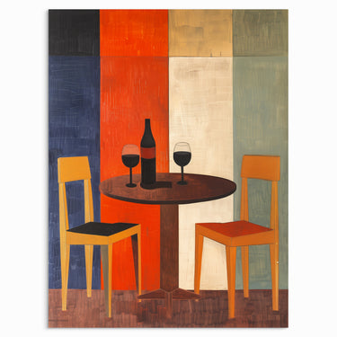 Step into an intimate moment with “Evening Wine,” a striking print that captures the essence of quiet conversation and relaxation. The bold blocks of color contrast with the simplicity of the table setting, highlighting the warmth of shared moments. Perfect for any space that invites gathering, reflection, or a touch of sophistication.