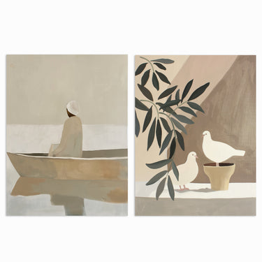 The “Tranquil Moments Set” captures the serene and peaceful beauty of quiet reflections and gentle companionship. This set features two minimalist compositions that evoke a sense of calm and simplicity, making them perfect for adding a touch of tranquility to your living space. The neutral tones and gentle themes harmonize effortlessly, offering a refined and soothing aesthetic that enhances any room’s atmosphere.