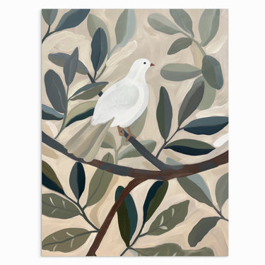 “Tranquil Perch” depicts a solitary white bird resting peacefully on a leafy branch, surrounded by soft, flowing foliage. The gentle palette and serene composition make this artwork a soothing focal point in any room, perfect for those who seek calm and balance in their living spaces.