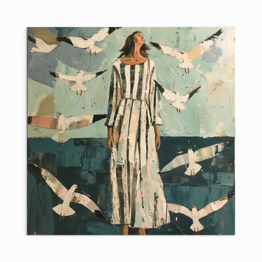 “Wings of Freedom” captures a moment of serene liberation as a woman stands tall, surrounded by seagulls in flight. The cool tones of the sea and sky contrast beautifully with her striped dress, symbolising the convergence of nature and human spirit. This artwork evokes a sense of peaceful empowerment, perfect for those who cherish the freedom to soar. Ideal for adding a touch of movement and emotion to your living space, it reminds us of the endless possibilities that lie ahead.