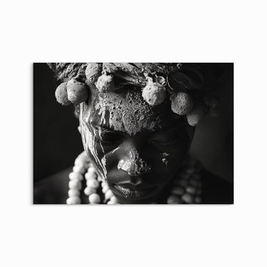 This striking black-and-white print captures a powerful moment of introspection. The subject, adorned in traditional attire, with the ceremonial paint creating a tactile texture, invites the viewer into a world of silent contemplation. The soft lighting accentuates the intricate details of the beads and paint, creating a deeply emotive piece that speaks to the spiritual depth and cultural significance of this timeless moment.