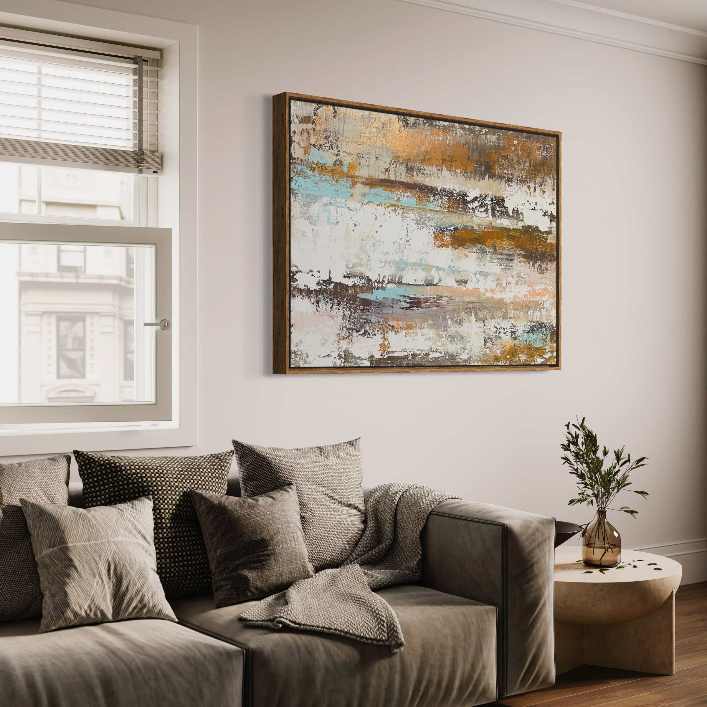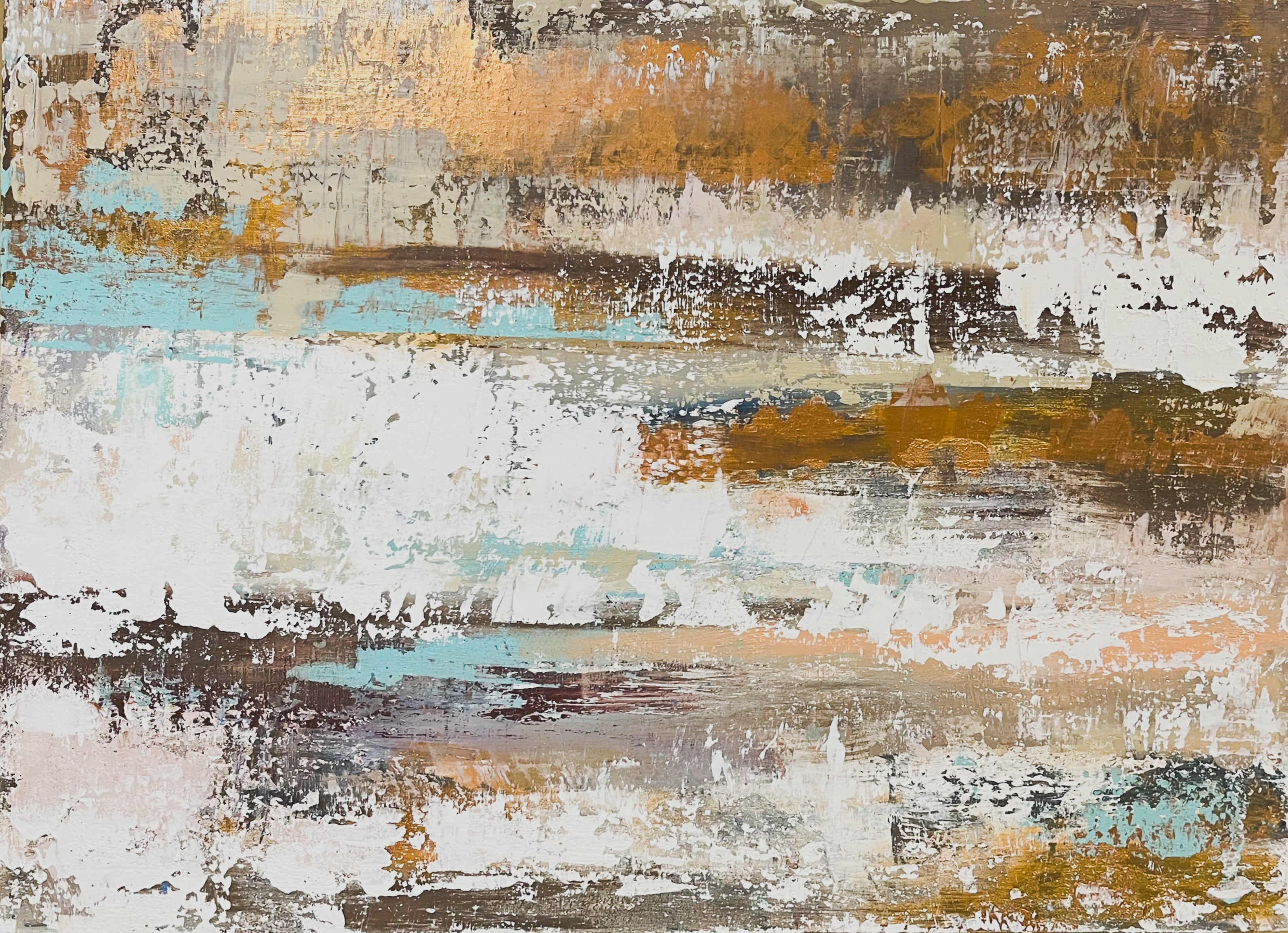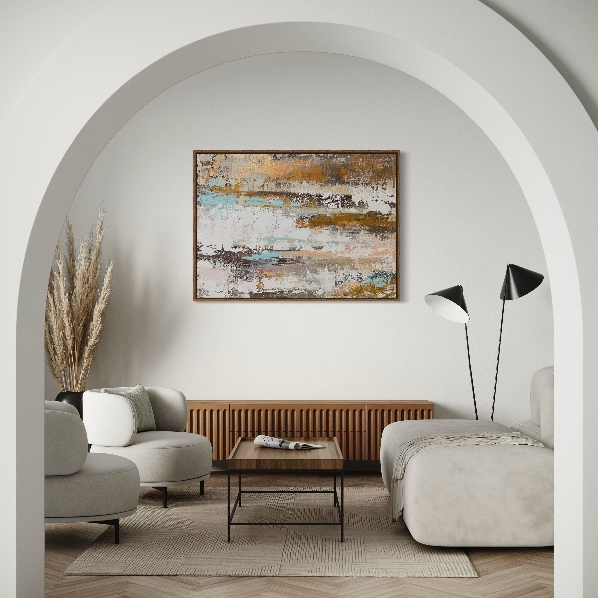 Whispers of Earthlight by MOWZU is a serene, richly textured abstract painting that feels like a quiet conversation between land, light, and memory. Layers of soft white, earthy taupe, burnished gold, and misty aqua flow across the canvas in organic, weathered strokes—evoking the beauty of timeworn landscapes and sun-drenched horizons.