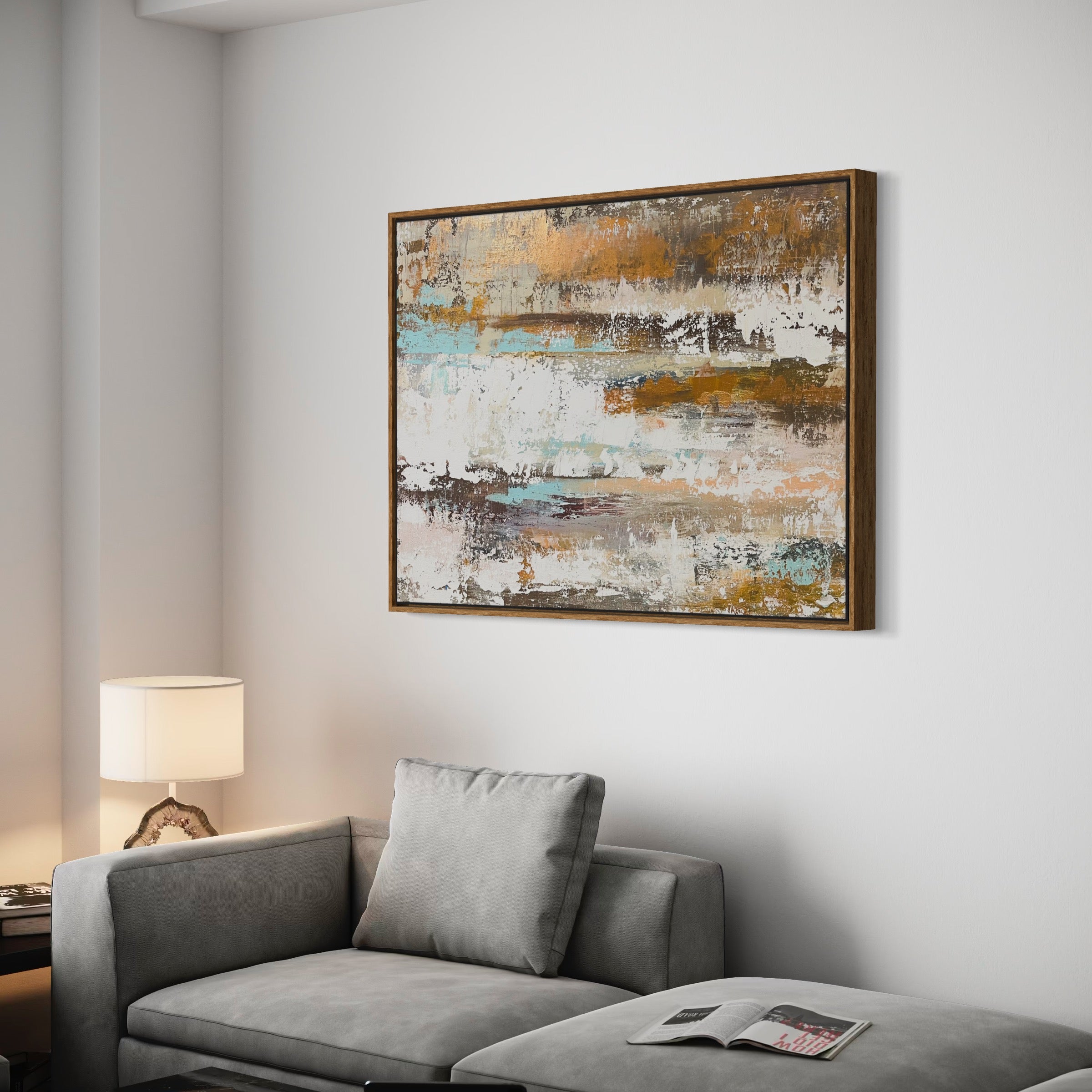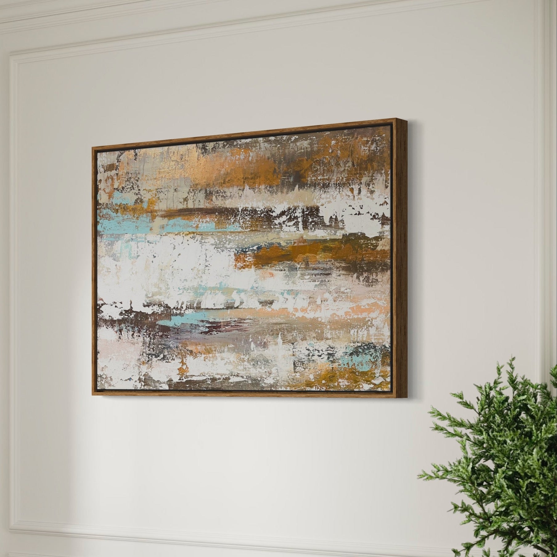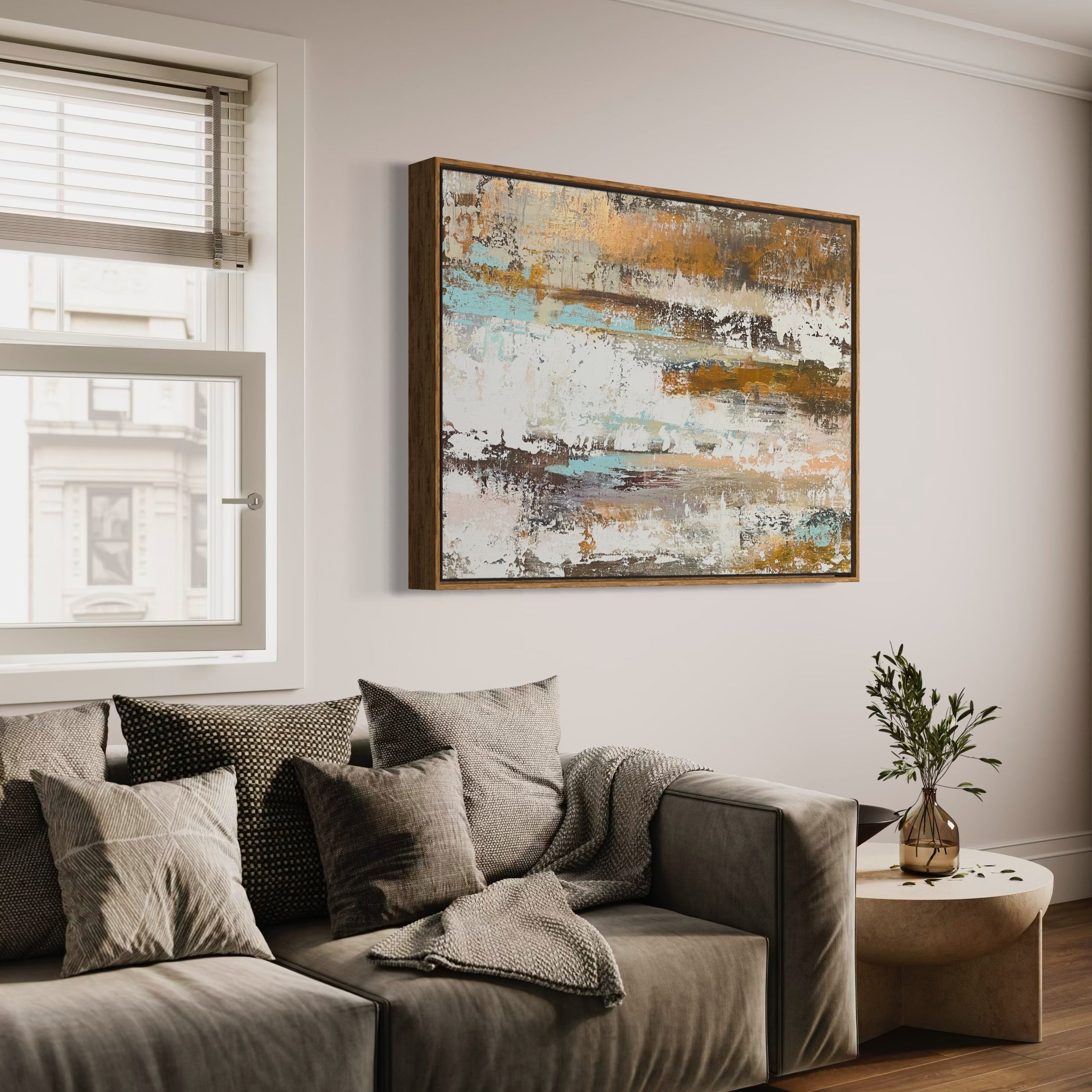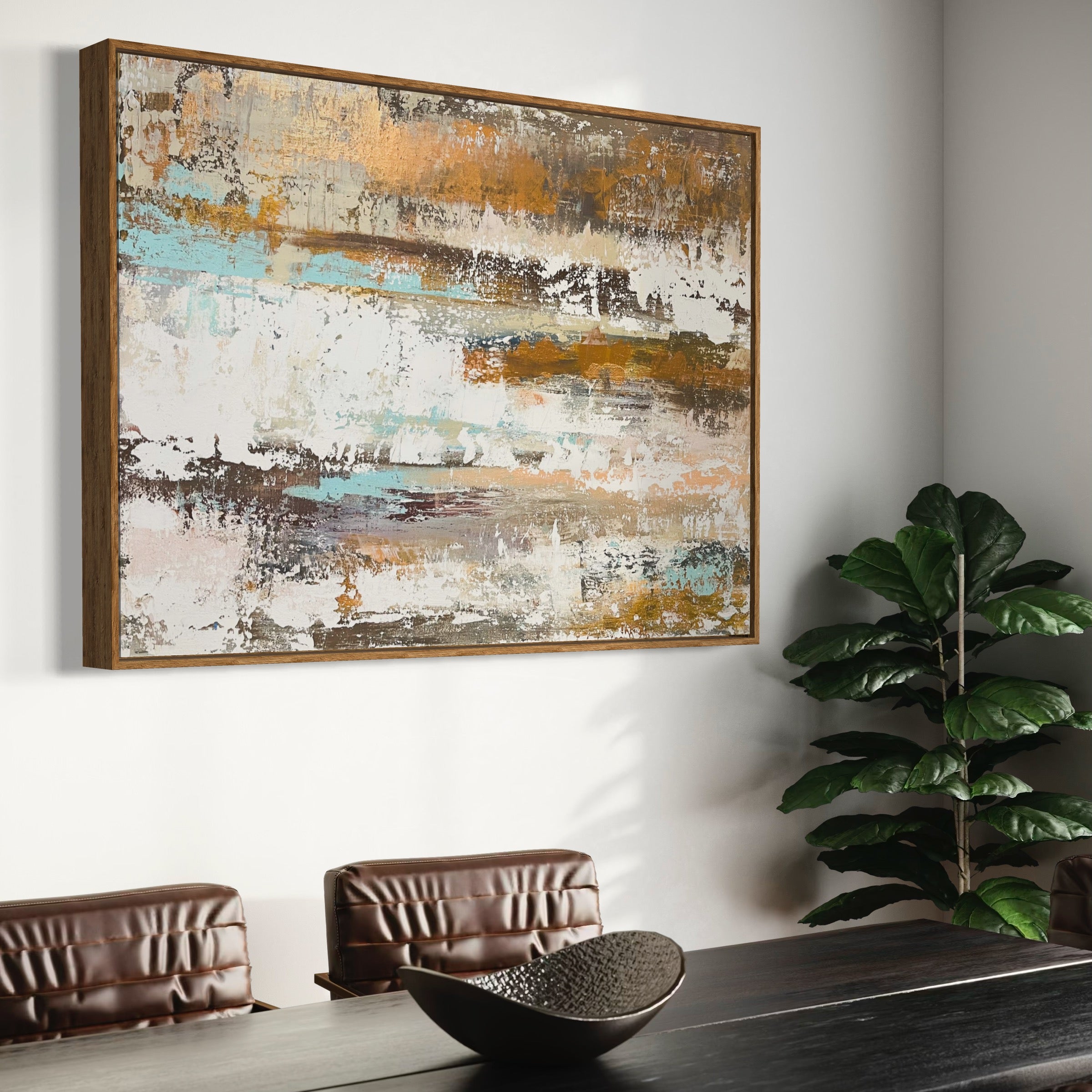 Whispers of Earthlight by MOWZU is a serene, richly textured abstract painting that feels like a quiet conversation between land, light, and memory. Layers of soft white, earthy taupe, burnished gold, and misty aqua flow across the canvas in organic, weathered strokes—evoking the beauty of timeworn landscapes and sun-drenched horizons.