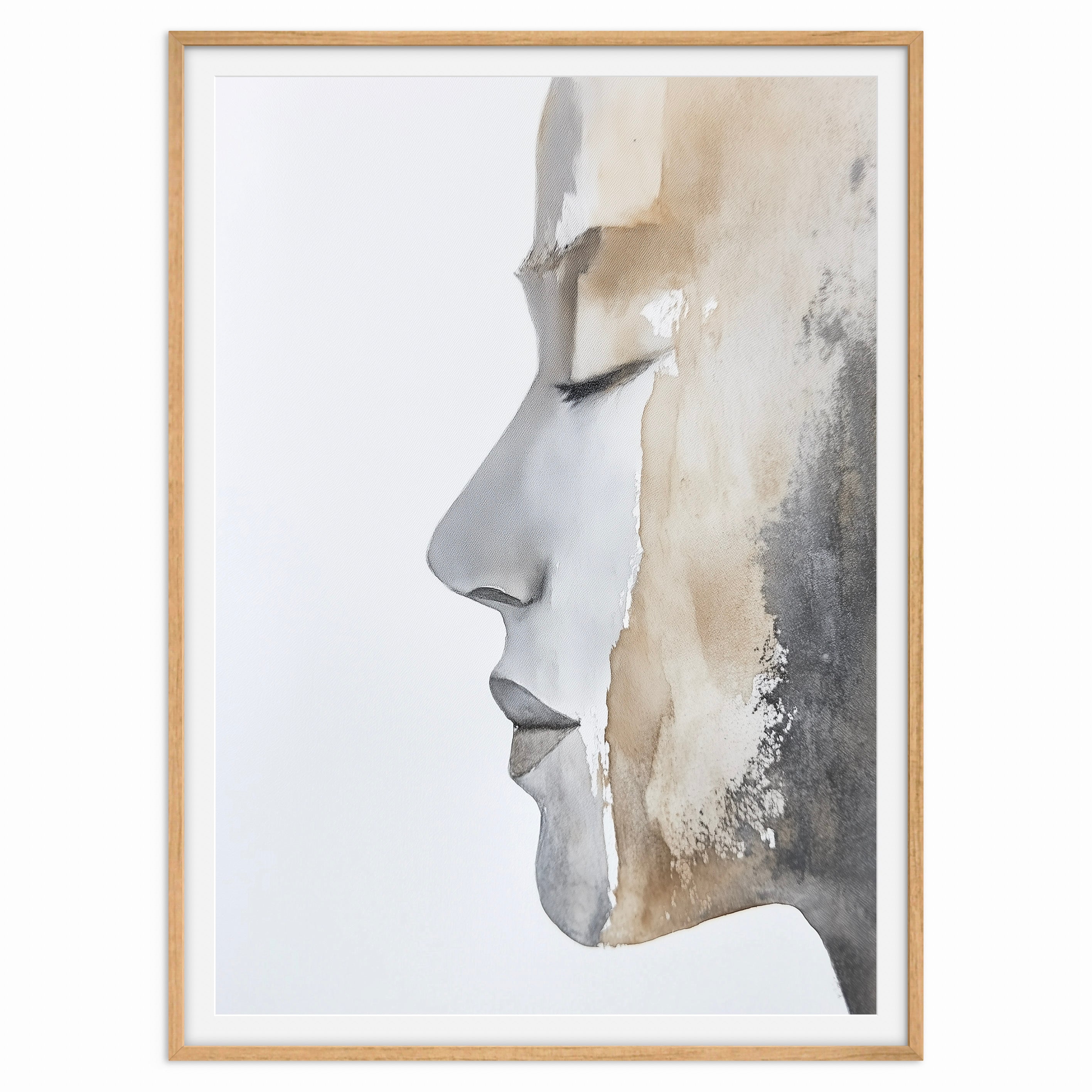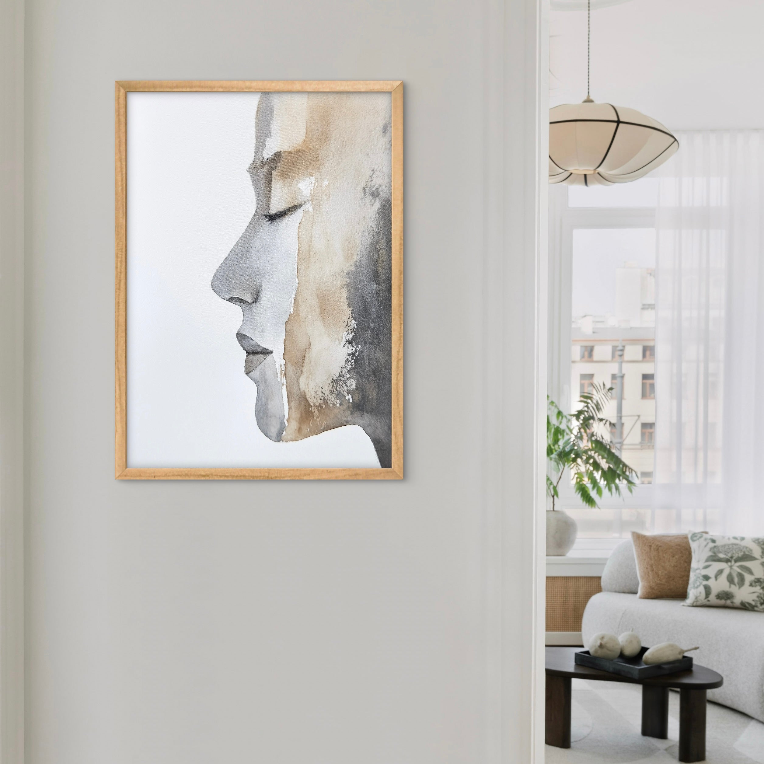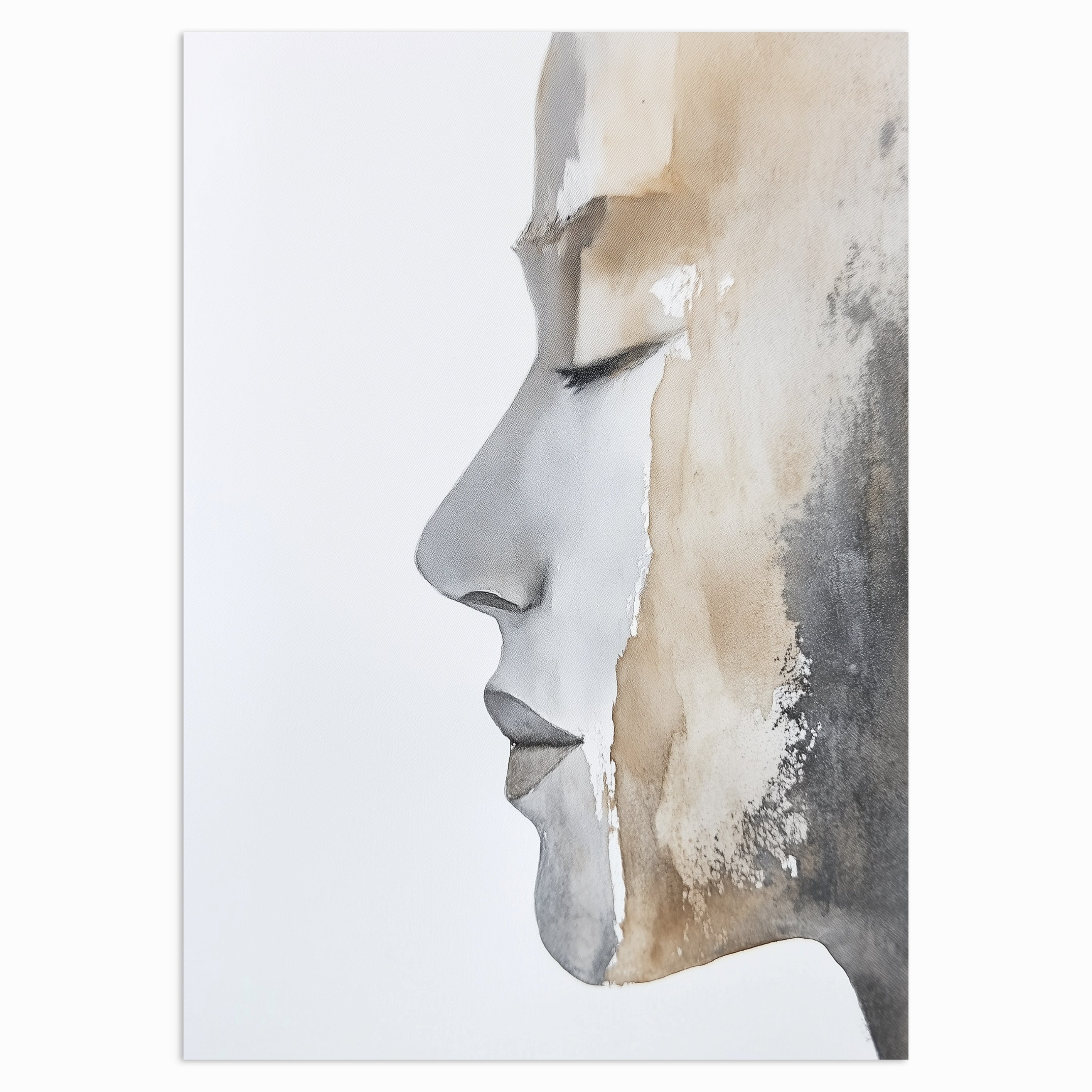 Step into the serene solitude of "Ashen Veil," a minimalist portrait that captures the quiet strength of introspection. Rendered in gentle washes of taupe, grey, and charcoal, this side-profile composition blends realism with abstraction, evoking a dreamlike calm. The soft textures and subtle facial contours offer a modern and poetic presence, ideal for serene interior spaces.