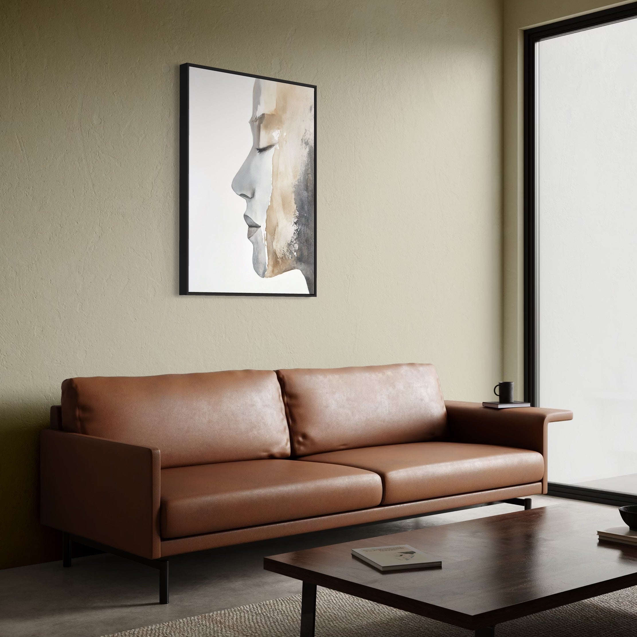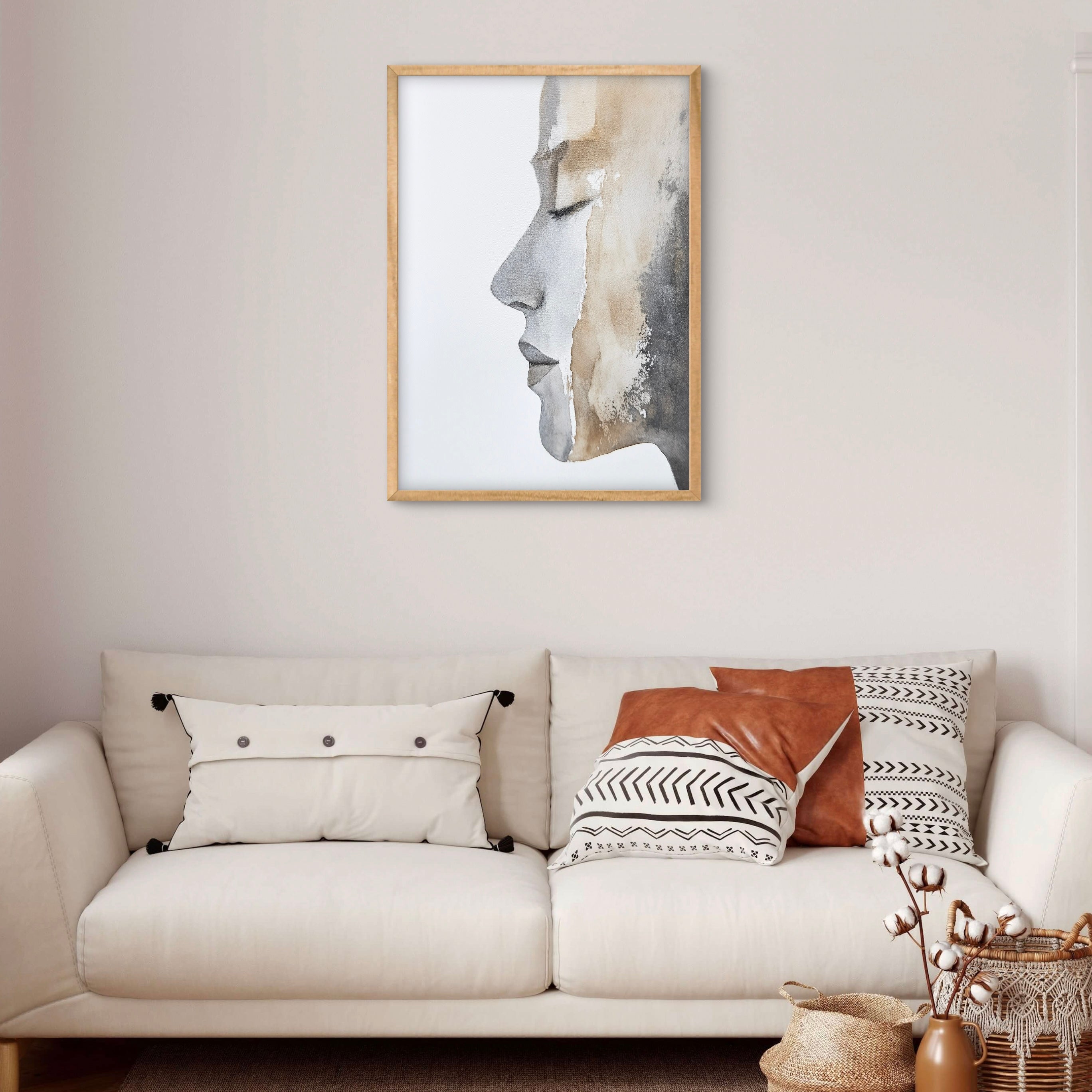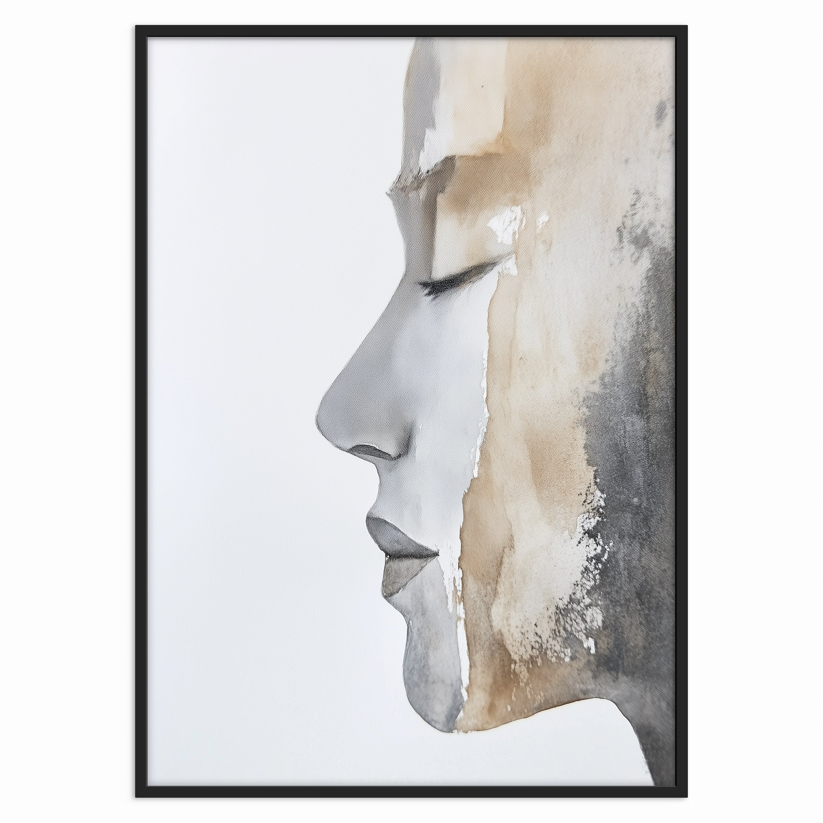Step into the serene solitude of "Ashen Veil," a minimalist portrait that captures the quiet strength of introspection. Rendered in gentle washes of taupe, grey, and charcoal, this side-profile composition blends realism with abstraction, evoking a dreamlike calm. The soft textures and subtle facial contours offer a modern and poetic presence, ideal for serene interior spaces.
