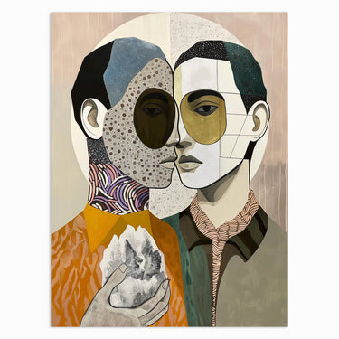 This striking artwork, “Lovers in Orbit,” captures the cosmic bond between two figures as they navigate the depths of love and connection. With one half of their faces merged into a shared orbit, the lovers are symbolic of a union that transcends time and space. The intricate textures, vibrant patterns, and the shimmering gem held in one’s hand evoke a sense of deep-rooted connection, growth, and the beauty found in togetherness. Ideal for those looking to bring a sense of romance and celestial wonder into their space.